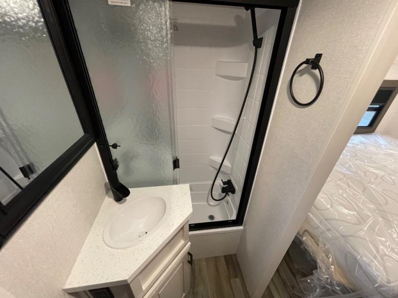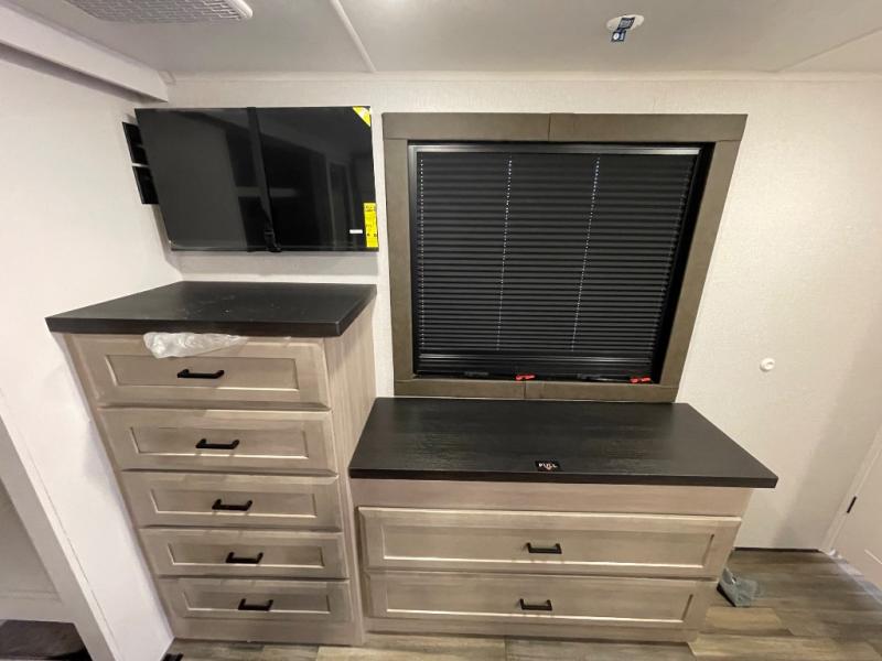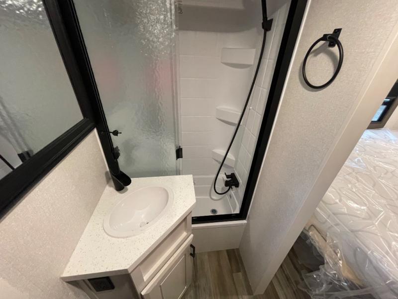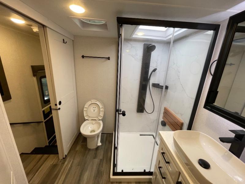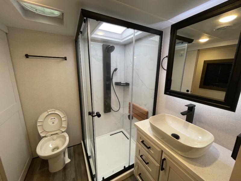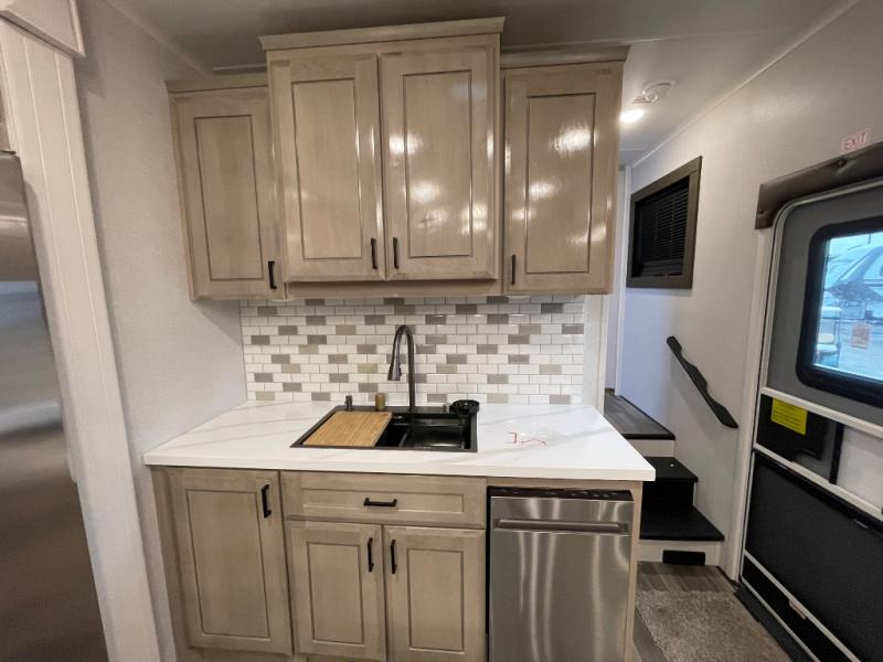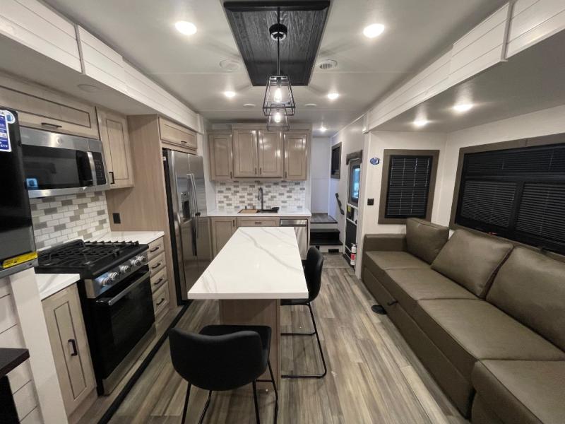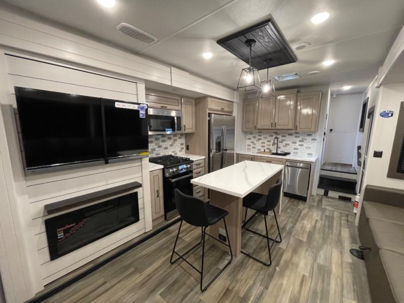 With any Open Range 3X fifth wheel by Highland Ridge, you will enjoy residential luxuries and an exceptional build. The TuffShell construction includes vacuum bonded laminated fiberglass and welded aluminum frames for added strength, and the PVC roofing membrane is ultra durable. You can plan to camp year around or go full-time since there is a mandatory Four Season Package that includes a heated and enclosed underbelly, a 40K BTU high-performance furnace, double insulated baggage doors, and more. The residential features continue on with the mandatory Executive Package with the TravelLINK Smart RV system, Keyed-Alike entry and baggage doors, painted fiberglass front cap with LED lighting, and three 15,000 BTU A/C units with quiet residential return air. Inside, you'll enjoy GE Profile kitchen appliances, sleek square windows with integrated blinds, ceramic subway tile backsplash, a glass shower door, and the list of amenities goes on!
