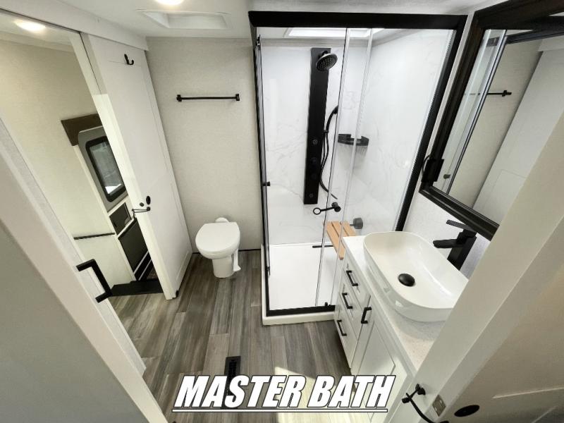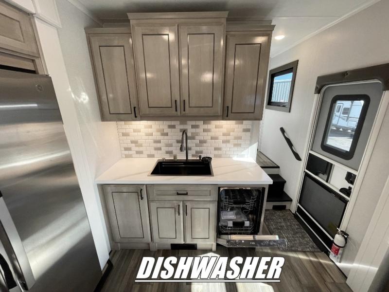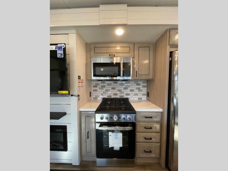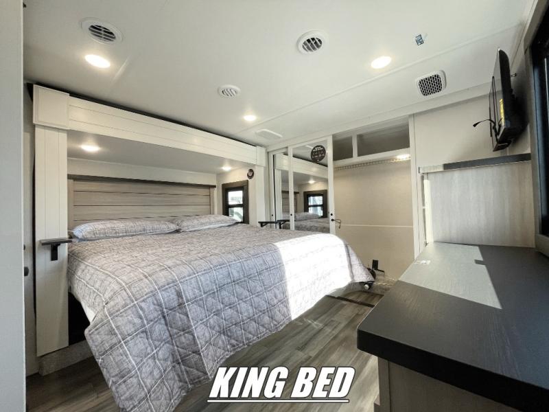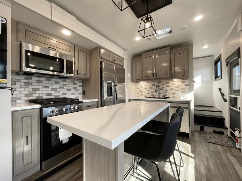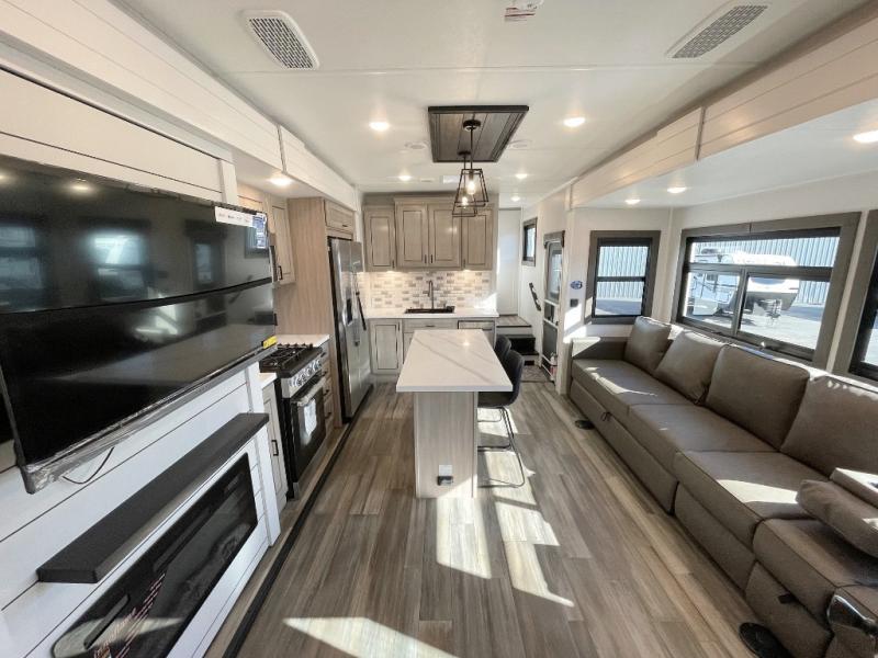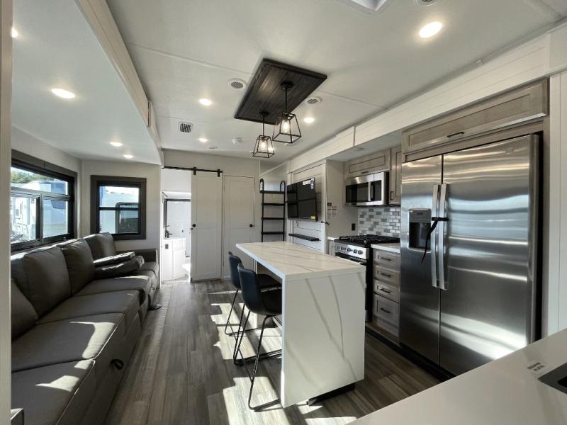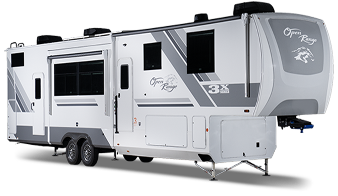 With any Open Range 3X fifth wheel by Open Range RV, you will enjoy residential luxuries and an exceptional build. The TuffShell construction includes vacuum bonded laminated fiberglass and welded aluminum frames for added strength, and the PVC roofing membrane is ultra durable. You can plan to camp year around or go full-time since there is a mandatory Four Season Package that includes a heated and enclosed underbelly, a 40K BTU high-performance furnace, double insulated baggage doors, and more. The residential features continue on with the mandatory Executive Package with the TravelLINK Smart RV system, Keyed-Alike entry and baggage doors, painted fiberglass front cap with LED lighting, and three 15,000 BTU A/C units with quiet residential return air. Inside, you'll enjoy GE kitchen appliances, sleek square windows with integrated blinds, ceramic subway tile backsplash, a glass shower door, and the list of amenities goes on!