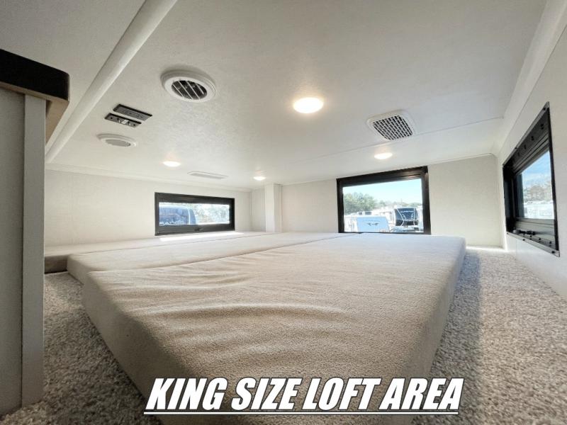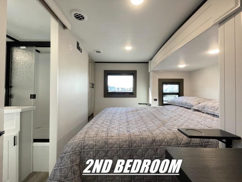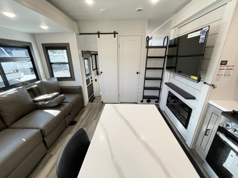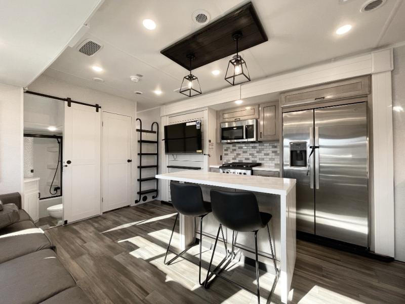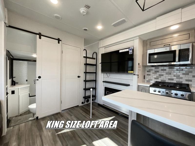 If you enjoy luxury camping or you're looking for a residential fifth wheel to go full-time in, this Open Range 3X is the one! The middle kitchen and living room is made open by the dual opposing slides, and your crew can get comfortable on the mega lounge with two tables. The chef of your group will love cooking on GE free-standing four burner range, or they can use the GE residential microwave to heat up leftovers. The standard dishwasher and central vacuum make cleanup a breeze. A waterfall island with four chairs will provide a place to dine and the hidden pantry behind the swing-out entertainment center can hold snacks galore. There is also a fireplace and smart HDTV to make movie nights cozy. The front master bedroom includes a slide out king bed with a power tilt, two dressers, a large front closet, and a 32" TV to watch shows in bed. You even have your own entrance into the full bath, plus washer and dryer prep if you choose to add those appliances. The rear master bedroom is just as accommodating with a queen bed slide out, a wardrobe and a dresser, plus a second full bath with its own exterior entry door. And the loft above the rear bedroom provides even more sleeping space.