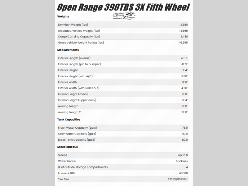 Open Range RV Open Range 3X fifth wheel 390TBS highlights: