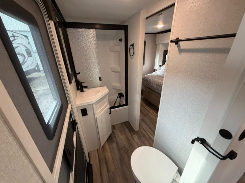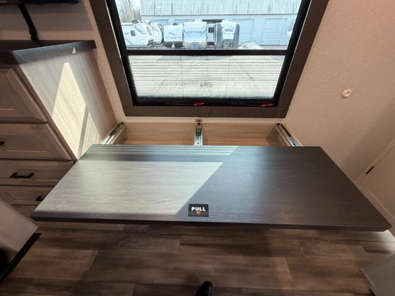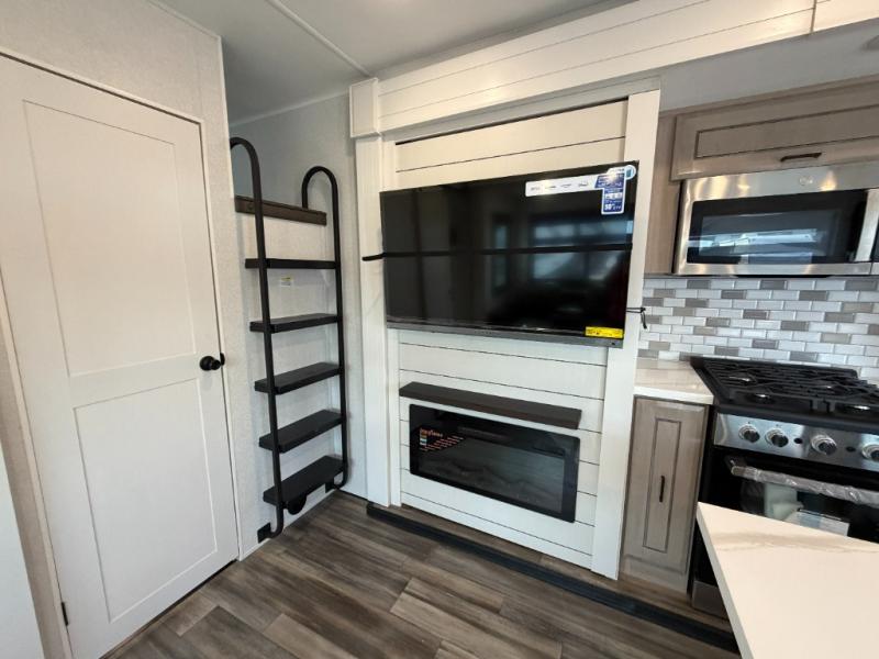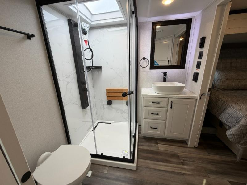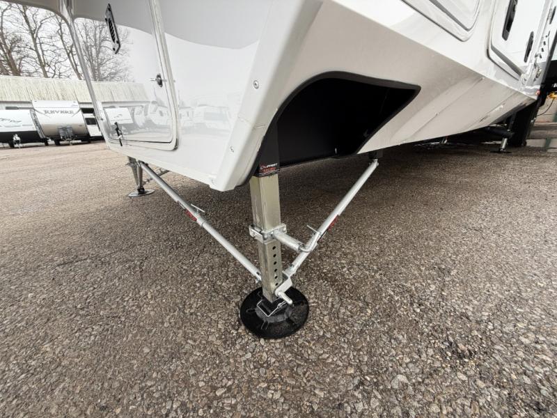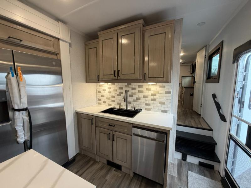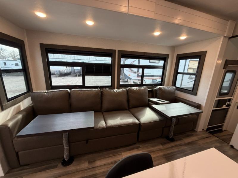 With any Open Range 3X fifth wheel by Open Range RV, you will enjoy residential luxuries and an exceptional build. The TuffShell construction includes vacuum bonded laminated fiberglass and welded aluminum frames for added strength, and the PVC roofing membrane is ultra durable. You can plan to camp year around or go full-time since there is a mandatory Four Season Package that includes a heated and enclosed underbelly, a 40K BTU high-performance furnace, double insulated baggage doors, and more. The residential features continue on with the mandatory Executive Package with the TravelLINK Smart RV system, Keyed-Alike entry and baggage doors, painted fiberglass front cap with LED lighting, and three 15,000 BTU A/C units with quiet residential return air. Inside, you'll enjoy GE kitchen appliances, sleek square windows with integrated blinds, ceramic subway tile backsplash, a glass shower door, and the list of amenities goes on!