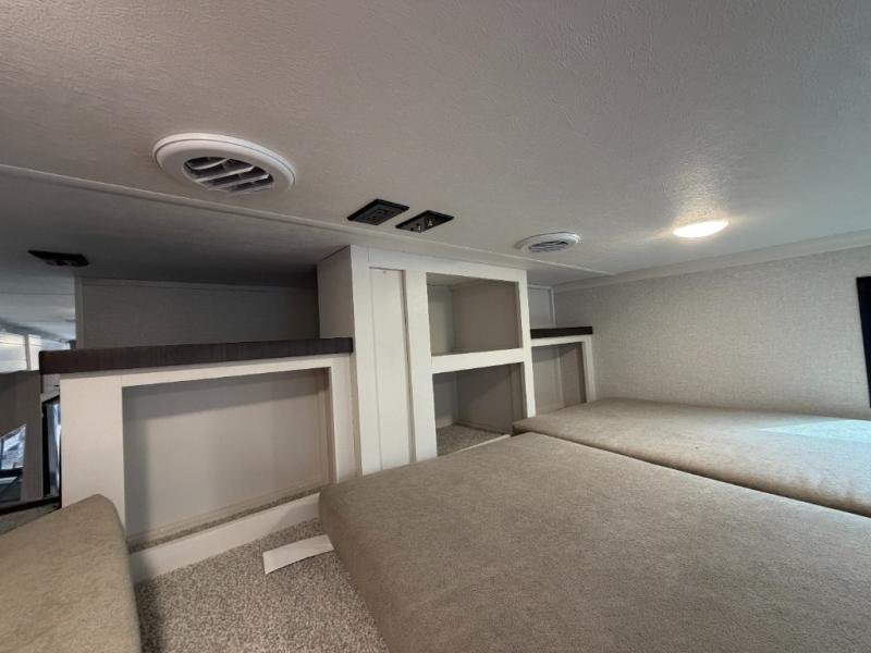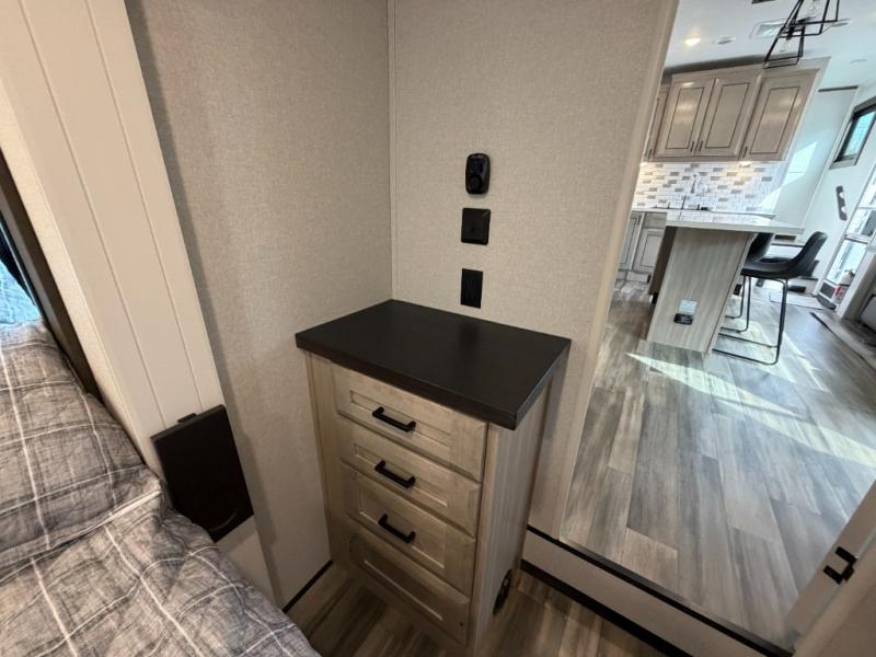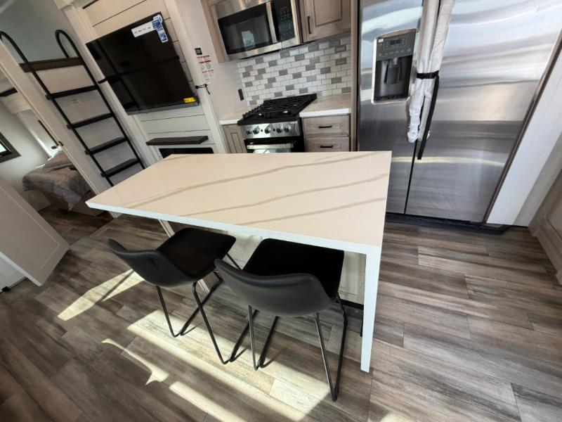 If you enjoy luxury camping or you're looking for a residential fifth wheel to go full-time in, this Open Range 3X is the one! The middle kitchen and living room is made open by the dual opposing slides, and your crew can get comfortable on the mega lounge with two tables. The chef of your group will love cooking on GE free-standing four burner range, or they can use the GE residential microwave to heat up leftovers. The standard dishwasher and central vacuum make cleanup a breeze. A waterfall island with four chairs will provide a place to dine and the hidden pantry behind the swing-out entertainment center can hold snacks galore. There is also a fireplace and smart HDTV to make movie nights cozy. The front master bedroom includes a slide out king bed with a power tilt, two dressers, a large front closet, and a 32" TV to watch shows in bed. You even have your own entrance into the full bath, plus washer and dryer prep if you choose to add those appliances. The rear master bedroom is just as accommodating with a queen bed slide out, a wardrobe and a dresser, plus a second full bath with its own exterior entry door. And the loft above the rear bedroom provides even more sleeping space.