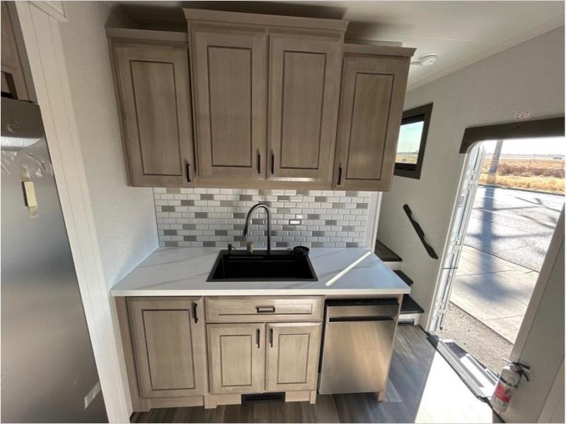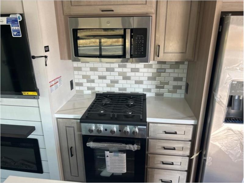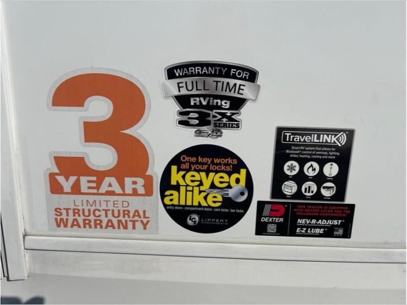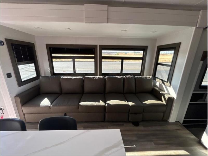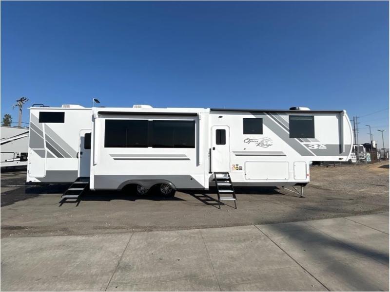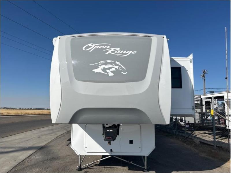 With any Open Range 3X fifth wheel by Open Range RV, you will enjoy residential luxuries and an exceptional build. The TuffShell construction includes vacuum bonded laminated fiberglass and welded aluminum frames for added strength, and the PVC roofing membrane is ultra durable. You can plan to camp year around or go full-time since there is a mandatory Four Season Package that includes a heated and enclosed underbelly, a 40K BTU high-performance furnace, double insulated baggage doors, and more. The residential features continue on with the mandatory Executive Package with the TravelLINK Smart RV system, Keyed-Alike entry and baggage doors, painted fiberglass front cap with LED lighting, and three 15,000 BTU A/C units with quiet residential return air. Inside, you'll enjoy GE kitchen appliances, sleek square windows with integrated blinds, ceramic subway tile backsplash, a glass shower door, and the list of amenities goes on!