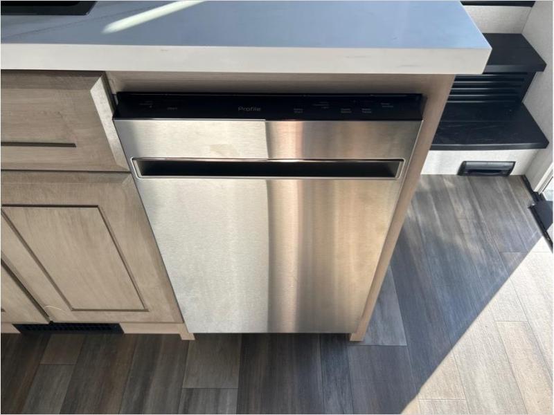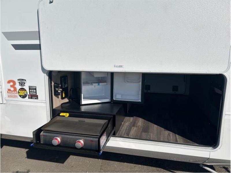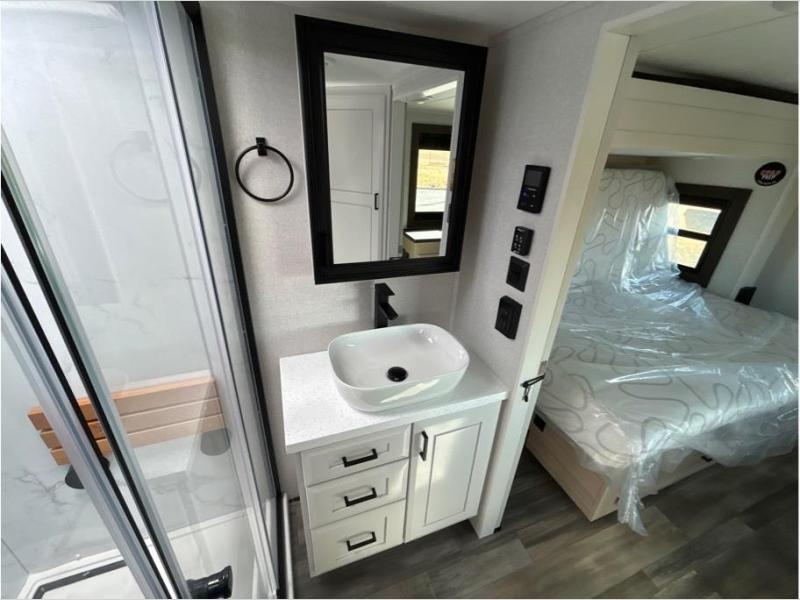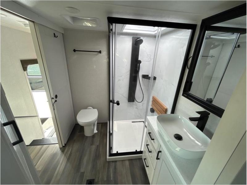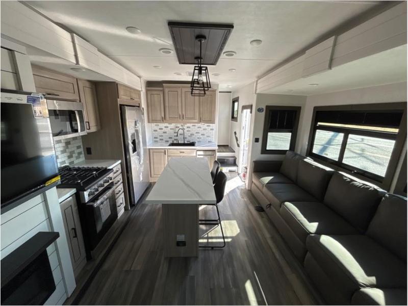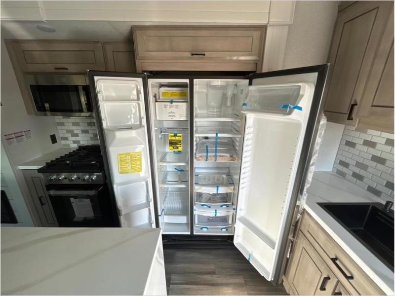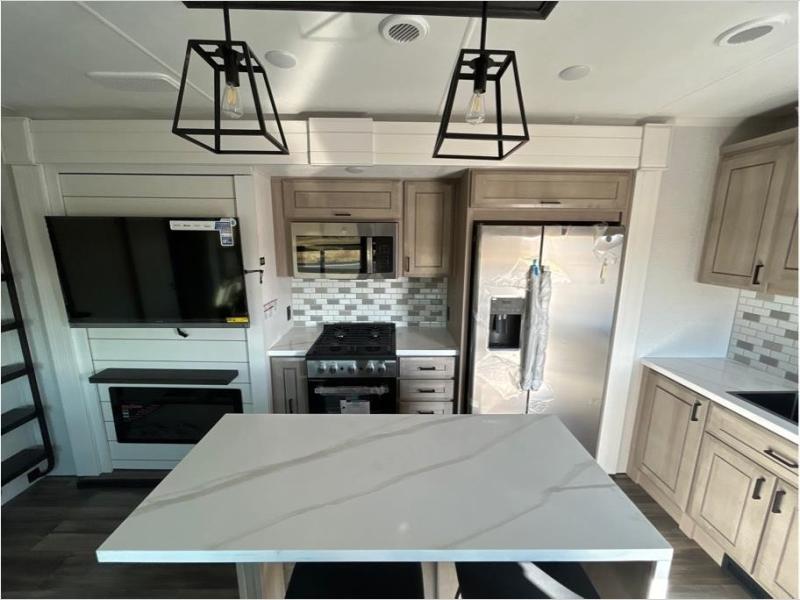 With any Open Range 3X fifth wheel by Open Range RV, you will enjoy residential luxuries and an exceptional build. The TuffShell construction includes vacuum bonded laminated fiberglass and welded aluminum frames for added strength, and the PVC roofing membrane is ultra durable. You can plan to camp year around or go full-time since there is a mandatory Four Season Package that includes a heated and enclosed underbelly, a 40K BTU high-performance furnace, double insulated baggage doors, and more. The residential features continue on with the mandatory Executive Package with the TravelLINK Smart RV system, Keyed-Alike entry and baggage doors, painted fiberglass front cap with LED lighting, and three 15,000 BTU A/C units with quiet residential return air. Inside, you'll enjoy GE kitchen appliances, sleek square windows with integrated blinds, ceramic subway tile backsplash, a glass shower door, and the list of amenities goes on!
