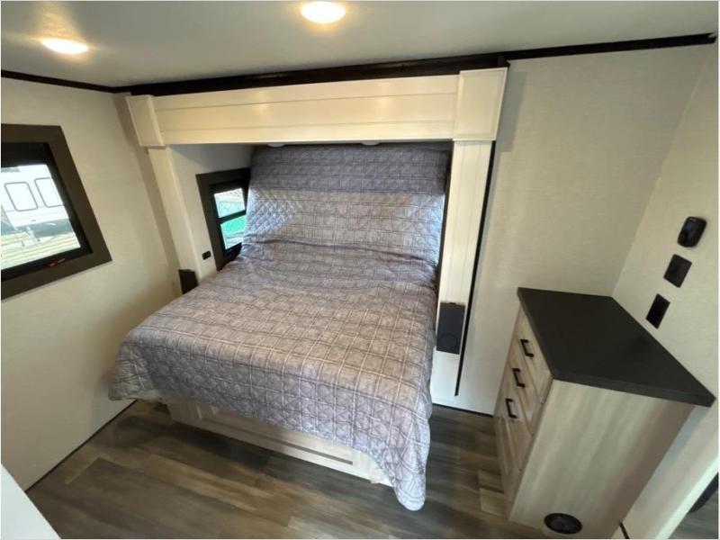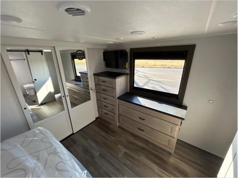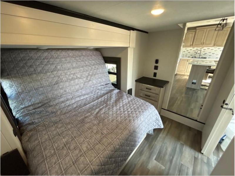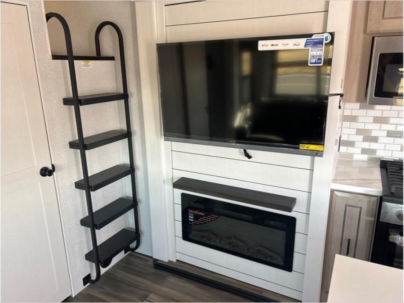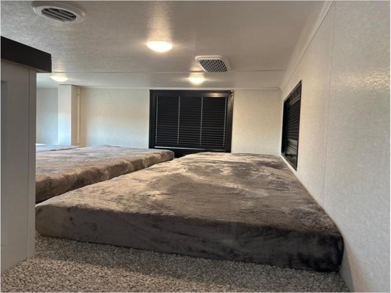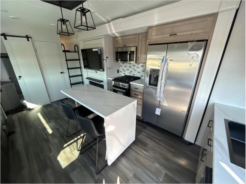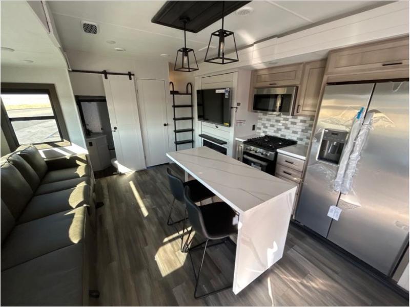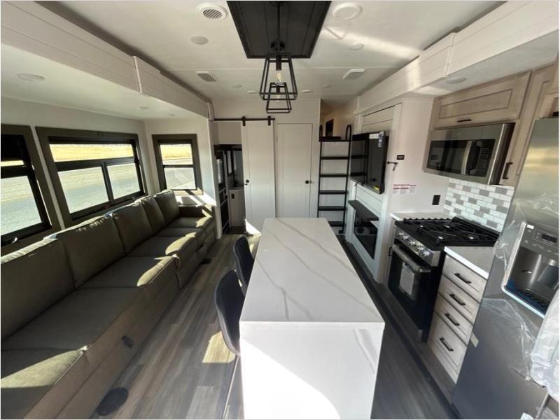 If you enjoy luxury camping or you're looking for a residential fifth wheel to go full-time in, this Open Range 3X is the one! The middle kitchen and living room is made open by the dual opposing slides, and your crew can get comfortable on the mega lounge with two tables. The chef of your group will love cooking on GE free-standing four burner range, or they can use the GE residential microwave to heat up leftovers. The standard dishwasher and central vacuum make cleanup a breeze. A waterfall island with four chairs will provide a place to dine and the hidden pantry behind the swing-out entertainment center can hold snacks galore. There is also a fireplace and smart HDTV to make movie nights cozy. The front master bedroom includes a slide out king bed with a power tilt, two dressers, a large front closet, and a 32" TV to watch shows in bed. You even have your own entrance into the full bath, plus washer and dryer prep if you choose to add those appliances. The rear master bedroom is just as accommodating with a queen bed slide out, a wardrobe and a dresser, plus a second full bath with its own exterior entry door. And the loft above the rear bedroom provides even more sleeping space.