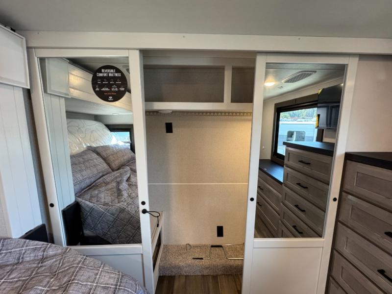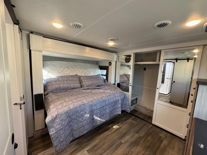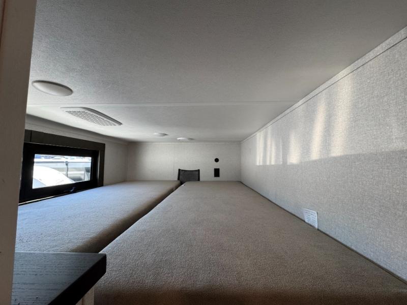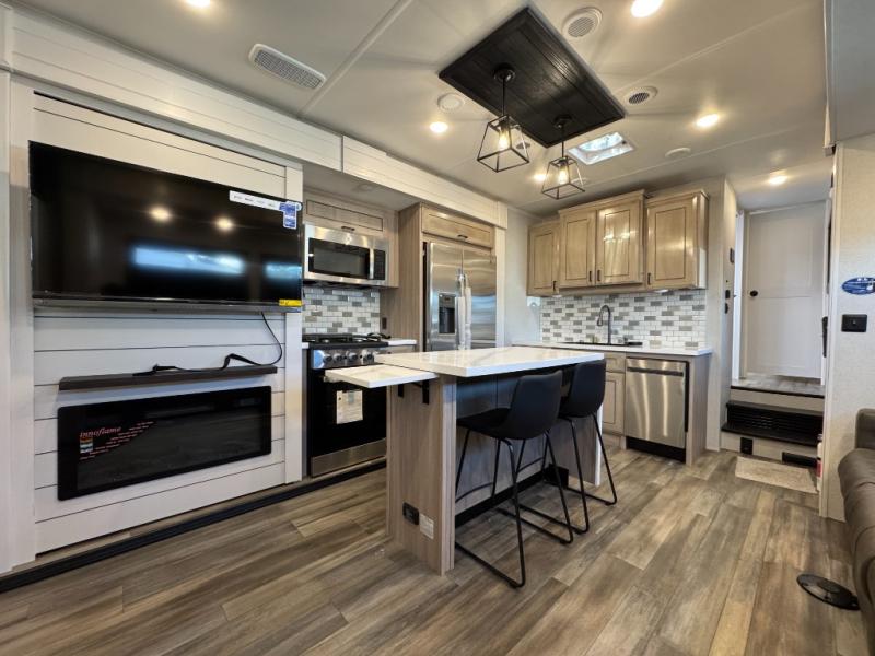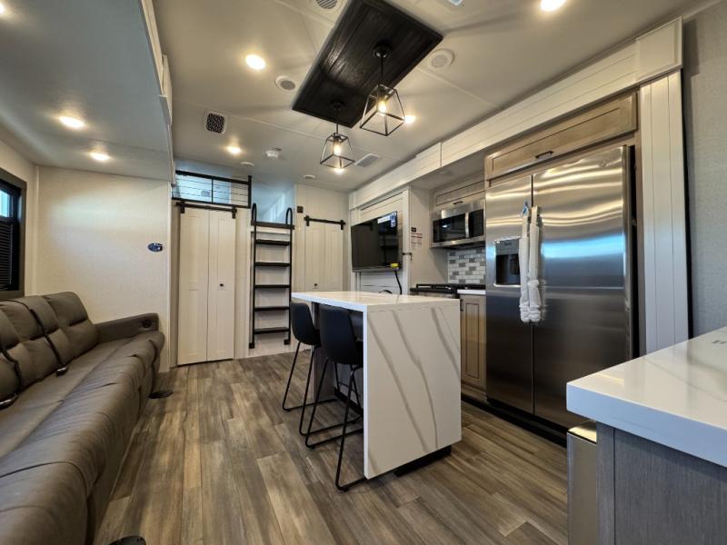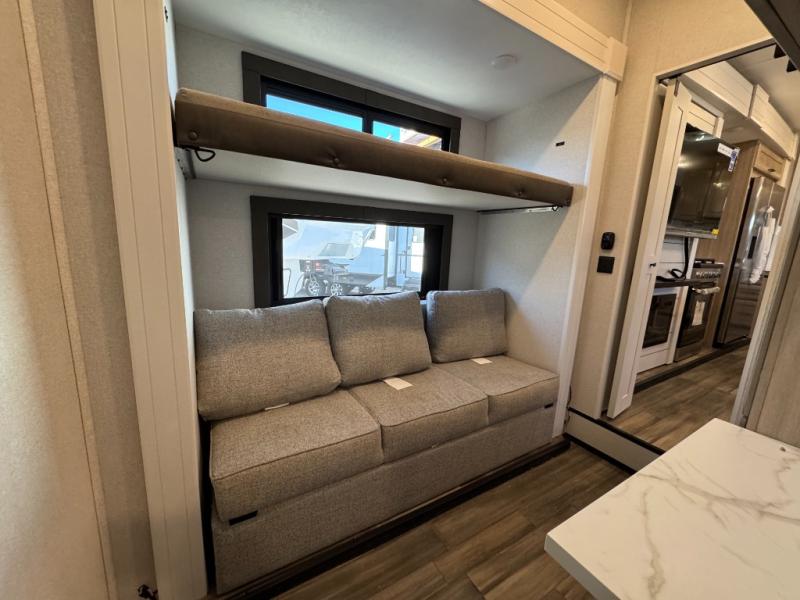 If you enjoy luxury camping or you're looking for a residential fifth wheel to go full-time in, this Open Range 3X is the one! The middle kitchen and living room is made open by the dual opposing slides, and your crew can get comfortable on the mega lounge with two tables. The chef of your group will love cooking on GE free-standing four burner range, or they can use the GE residential microwave to heat up leftovers. The standard dishwasher and central vacuum make cleanup a breeze. A waterfall island with four chairs will provide a place to dine and the hidden pantry behind the swing-out entertainment center can hold snacks galore. There is also a fireplace and smart HDTV to make movie nights cozy. The front master bedroom includes a slide out 72" x 78" king bed, two dressers, a large front closet, and a 32" TV to watch shows in bed. You even have your own entrance into the full bath, plus washer and dryer prep if you choose to add those appliances. The rear bunkhouse suite includes two separate sides that can be shut off from one another, perfect if you have older kids or more than one guest. Each side includes a bi-fold sofa, a desk with overhead storage, and a wardrobe with drawers. And one side even includes a flip-up bunk above the sofa for more sleeping space! The shared full rear bath includes a tub/shower to make bath time easier than ever, plus you'll find one of the dual entry doors here for added convenience!