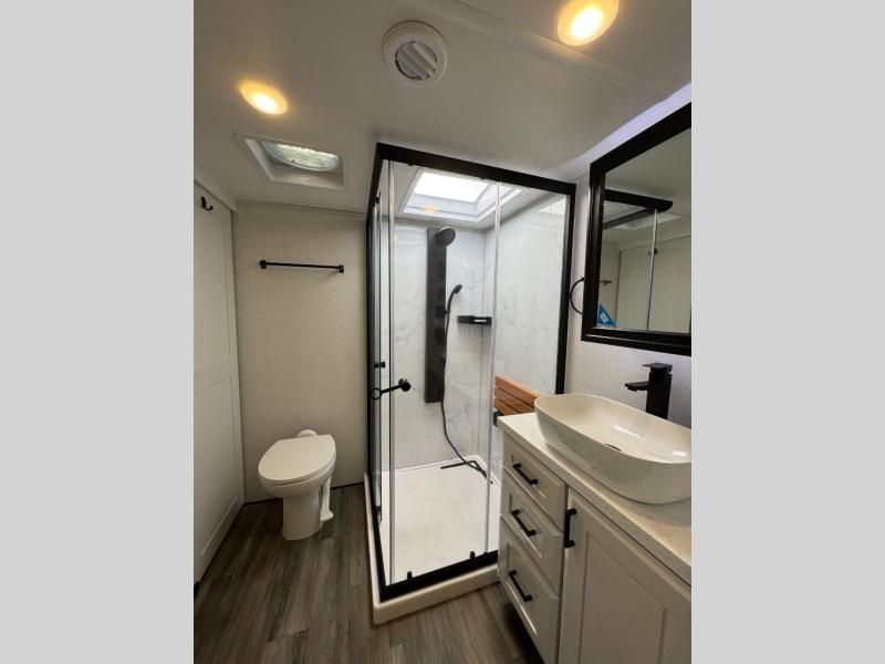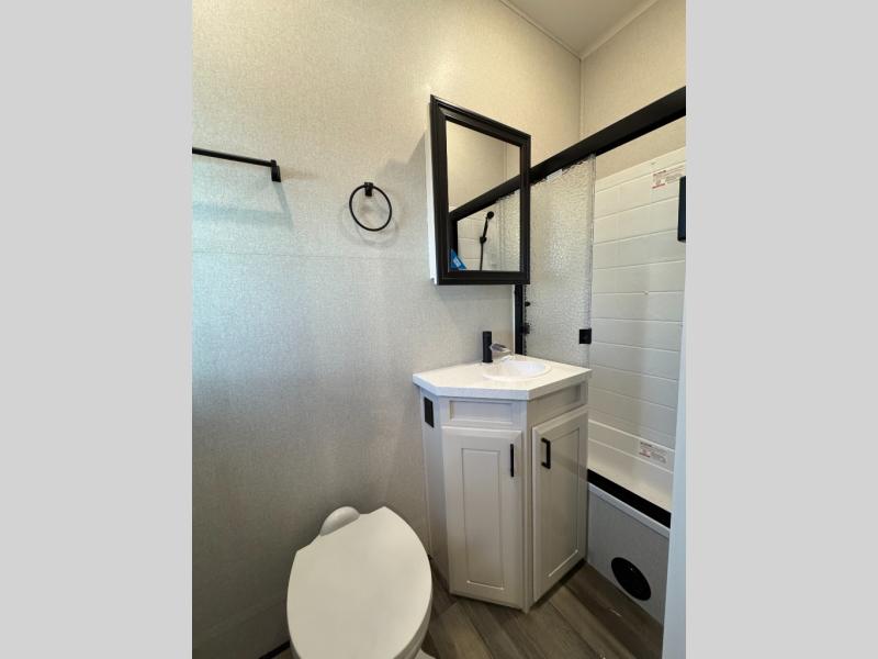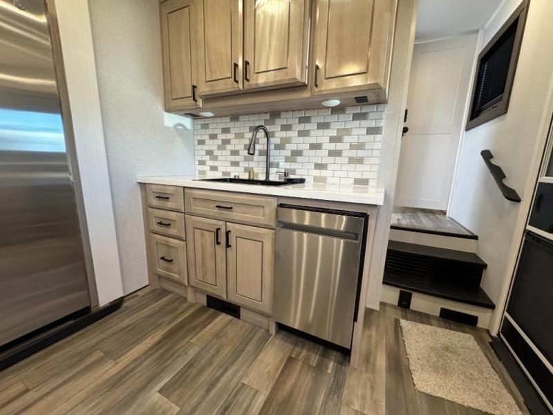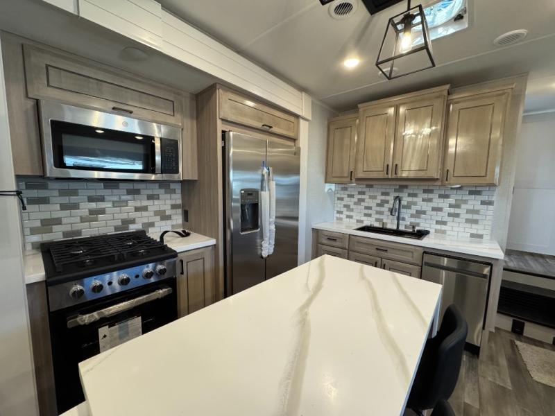 With any Open Range 3X fifth wheel by Open Range RV, you will enjoy residential luxuries and an exceptional build. The TuffShell construction includes vacuum bonded laminated fiberglass and welded aluminum frames for added strength, and the PVC roofing membrane is ultra durable. You can plan to camp year around or go full-time since there is a mandatory Four Season Package that includes a heated and enclosed underbelly, a 40K BTU high-performance furnace, double insulated baggage doors, and more. The residential features continue on with the mandatory Executive Package with the TravelLINK Smart RV system, Keyed-Alike entry and baggage doors, painted fiberglass front cap with LED lighting, and three 15,000 BTU A/C units with quiet residential return air. Inside, you'll enjoy GE kitchen appliances, sleek square windows with integrated blinds, ceramic subway tile backsplash, a glass shower door, and the list of amenities goes on!