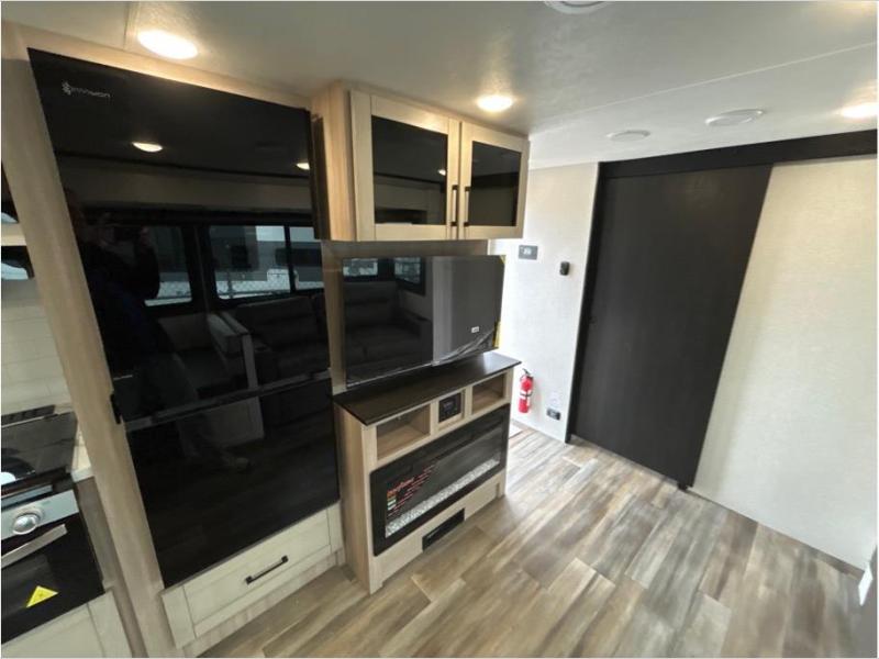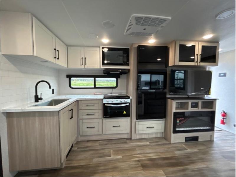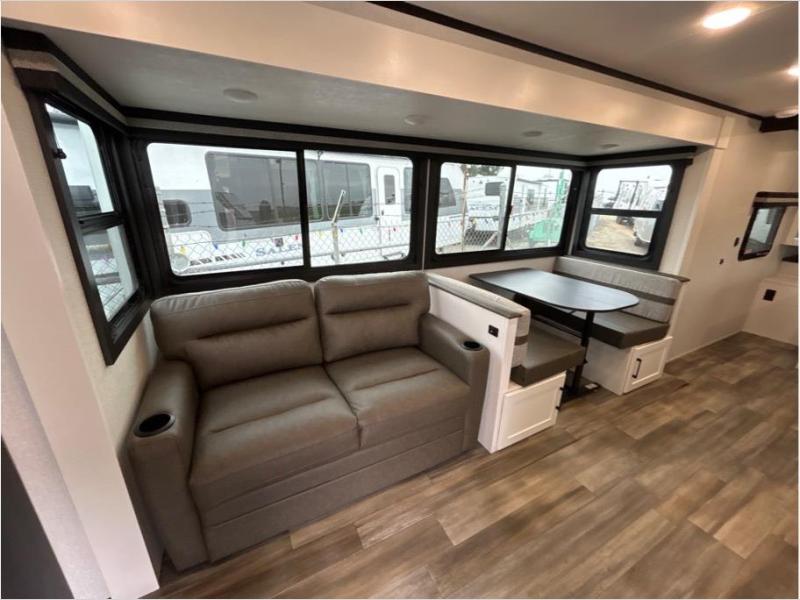 Your group of five to six will love camping and making memories in this travel trailer! Whether you're making lunch on the outside kitchen, playing a game at the booth dinette, or relaxing on the tri-fold sofa, you're sure to have a good time. There is an entertainment center with a fireplace to make your space feel more like home, plus a full interior kitchen and a walk-in pantry for tons of storage space. The full rear bath features a large vanity where you can keep your things, and the front private bedroom with a queen bed will give you your own space at night!