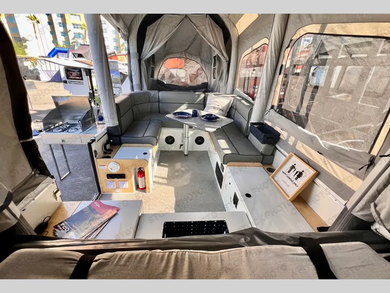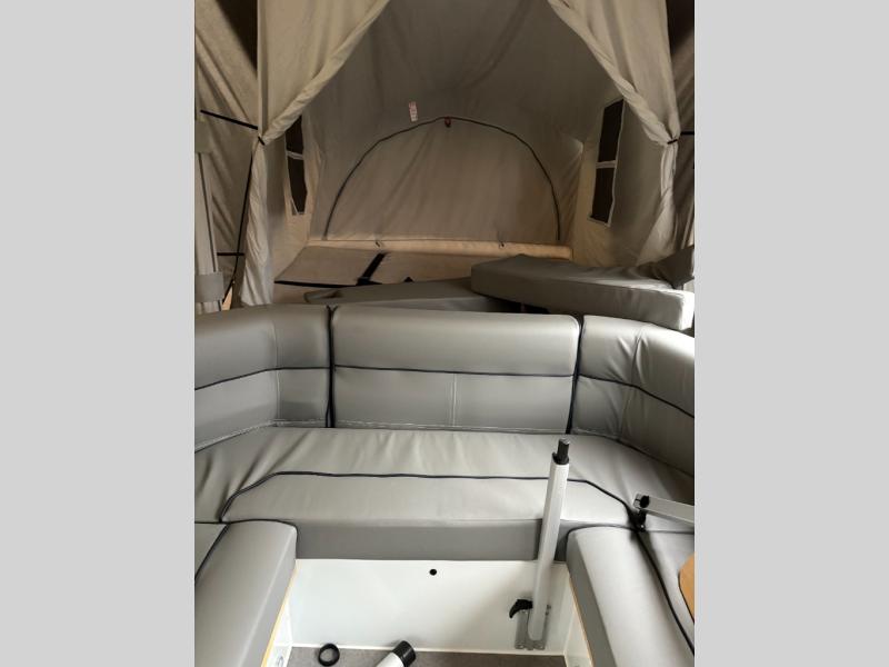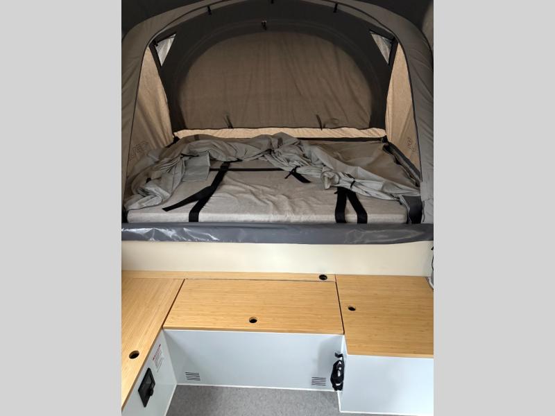This limited edition camper includes everything you love about the OP4 and more! There is added storage both inside and out so nothing gets left behind, and the kitchen layout is flipped on this unit, allowing you to easily access the refrigerator while cooking on the stovetop. The air tent design includes two double tent end beds plus a U-shaped dinette, so you can sleep six campers each night. Limited features include an additional propane tank to give you two LP tanks total, an upgraded lounge and mattress, 2x lithium batteries, and more!