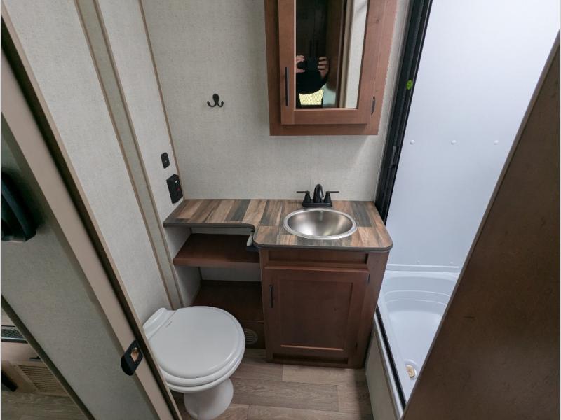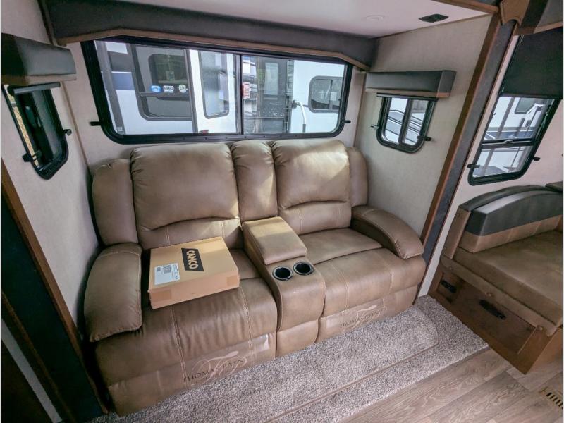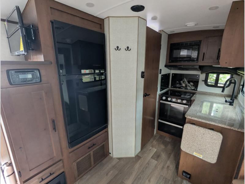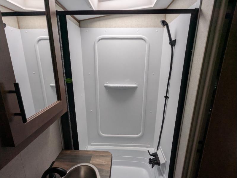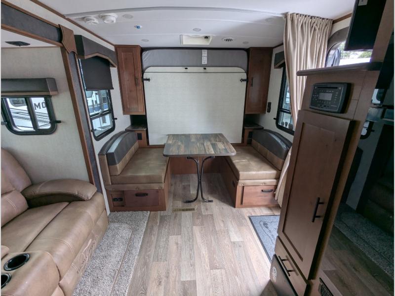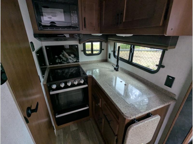 Versatility and comfort is found in this spacious travel trailer. There is a queen Murphy bed up front that can fold away into the wall so you can dine at the fold down booth dinette. The residential sofa with built-in recliners will be the perfect place to relax as you watch a movie on the TV, and the single slide out here will provide more interior space. This model includes a rear corner kitchen with plenty of counter space to prep meals and the full bath is in the other rear corner for privacy. You'll also enjoy the shower skylight for more head room, plus a living area skylight for more natural light.