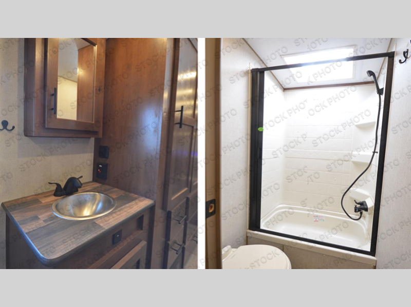 Dual entry doors in this travel trailer will allow you to enter in through the rear kitchen, or in the front bedroom for convenience. You will love having a queen bed to sleep on and dual bedroom wardrobes to keep your clothes wrinkle-free. Get cleaned up in the full bath that includes a shower skylight, then head to the rear kitchen to prepare breakfast on the three burner cooktop. Your crew can sit at the mountain dinette slide or relax on the Recliners before heading out for the day. This model also includes a large wardrobe with drawers and a pantry for tons of storage space.