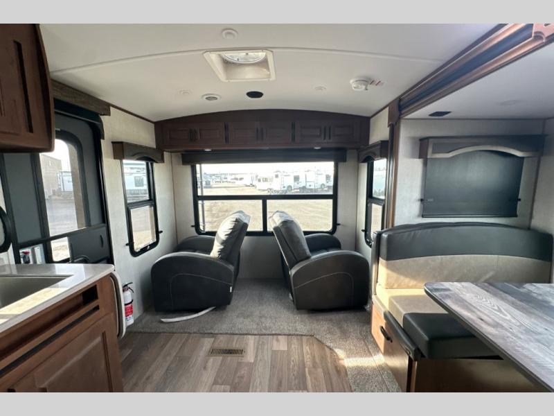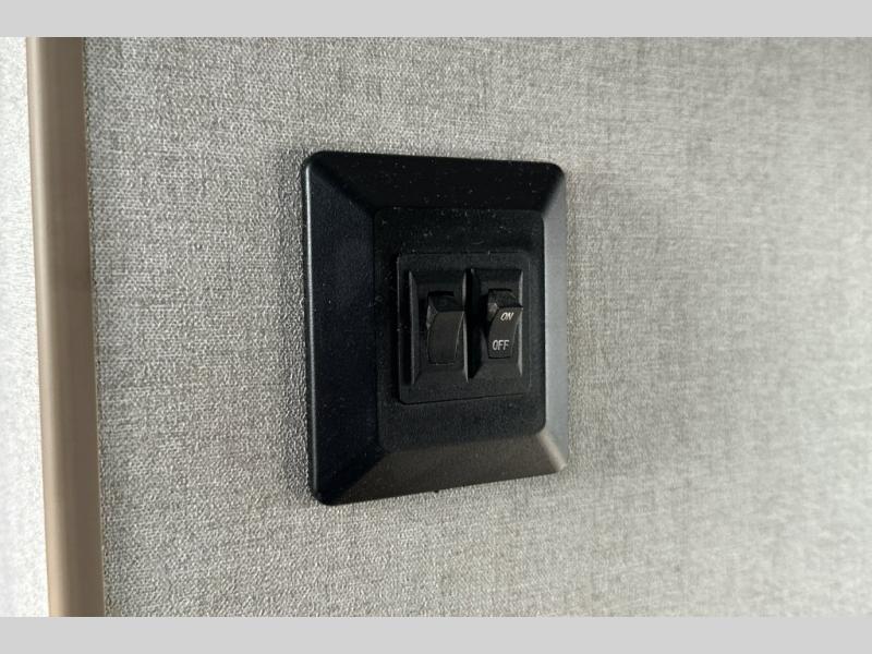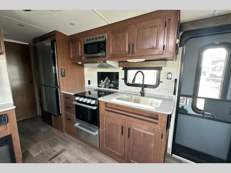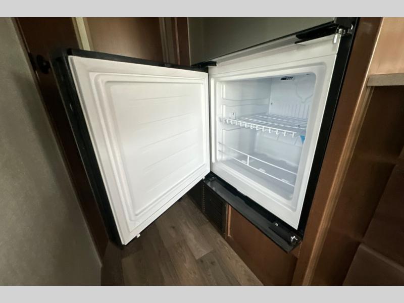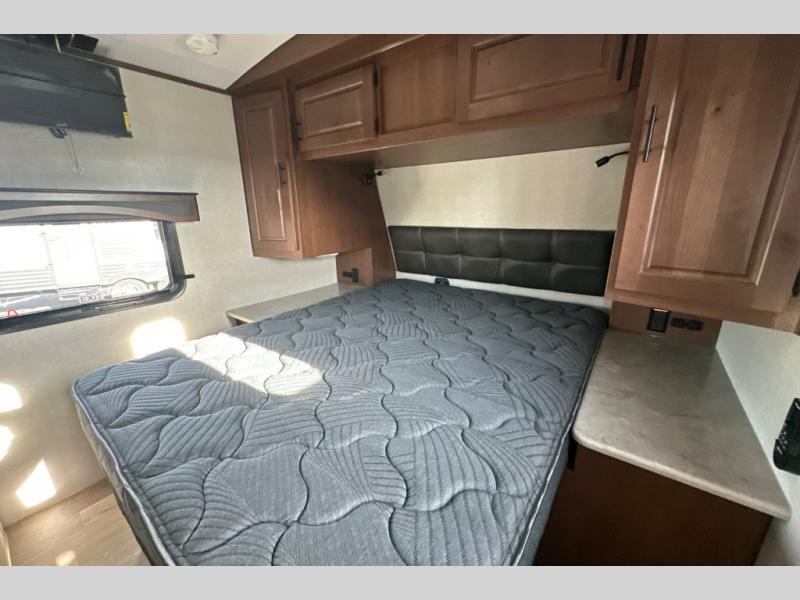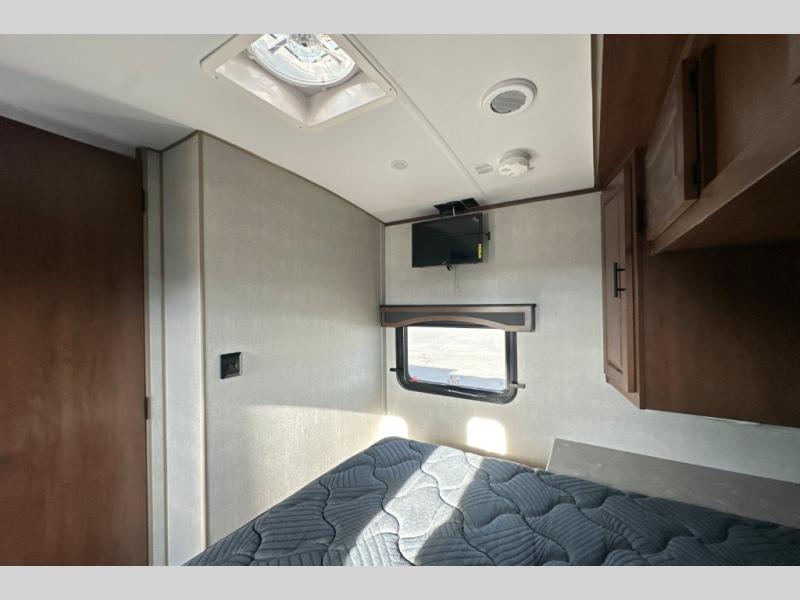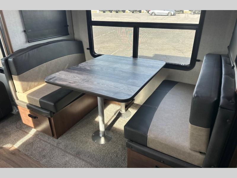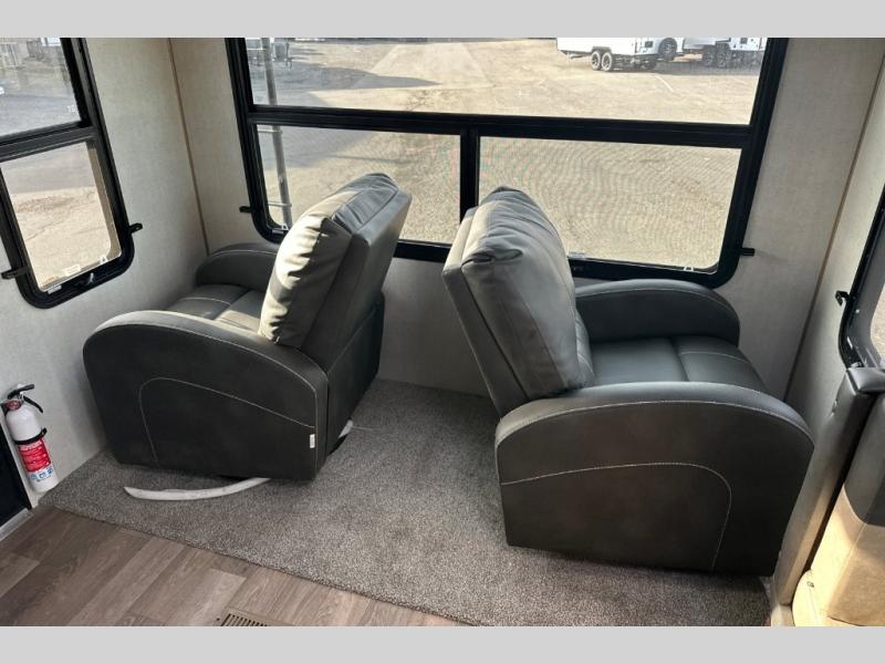 Head out to your favorite campsite in this roomy couple's trailer. There are dual entry doors, allowing you to enter in through the rear living area, or the front private bedroom. You can relax on the free-standing recliners after you've unpacked and maybe watch a show on the swing-out 32" TV. And an optional residential sofa with built-in recliners in place of the recliners is available here if you'd prefer that seating set up! Once lunch is prepared on the three burner cooktop, you can dine at the mountain dinette with a skylight, or head outdoors to sit under the 21' awning. The queen bed is sure to bring comfort in the front bedroom, and if you have an overnight guest, they can sleep on the dinette!