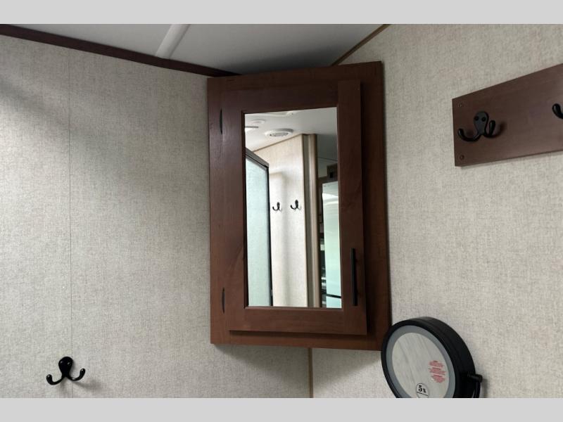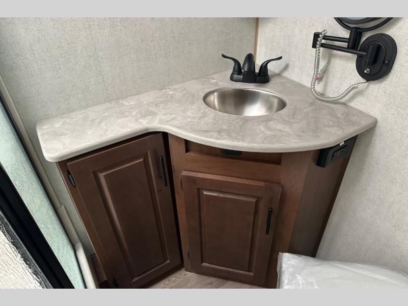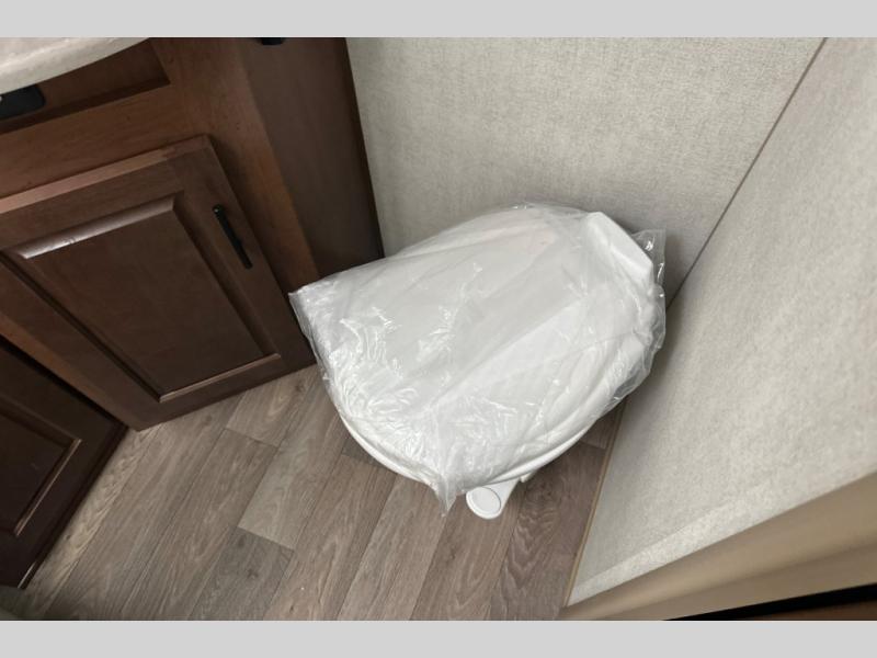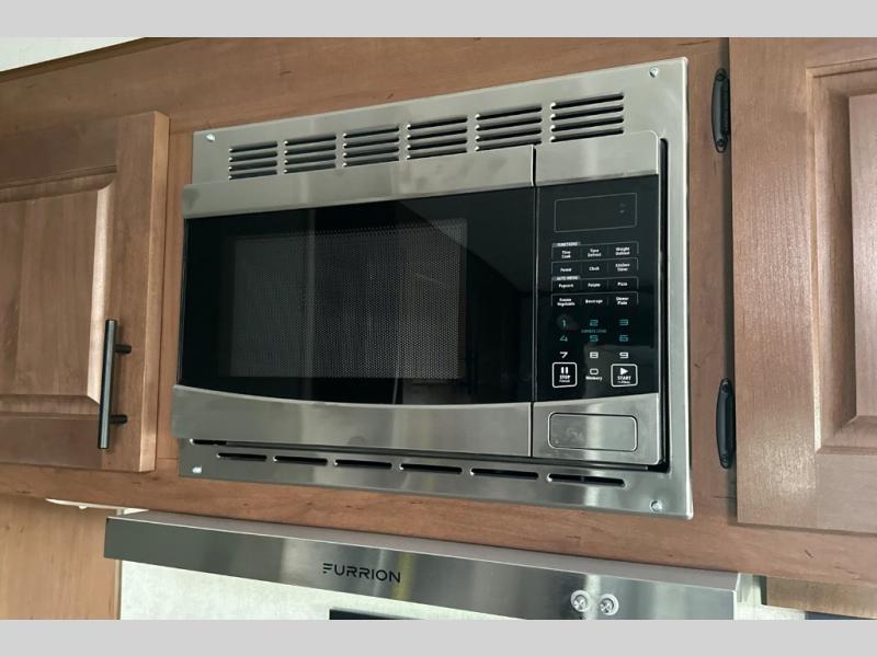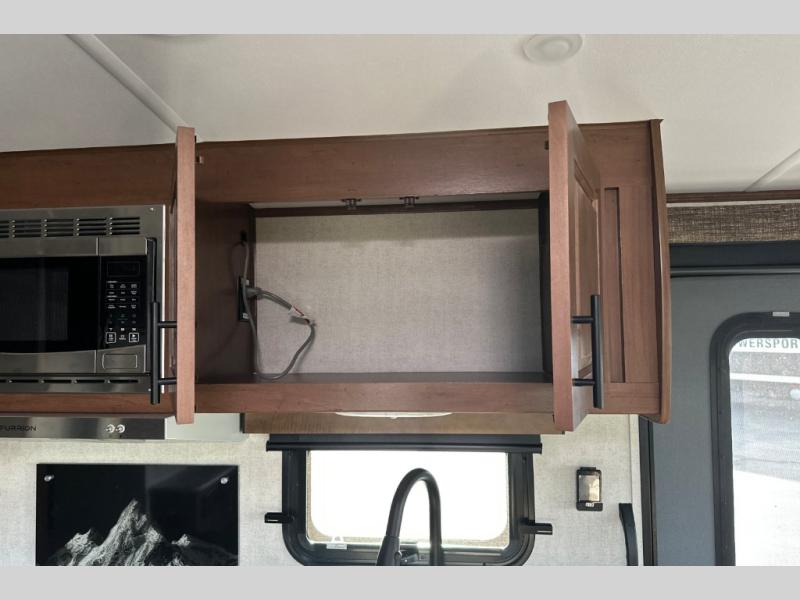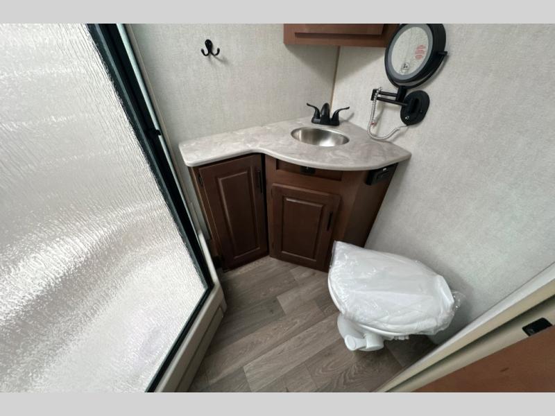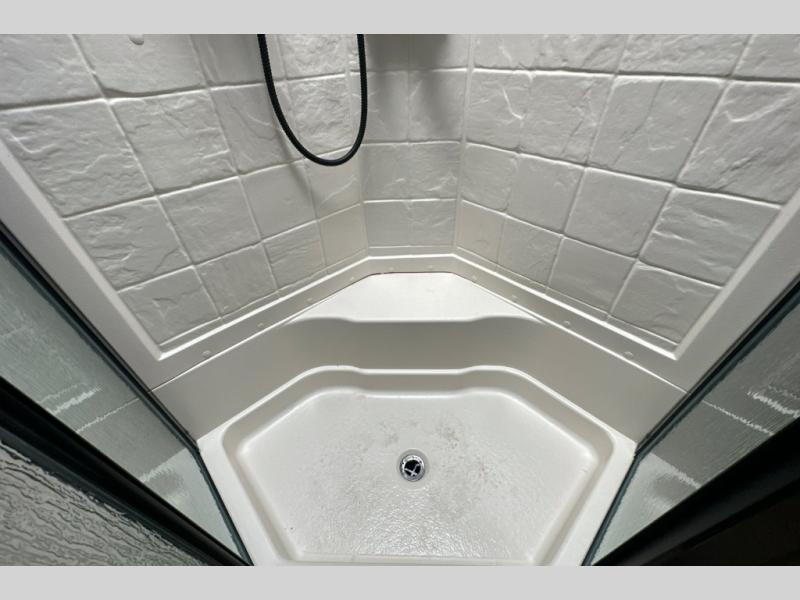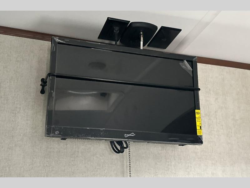 Head out to your favorite campsite in this roomy couple's trailer. There are dual entry doors, allowing you to enter in through the rear living area, or the front private bedroom. You can relax on the free-standing recliners after you've unpacked and maybe watch a show on the swing-out 32" TV. And an optional residential sofa with built-in recliners in place of the recliners is available here if you'd prefer that seating set up! Once lunch is prepared on the three burner cooktop, you can dine at the mountain dinette with a skylight, or head outdoors to sit under the 21' awning. The queen bed is sure to bring comfort in the front bedroom, and if you have an overnight guest, they can sleep on the dinette!
