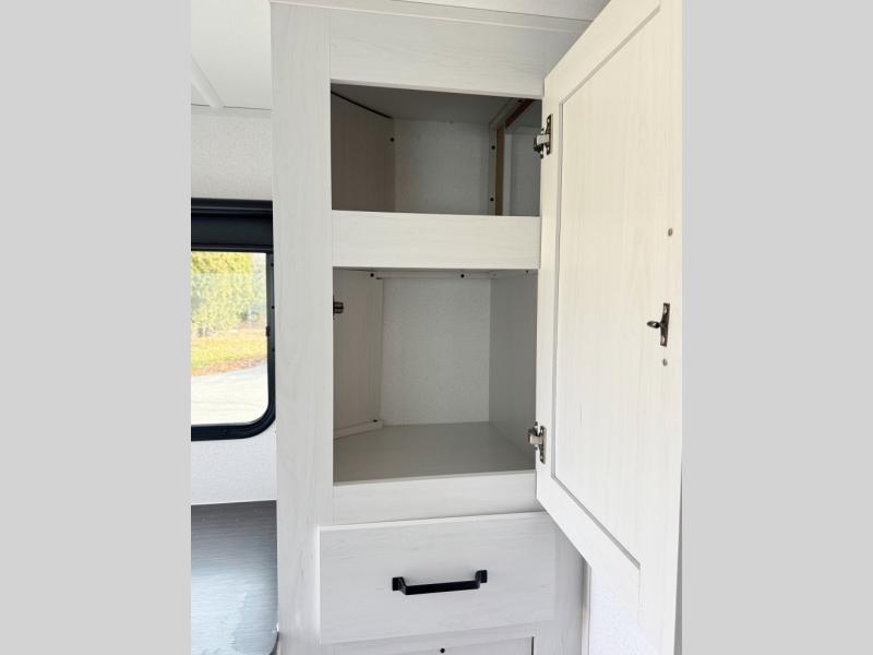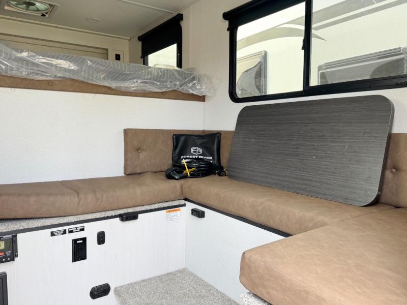 This Overland Vehicle Equipped is perfect for all your outdoor adventures! Enjoy a good night's rest on the front queen bed with a 5" mattress. A Maxx air vent keeps the air circulating and an optional A/C can be added for more comfort. The U-shaped dinette is great for enjoying meals and even has a storage area for a toilet, and you can add the cooler option to keep food fresh.