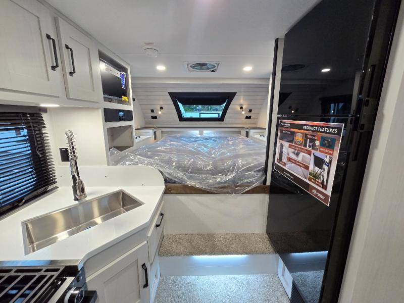 Each Backpack Edition truck camper by Palomino is constructed with high-density block foam insulation, an alpha super flex membrane roof, and Azdel substrate for added durability. You will also love the white or grey hi-gloss exterior fiberglass that is eye-catching and easy to keep clean. Inside, you'll find solid surface countertops, white cabinets, an undermount sink, and more comforts. The 200-watts of solar power and 100 Amp lithium battery will keep you powered up, and the electric jacks will have you set up at camp in no-time!