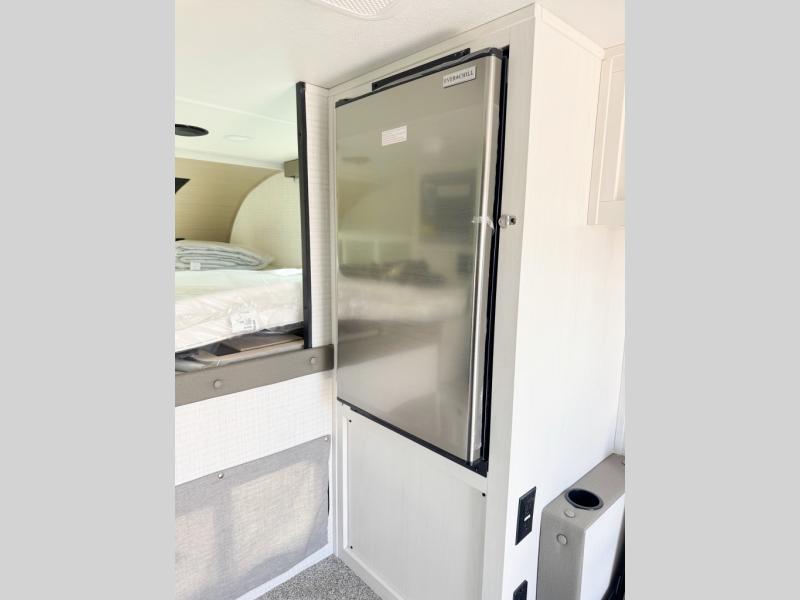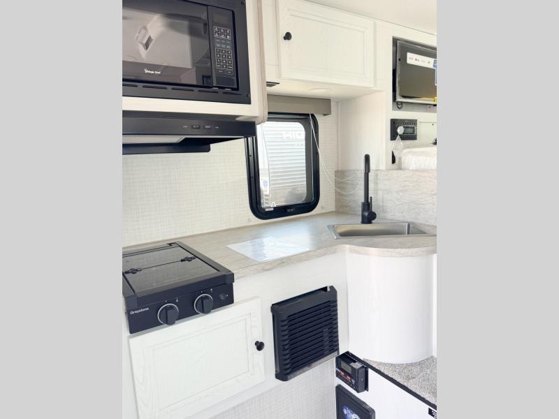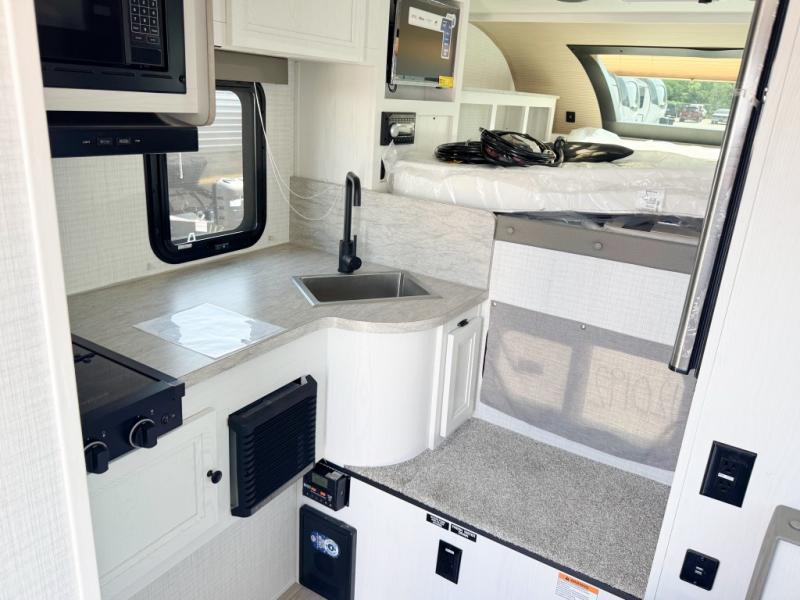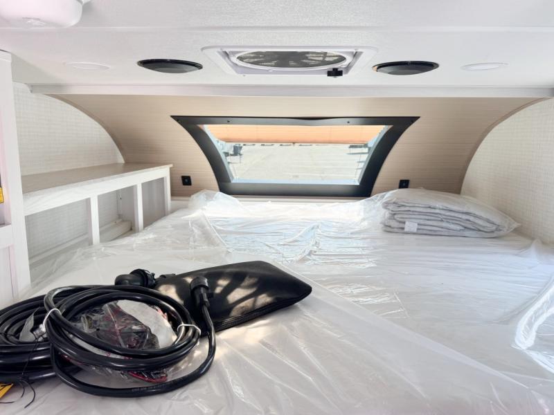 You will have everything you need for a comfortable trip in this hard side truck camper! There is a front queen bed to lay your head on at night with storage next to it and an entertainment center if you choose to add the optional TV. Above the two burner cooktop and sink are overhead cabinets to store your cooking essentials. The 60" x 22" jackknife sofa is not only a comfortable place to enjoy your meals, but also for transforming into an extra sleeping space, plus it has overhead cabinets to store your games. You even have a wet bath to freshen up in each morning!