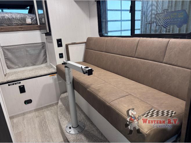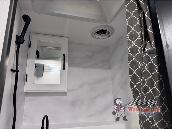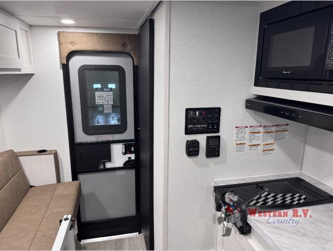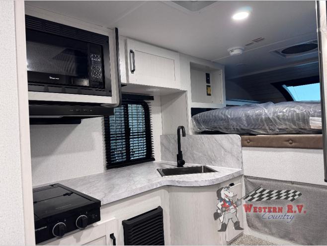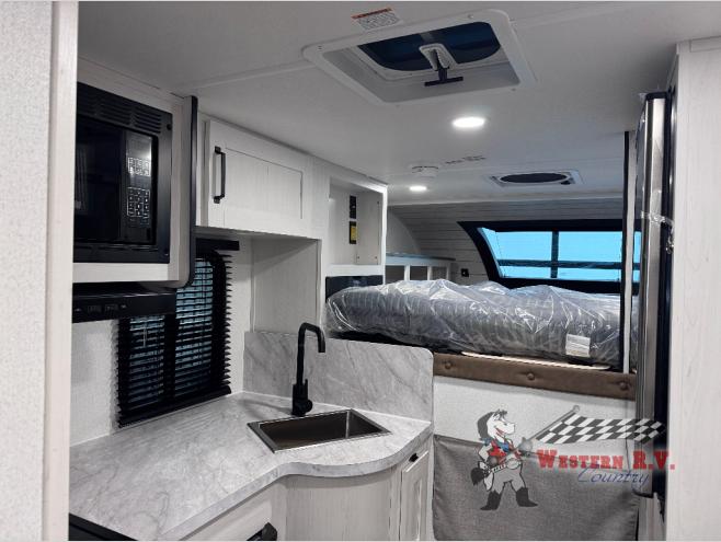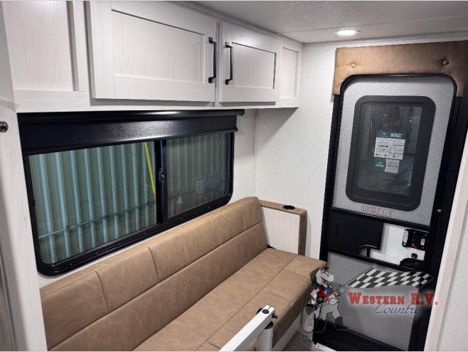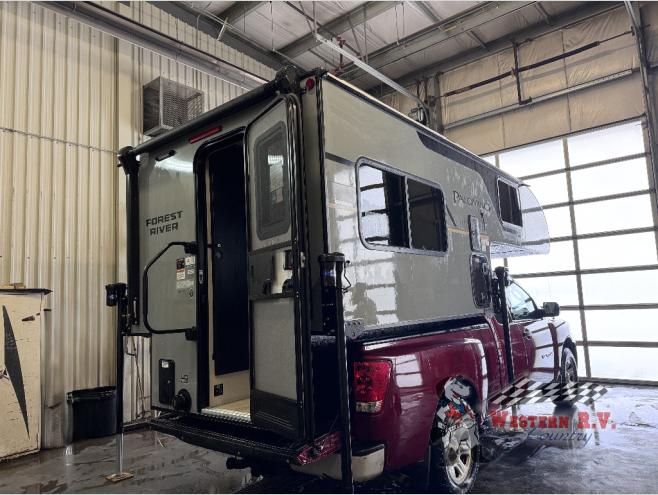You will have everything you need for a comfortable trip in this hard side truck camper! There is a front queen bed to lay your head on at night with storage next to it and an entertainment center if you choose to add the optional TV. Above the two burner cooktop and sink are overhead cabinets to store your cooking essentials. The 60" x 22" jackknife sofa is not only a comfortable place to enjoy your meals, but also for transforming into an extra sleeping space, plus it has overhead cabinets to store your games. You even have a wet bath to freshen up in each morning!