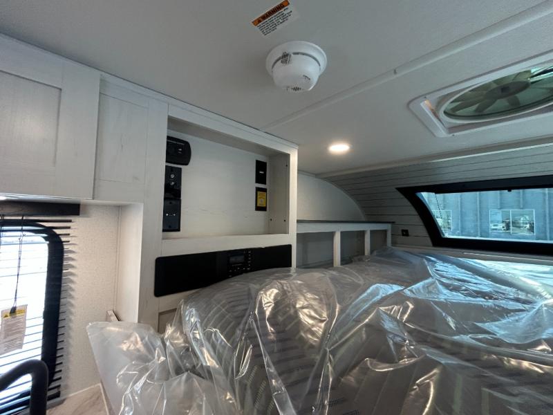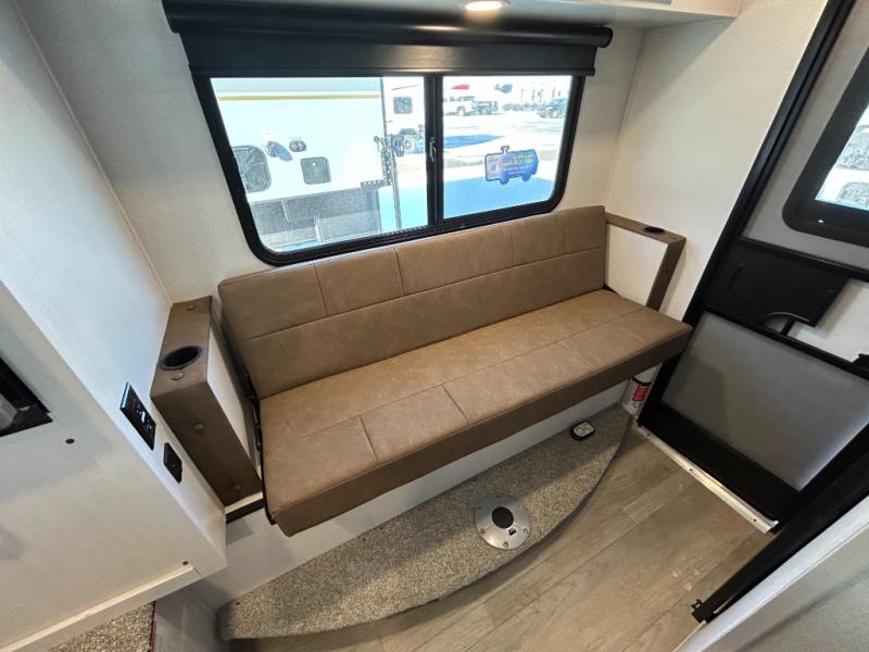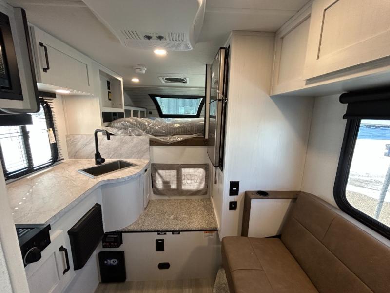 You will have everything you need for a comfortable trip in this hard side truck camper! There is a front queen bed to lay your head on at night with storage next to it and an entertainment center if you choose to add the optional TV. Above the two burner cooktop and sink are overhead cabinets to store your cooking essentials. The 60" x 22" jackknife sofa is not only a comfortable place to enjoy your meals, but also for transforming into an extra sleeping space, plus it has overhead cabinets to store your games. You even have a wet bath to freshen up in each morning!