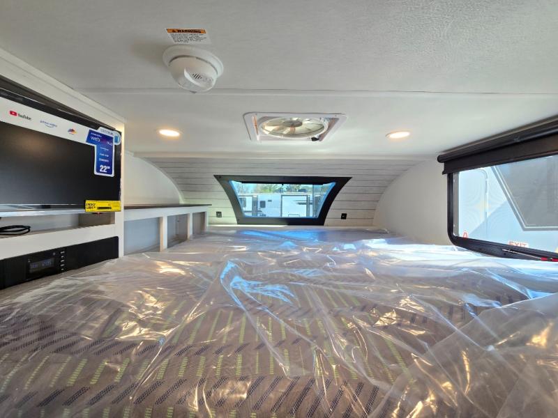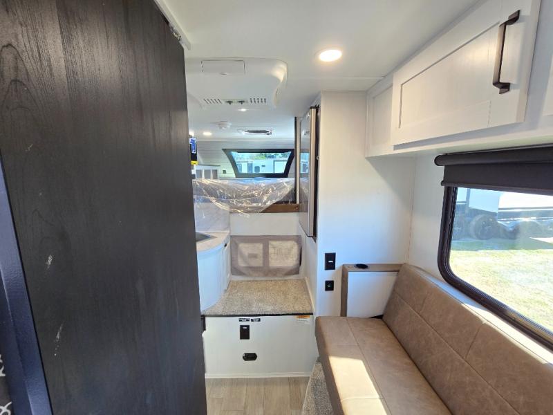 You will have everything you need for a comfortable trip in this hard side truck camper! There is a front queen bed to lay your head on at night with storage next to it and an entertainment center if you choose to add the optional TV. Above the two burner cooktop and sink are overhead cabinets to store your cooking essentials. The 60" x 22" jackknife sofa is not only a comfortable place to enjoy your meals, but also for transforming into an extra sleeping space, plus it has overhead cabinets to store your games. You even have a wet bath to freshen up in each morning!