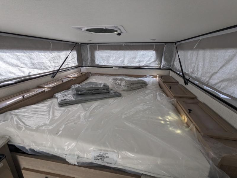 This soft side truck camper was built for 1/2 ton trucks with a 5' 6" to an 8' bed. Wake up feeling recharged after sleeping on the front queen bed with foot lockers and bedroom storage on either side of it. There is even a wardrobe for added storage. You can prepare your best meals with the two burner cooktop, and the refrigerator can hold perishables. Your meals can be enjoyed at the U-shaped seating area with a table and you can transform it into an extra sleeping space for a friend to join the fun!