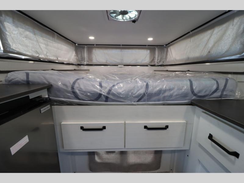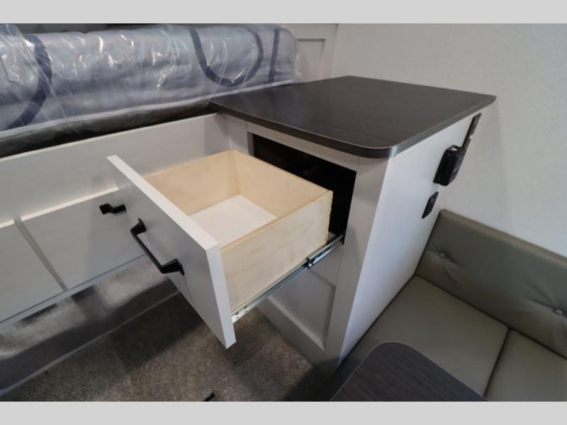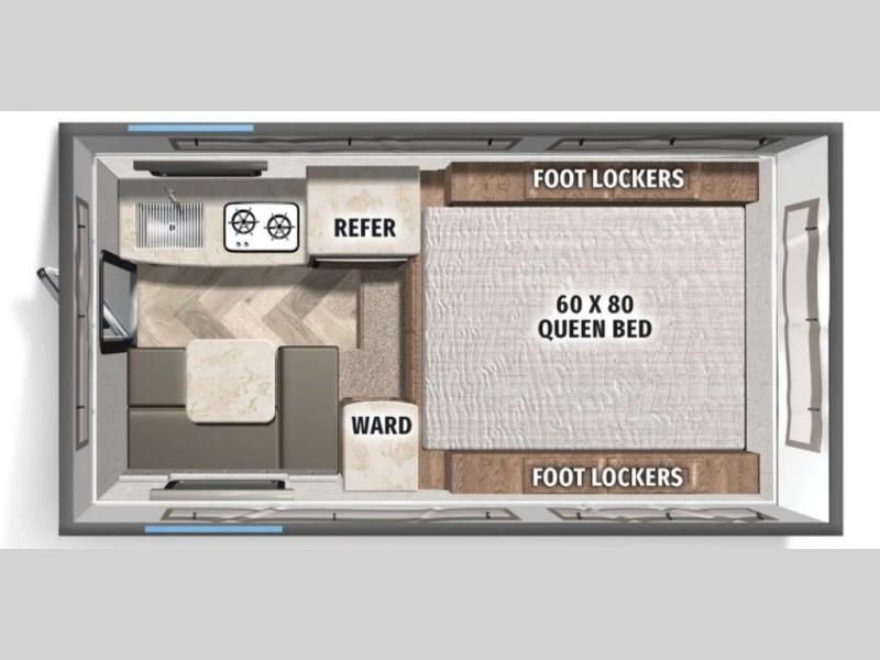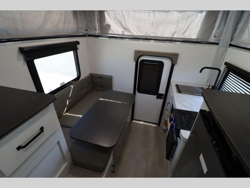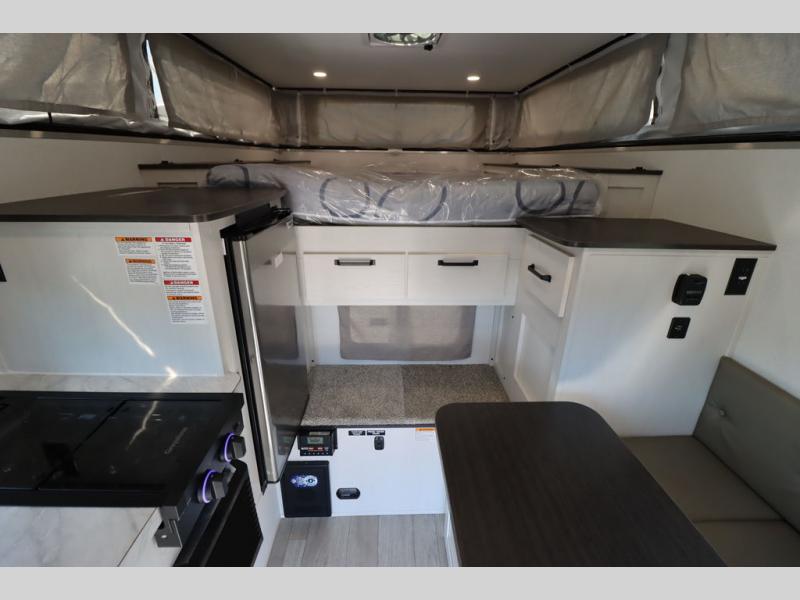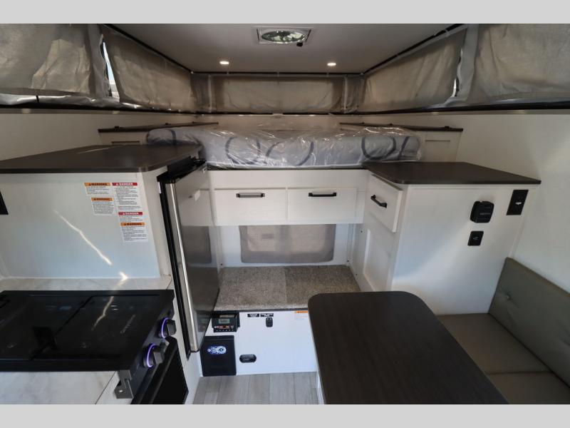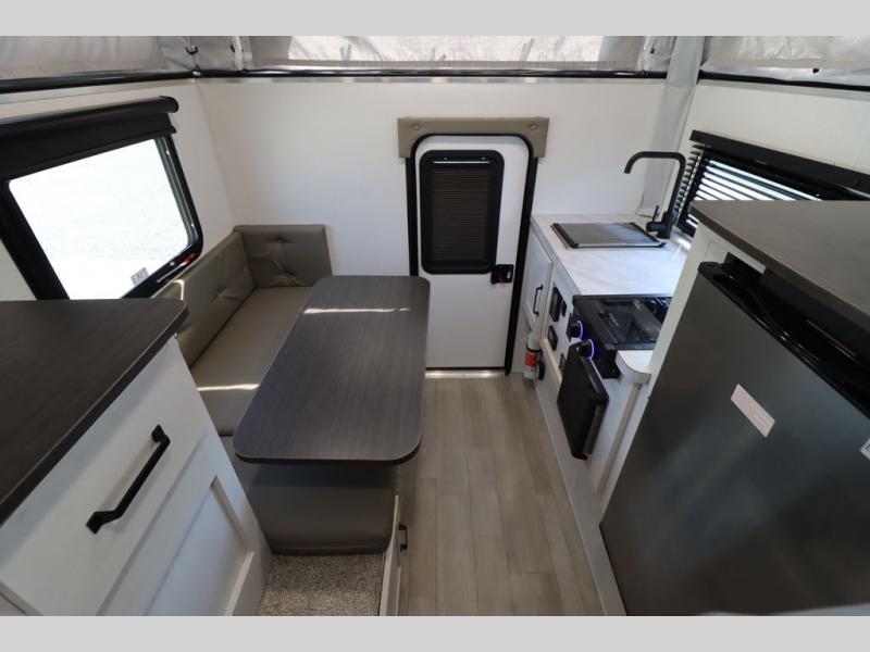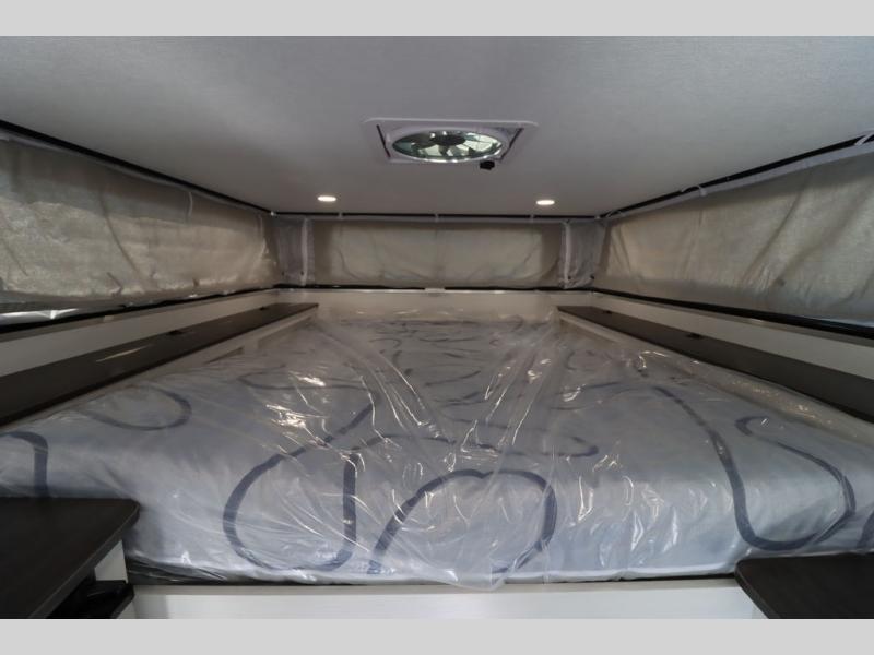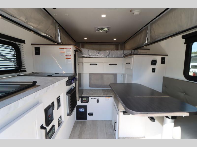 This soft side truck camper was built for 1/2 ton trucks with a 5' 6" to an 8' bed. Wake up feeling recharged after sleeping on the front queen bed with foot lockers and bedroom storage on either side of it. There is even a wardrobe for added storage. You can prepare your best meals with the two burner cooktop, and the refrigerator can hold perishables. Your meals can be enjoyed at the U-shaped seating area with a table and you can transform it into an extra sleeping space for a friend to join the fun!