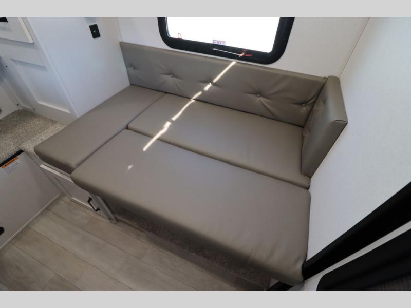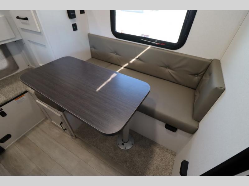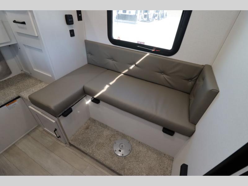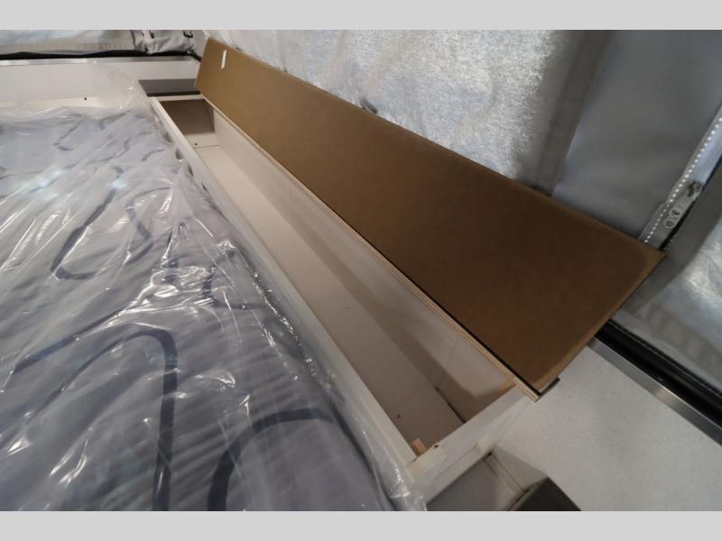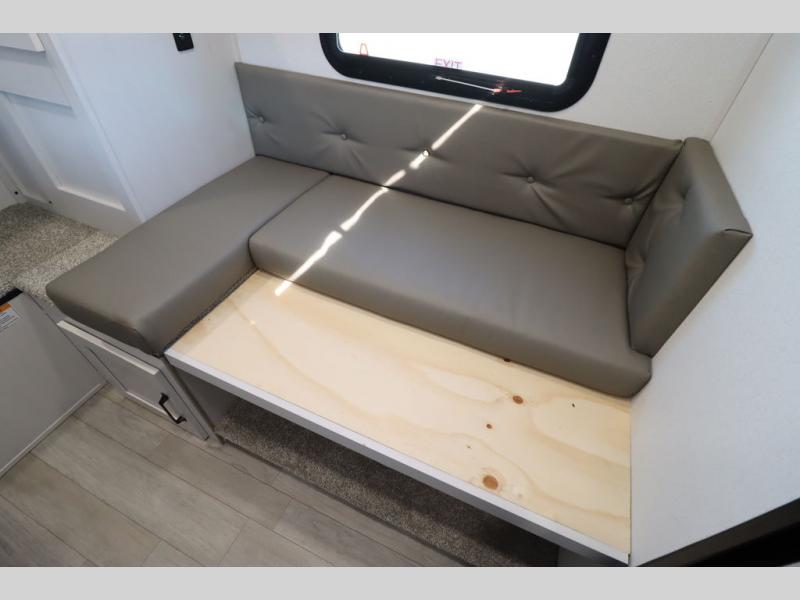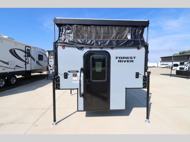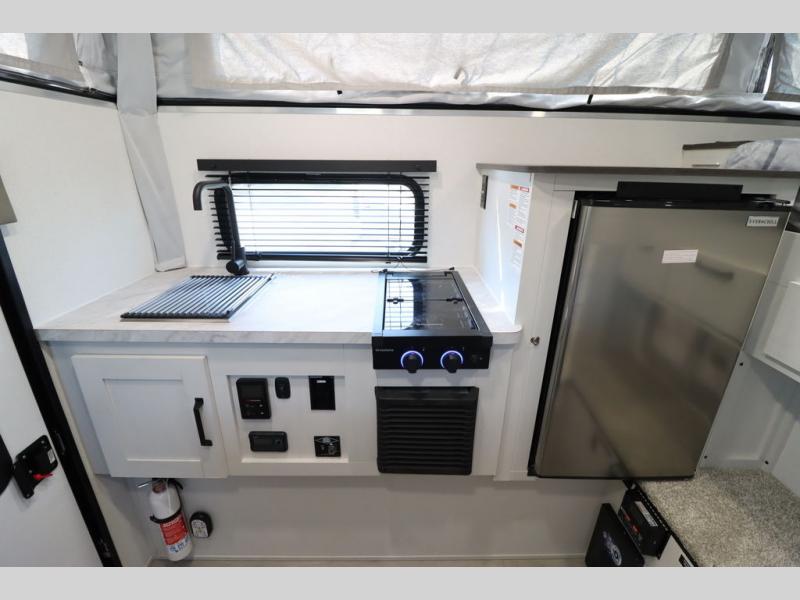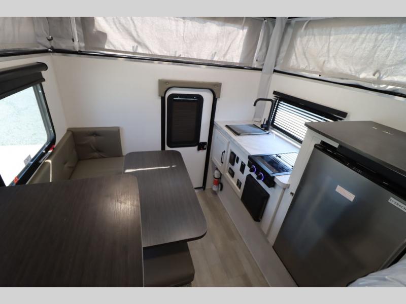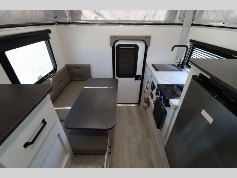 This soft side truck camper was built for 1/2 ton trucks with a 5' 6" to an 8' bed. Wake up feeling recharged after sleeping on the front queen bed with foot lockers and bedroom storage on either side of it. There is even a wardrobe for added storage. You can prepare your best meals with the two burner cooktop, and the refrigerator can hold perishables. Your meals can be enjoyed at the U-shaped seating area with a table and you can transform it into an extra sleeping space for a friend to join the fun!