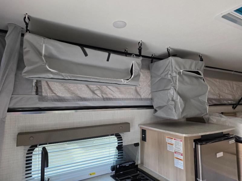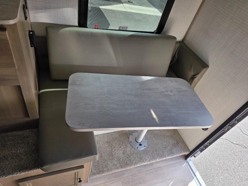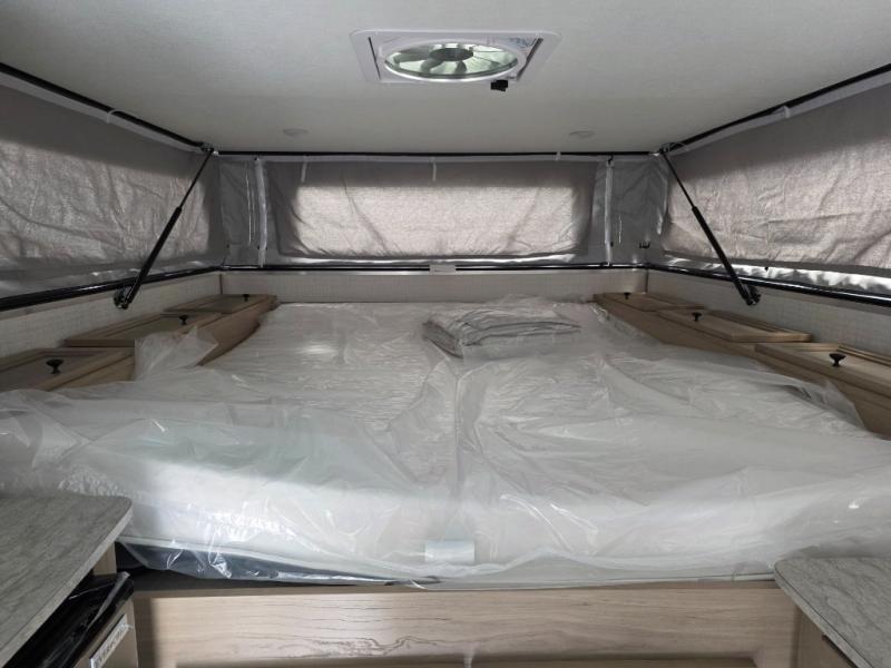 This soft side truck camper was built for 1/2 ton trucks with a 5' 6" to an 8' bed. Wake up feeling recharged after sleeping on the front queen bed with foot lockers and bedroom storage on either side of it. There is even a wardrobe for added storage. You can prepare your best meals with the two burner cooktop, and the refrigerator can hold perishables. Your meals can be enjoyed at the U-shaped seating area with a table and you can transform it into an extra sleeping space for a friend to join the fun!