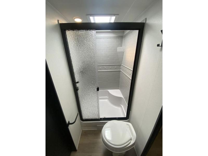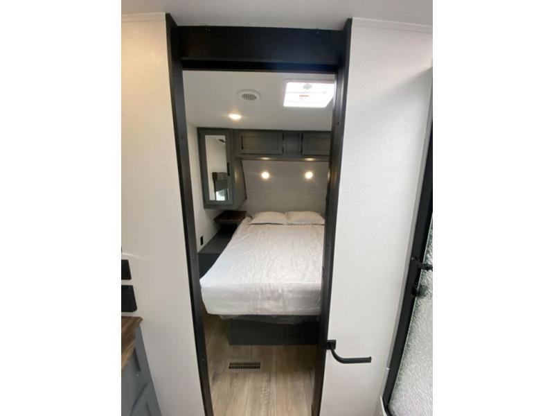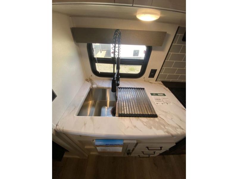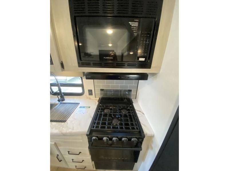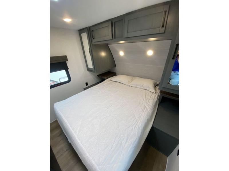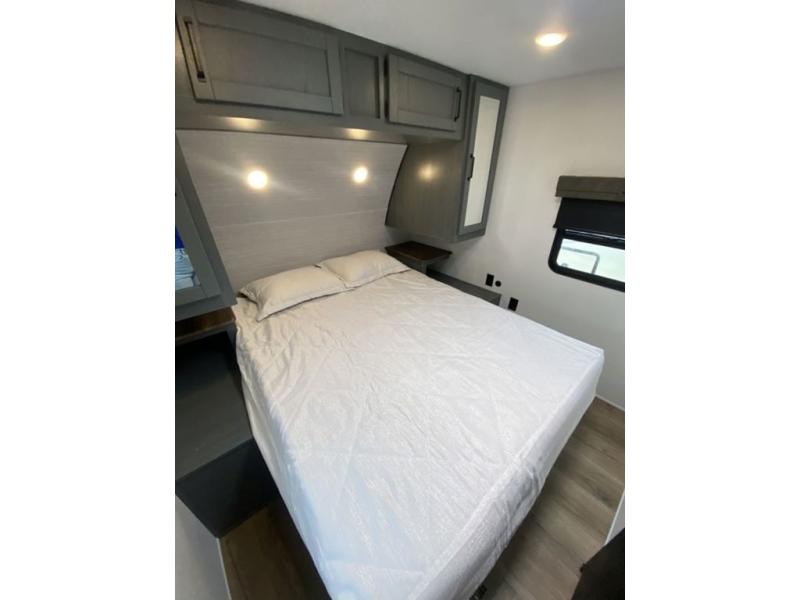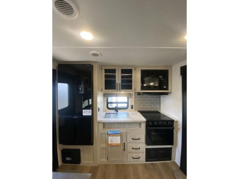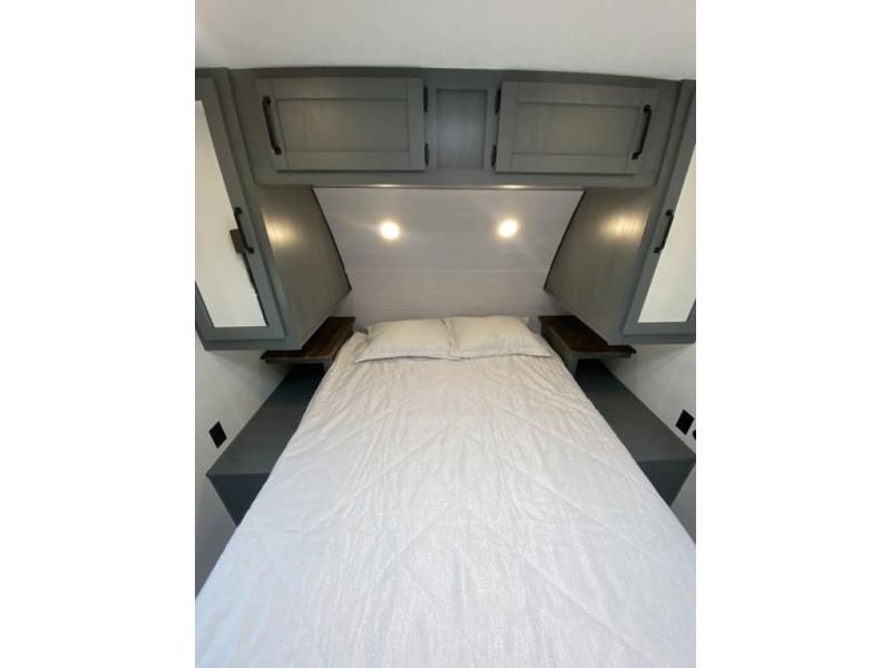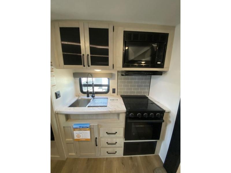 This rear kitchen travel trailer will be perfect for camping trips to the lake or woods! Once you've made breakfast on the stainless steel oven and range, you can dine at the booth dinette or take your plate outdoors to sit under the 18' electric awning. There is also a sofa slide out inside for a comfy place to relax. The walk-thru bath features a shower with a seat for added comfort, and you'll love having your own space in the front master bedroom. Here, you'll find a queen bed plus dual bedside closets to keep your things organized!