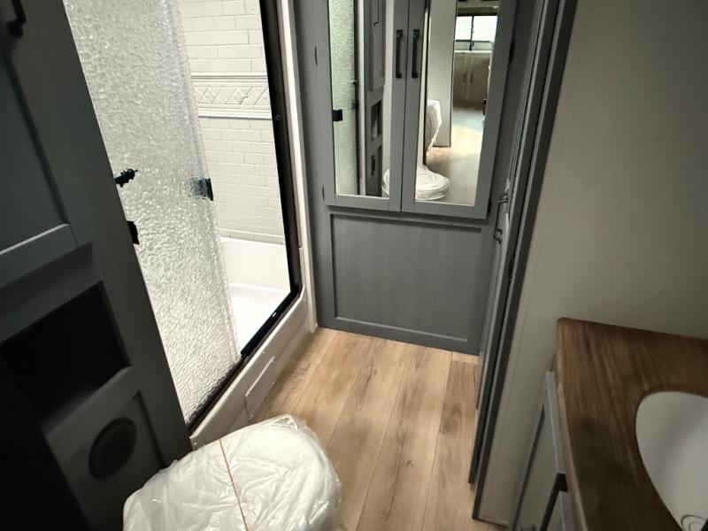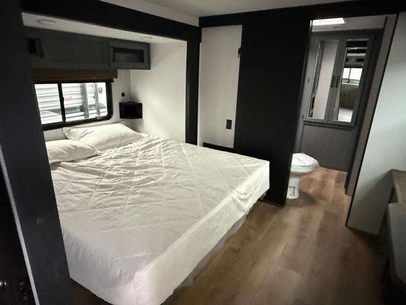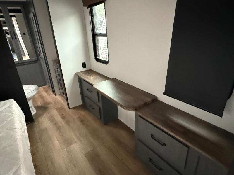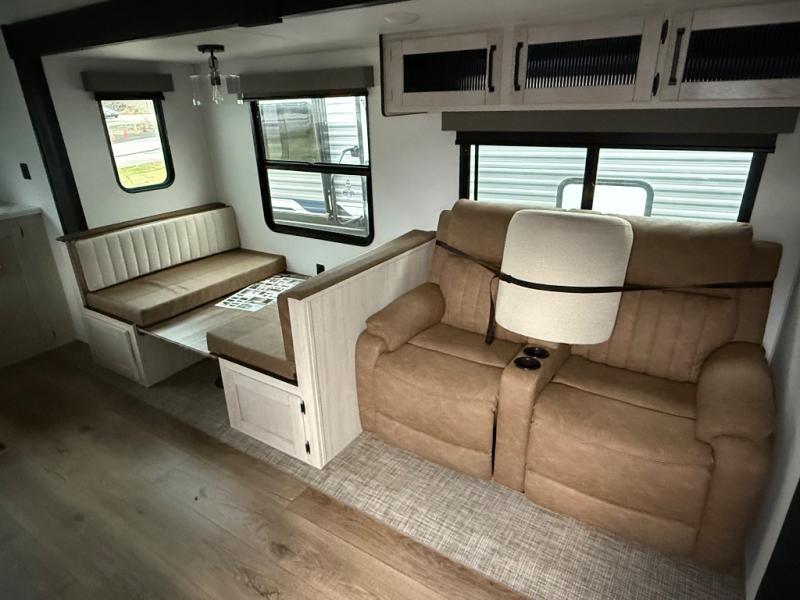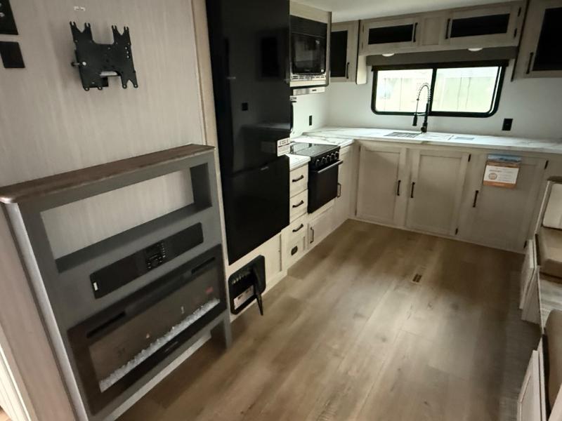You'll love camping in this double slide out travel trailer with a rear kitchen and a spacious front bath! There is a 40" shower here, along with a linen closet, shirt closet, plus a closet with washer/dryer prep. The master bedroom includes a king bed slide out, dual bedroom dressers, a desk and a TV hookup if you want the option to watch movies in bed. The combined kitchen and living area is made open by the large slide out, which houses the sofa and booth dinette. These pieces of furniture area conveniently across from the entertainment center and fireplace to make it feel more like home. The chef of your group will appreciate generous counter space in the rear kitchen, and if they like to cook outdoors, and optional mini kitchen with a griddle can be added!