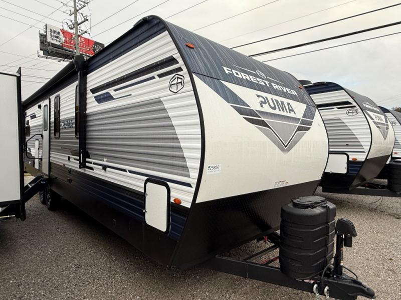 If you're looking for family-fun adventures then you need one of these Palomino Puma fifth wheels or travel trailers! They are built rugged, easy to tow, and jam packed with features. The Darco wrapped underbelly will protect your units vitals and the AlphaPly roofing membrane covers it. They also have new aluminum wheels and a powder coated steel I-beam frame. Inside, the Congoleum linoleum will be easy to keep clean, and the night roller shades will provide privacy when it's time to turn in. You'll also enjoy an electric awning with an LED light strip plus an AM/FM/Bluetooth stereo and two outside speakers to keep the party going!