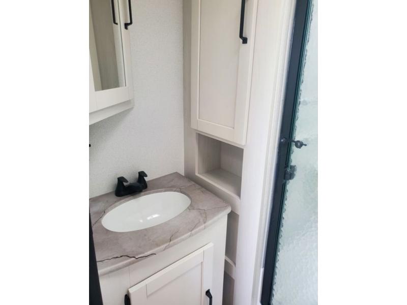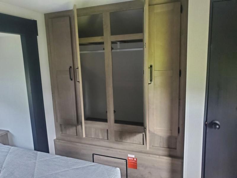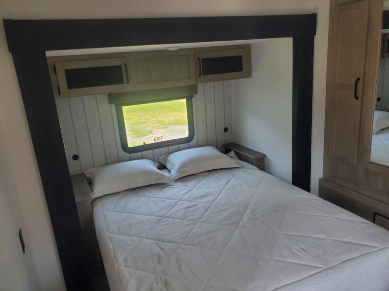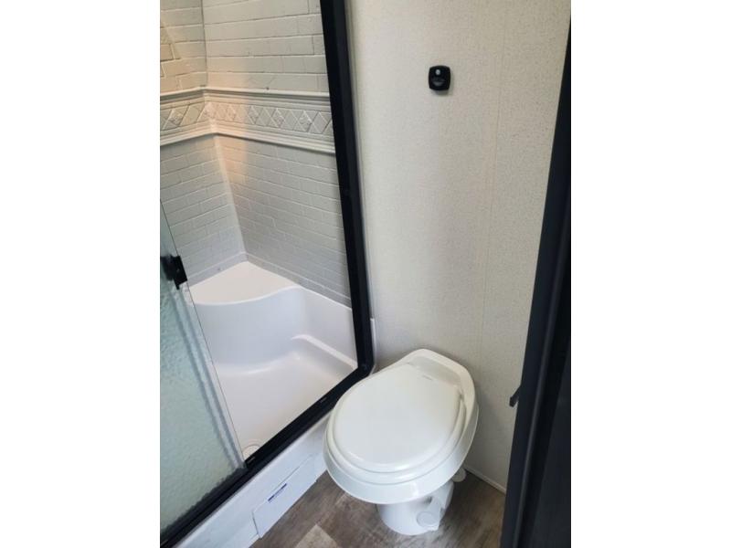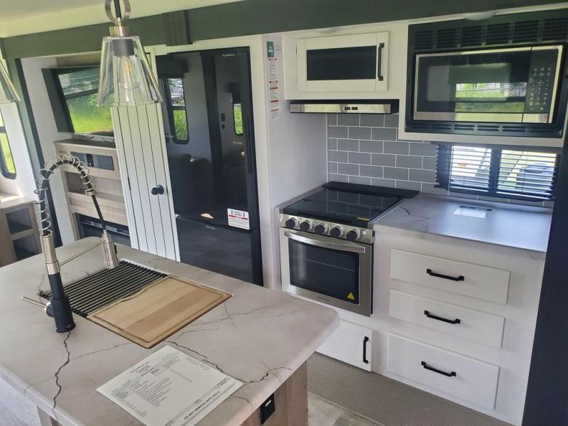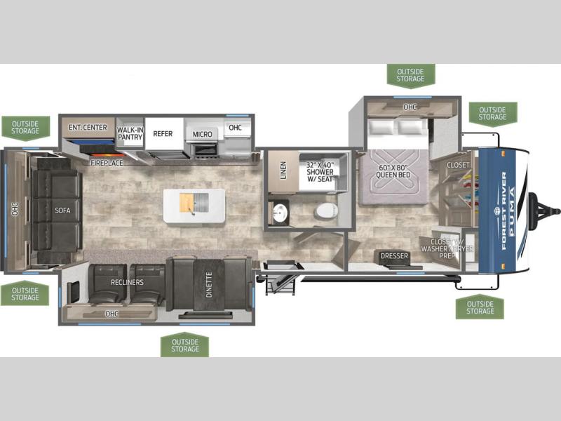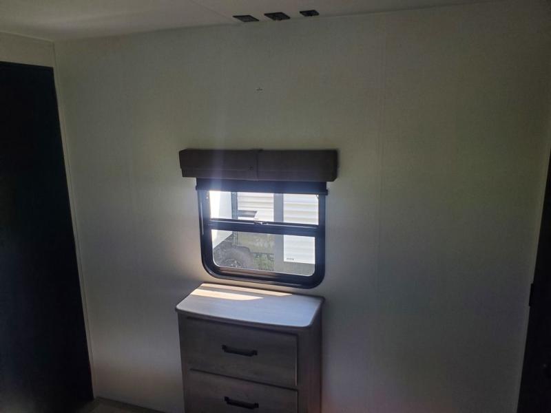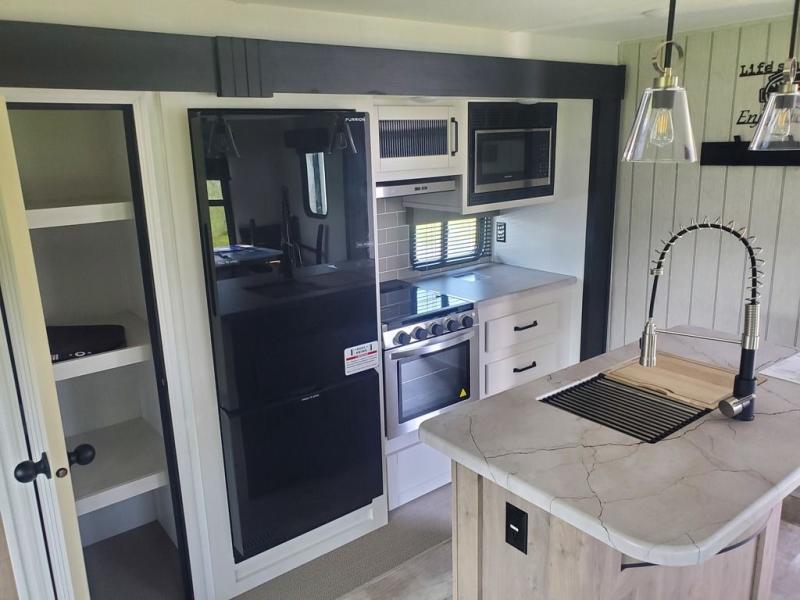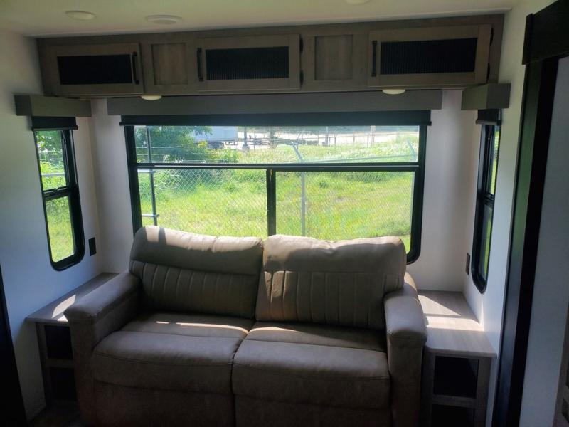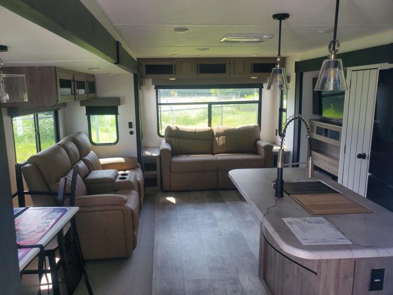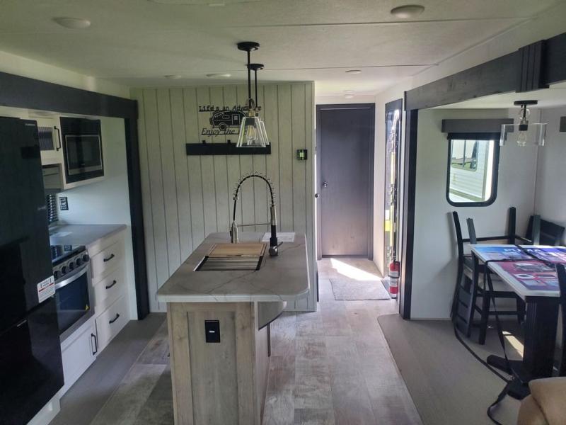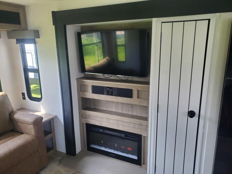 You're going to feel right at home in this travel trailer! The front private bedroom has a queen bed slide for a good night's rest, a dresser and front closet for your clothes, and another closet with washer and dryer prep. Freshen up each morning in the full bathroom with the 32" x 40" shower with a seat and then head to the kitchen to fry up some eggs on the stainless steel oven and range. You will also appreciate having a kitchen island for easier meal prep and a walk-in pantry to easily see your canned goods and snacks. The booth dinette offers a comfortable place to dine, play, and even sleep once converted. What better way to wind down your nights than to relax on either the rear sofa or in one of the two recliners across from the entertainment center with a fireplace!