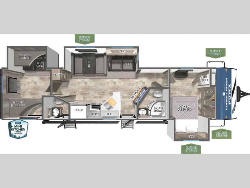 If you're looking for family-fun adventures then you need one of these Palomino Puma fifth wheels or travel trailers! They are built rugged, easy to tow, and jam packed with features. The Darco wrapped underbelly will protect your units vitals and the AlphaPly roofing membrane covers it. They also have new aluminum wheels and a powder coated steel I-beam frame. Inside, the Congoleum linoleum will be easy to keep clean, and the night roller shades will provide privacy when it's time to turn in. You'll also enjoy an electric awning with an LED light strip plus an AM/FM/Bluetooth stereo and two outside speakers to keep the party going!