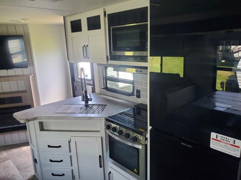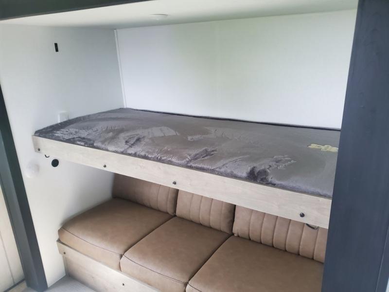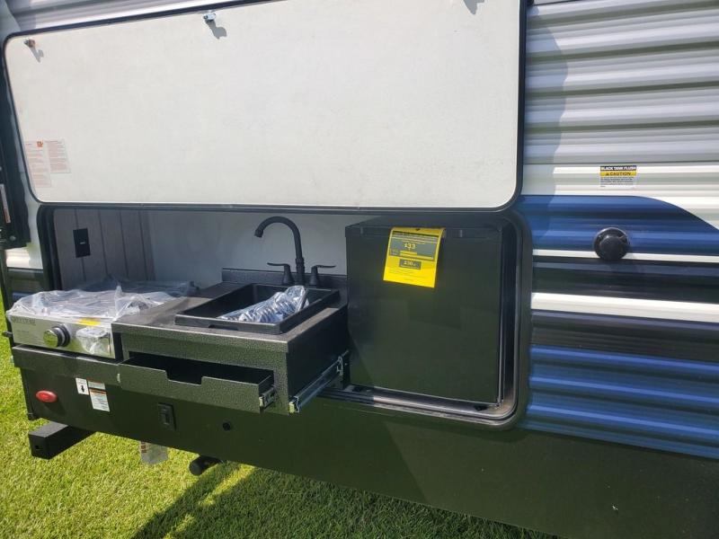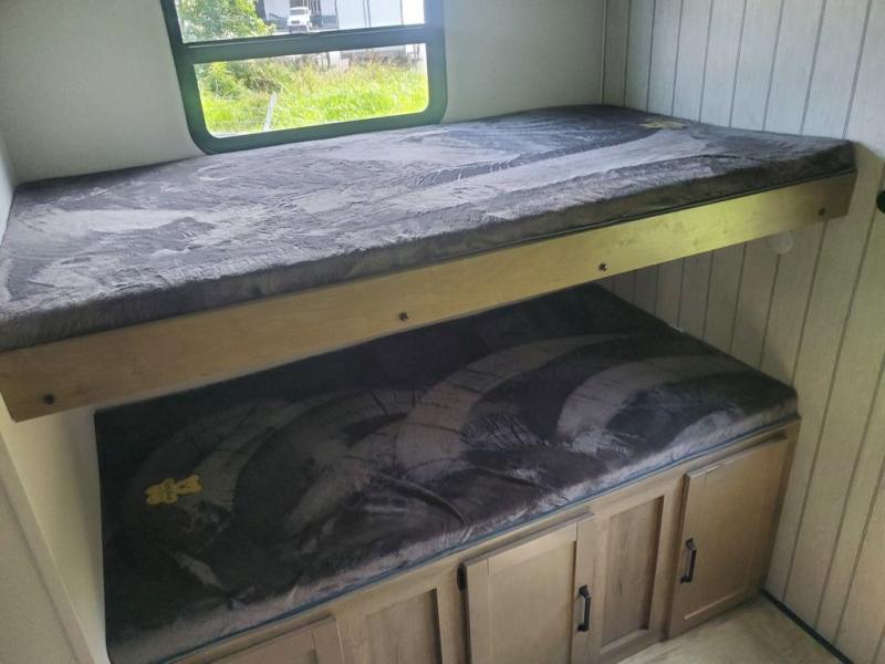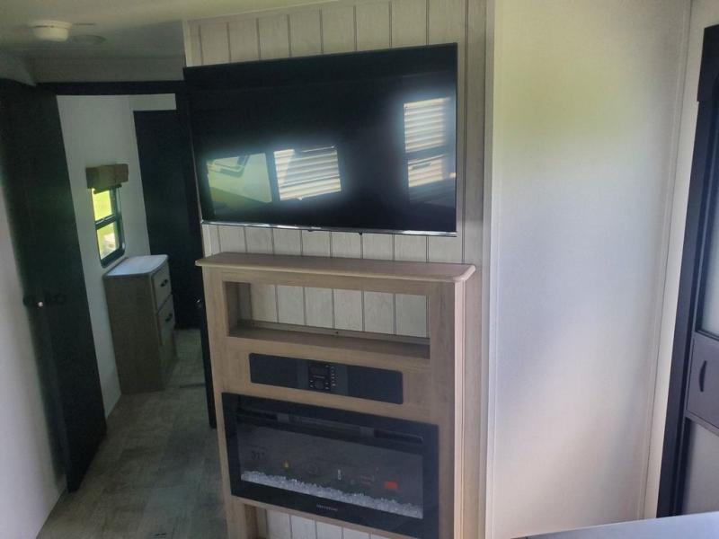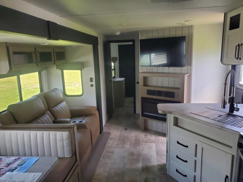 With dual entry doors and a bath and a half, you will have the ultimate in convenience with this travel trailer! The bedroom also has a front closet to keep your clothes looking their best and a queen bed slide for you to sleep your best. Everyone can freshen up in the full bathroom with the 34" x 34" radius shower and fill their bellies with scrambled eggs cooked with the stainless steel oven and range. Enjoy your meals, play games, and even sleep at the booth dinette or relax on the sofa while watching a movie with the entertainment center and fireplace. And your guests will love the rear private bunkhouse with three bunks, a jiffy sofa, and a slide out for more space! This model also includes an optional outside mini kitchen with a griddle!
