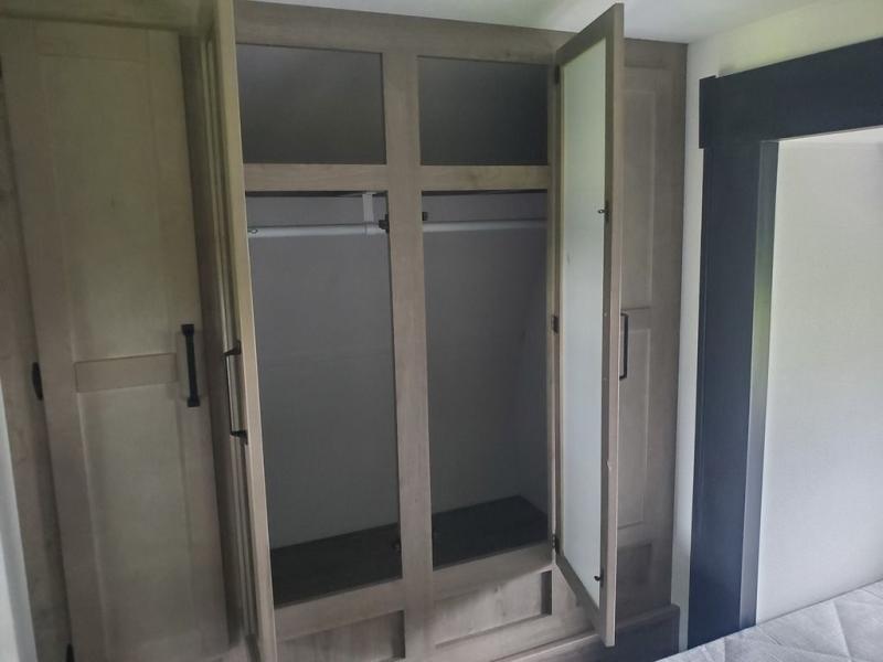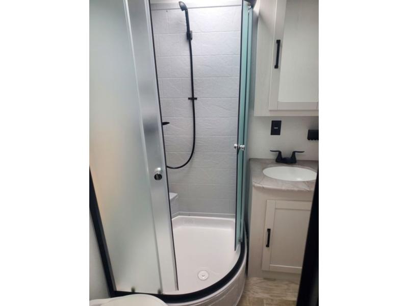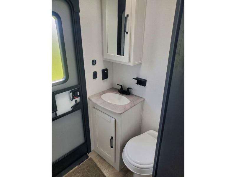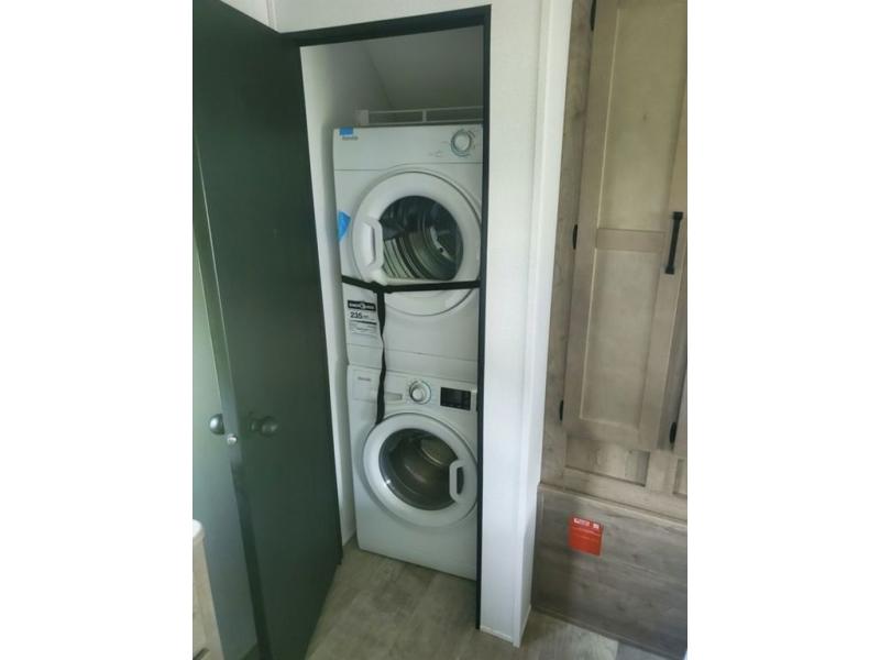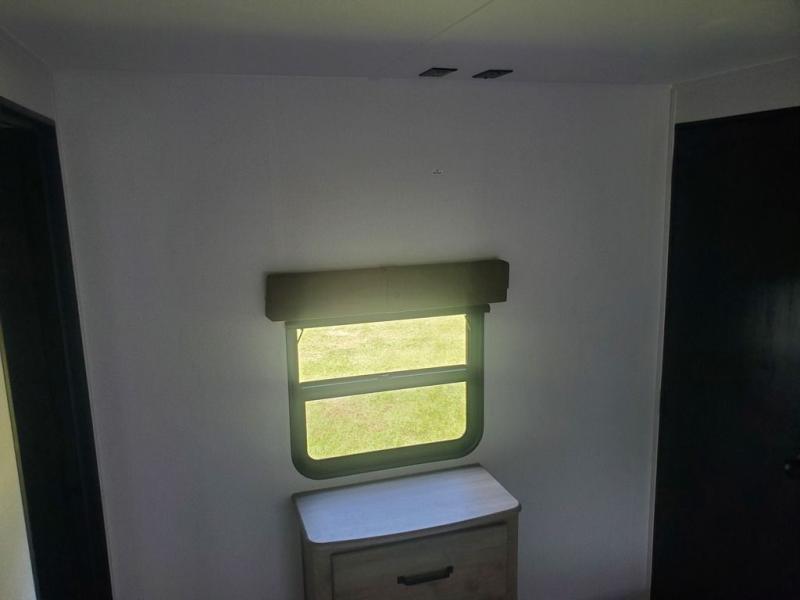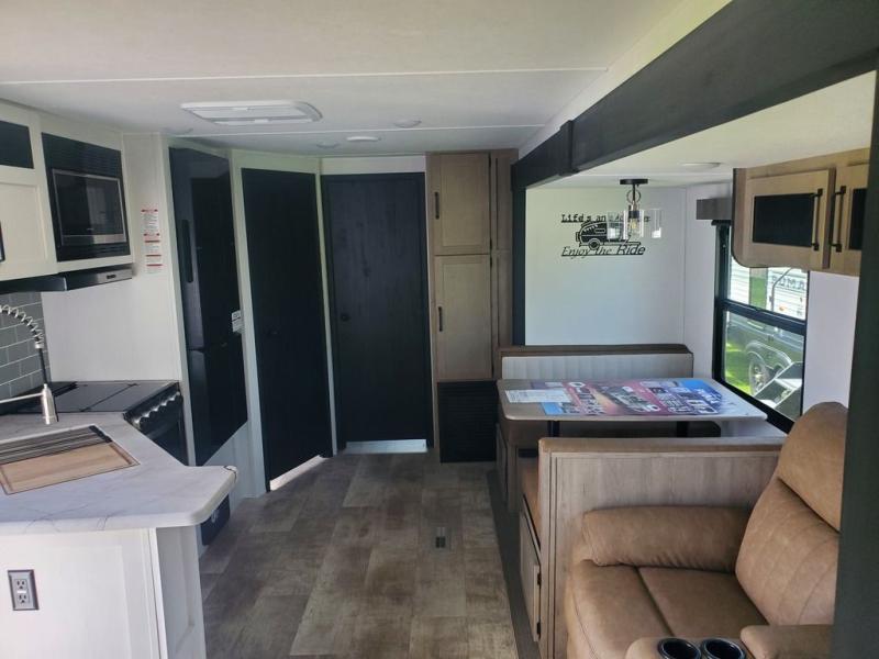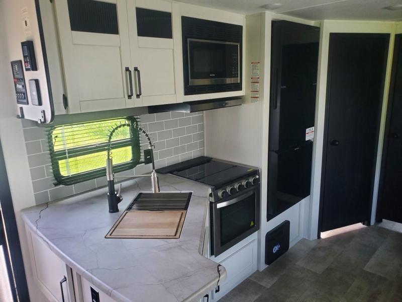 With dual entry doors and a bath and a half, you will have the ultimate in convenience with this travel trailer! The bedroom also has a front closet to keep your clothes looking their best and a queen bed slide for you to sleep your best. Everyone can freshen up in the full bathroom with the 34" x 34" radius shower and fill their bellies with scrambled eggs cooked with the stainless steel oven and range. Enjoy your meals, play games, and even sleep at the booth dinette or relax on the sofa while watching a movie with the entertainment center and fireplace. And your guests will love the rear private bunkhouse with three bunks, a jiffy sofa, and a slide out for more space! This model also includes an optional outside mini kitchen with a griddle!