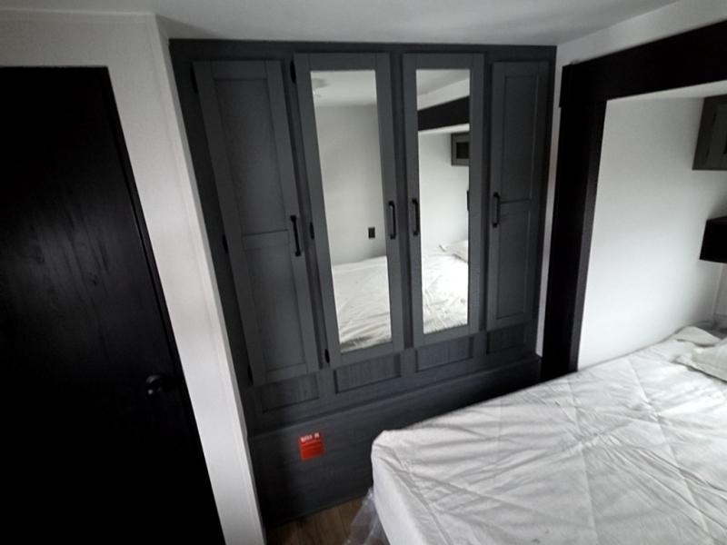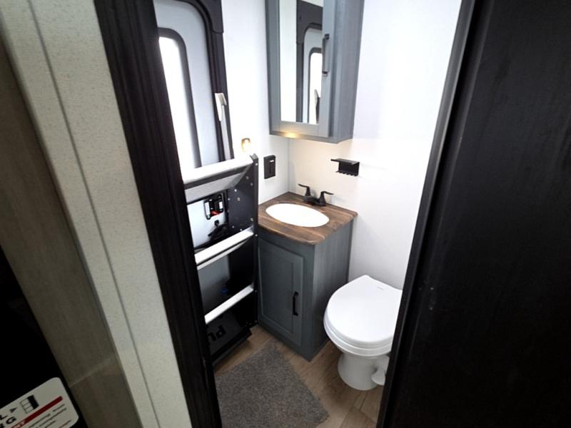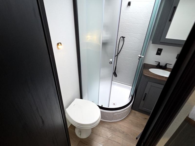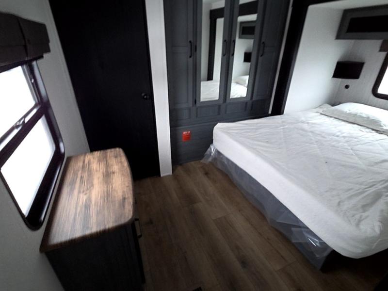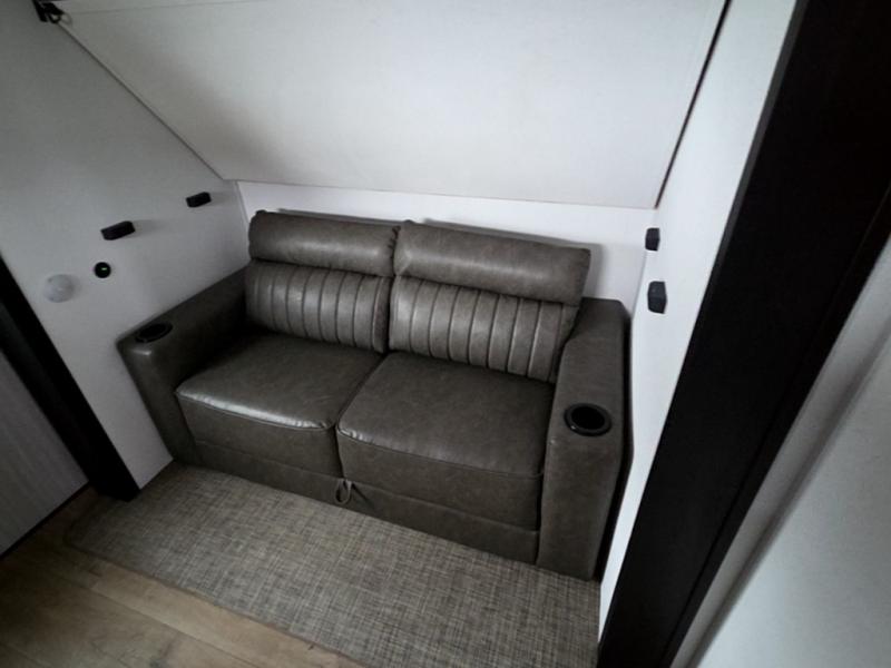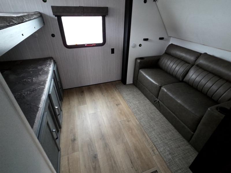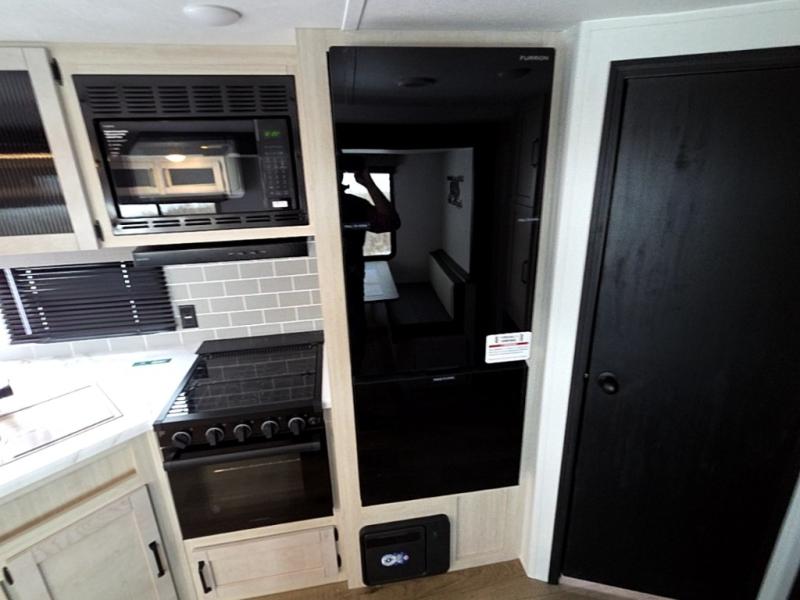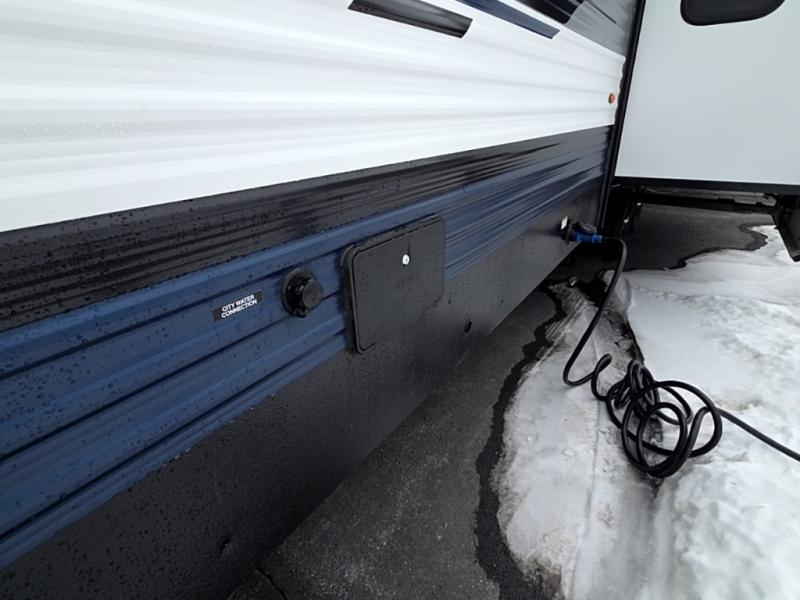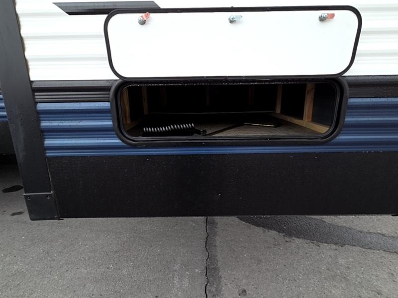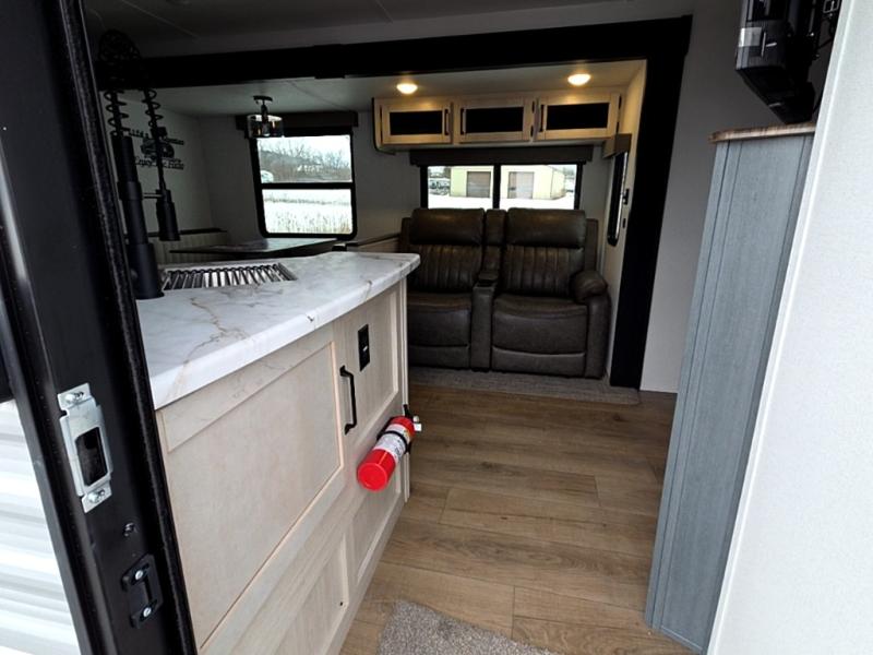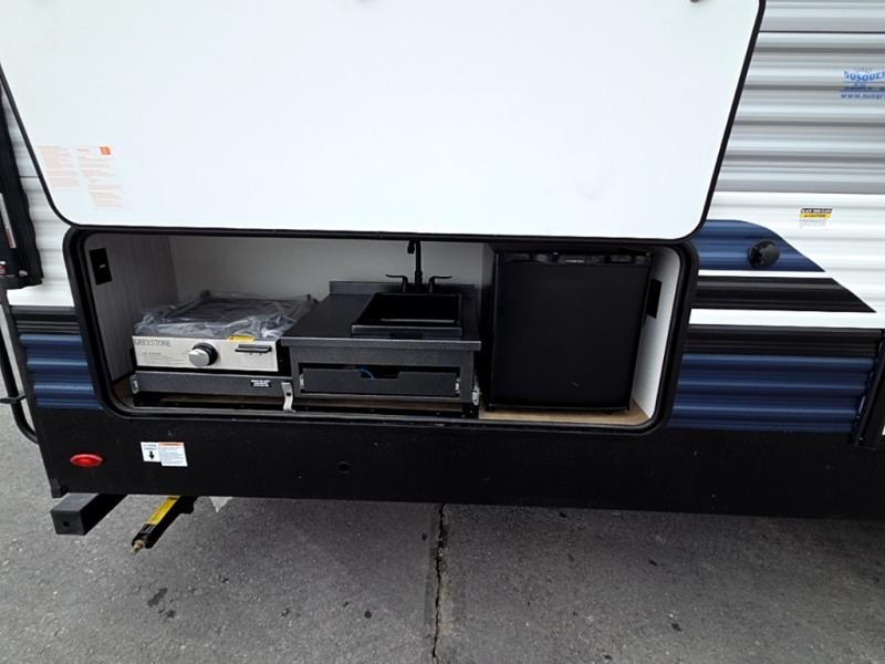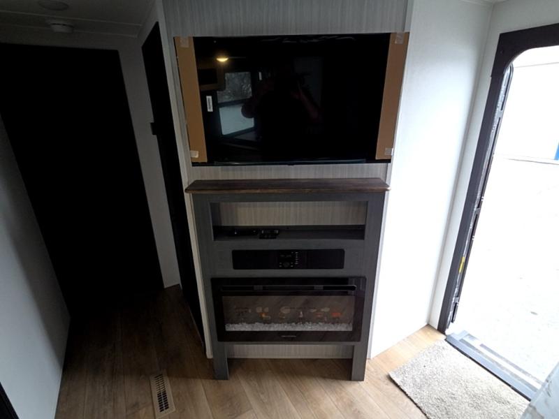 With dual entry doors and a bath and a half, you will have the ultimate in convenience with this travel trailer! The bedroom also has a front closet to keep your clothes looking their best and a queen bed slide for you to sleep your best. Everyone can freshen up in the full bathroom with the 34" x 34" radius shower and fill their bellies with scrambled eggs cooked with the stainless steel oven and range. Enjoy your meals, play games, and even sleep at the booth dinette or relax on the sofa while watching a movie with the entertainment center and fireplace. And your guests will love the rear private bunkhouse with three bunks, a jiffy sofa, and a slide out for more space! This model also includes an optional outside mini kitchen with a griddle!