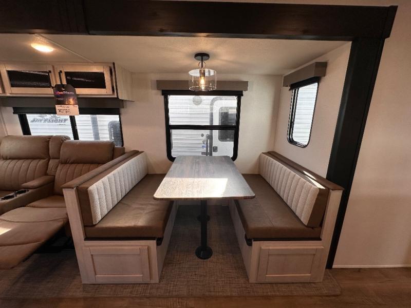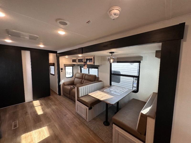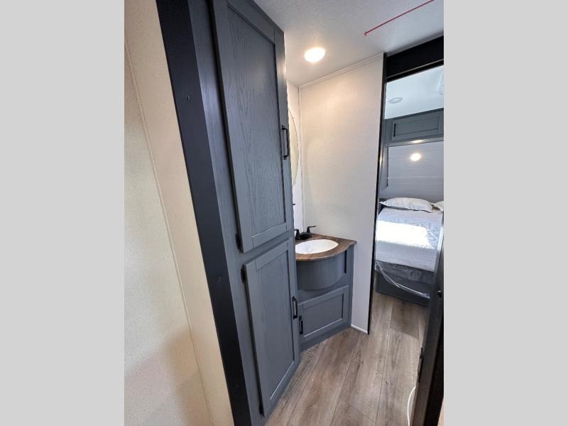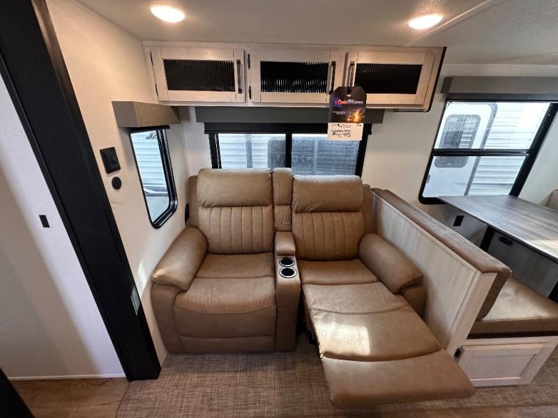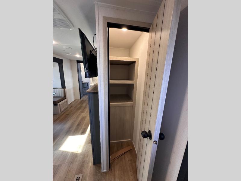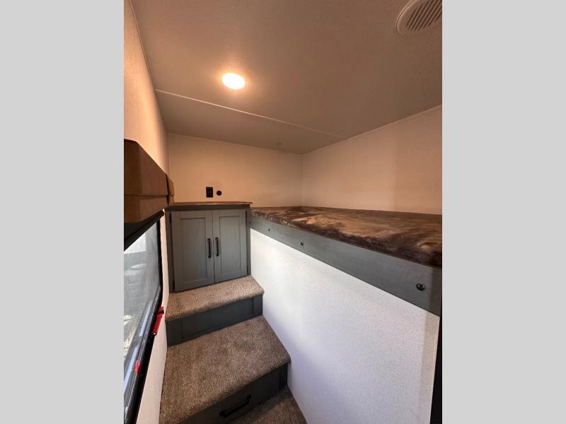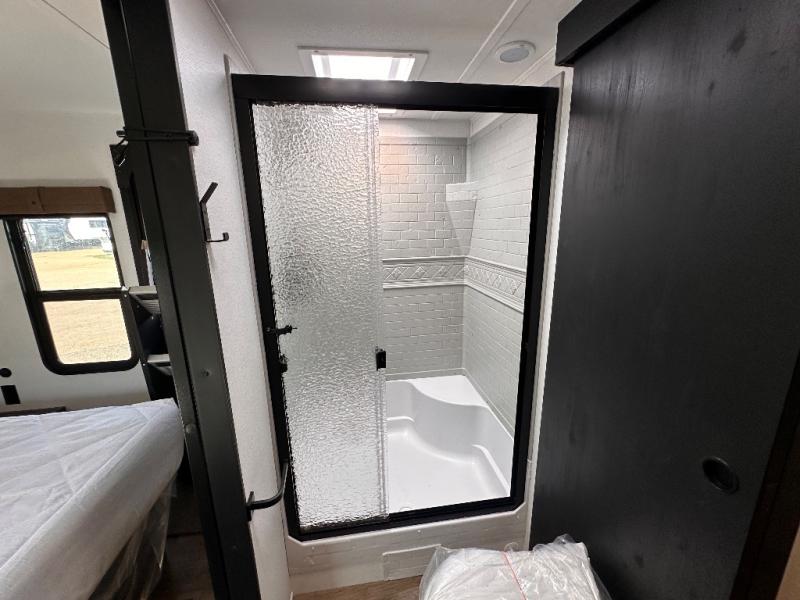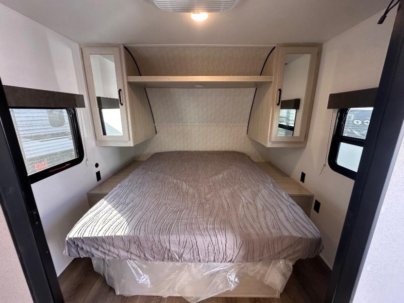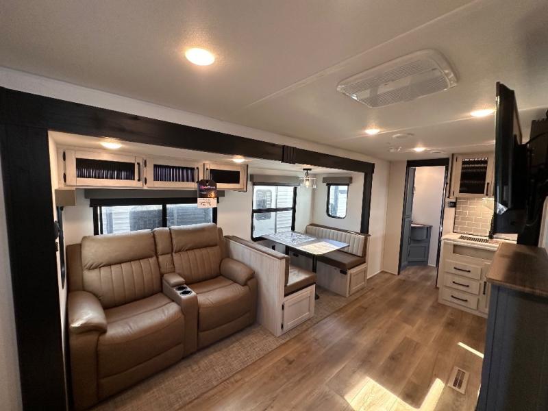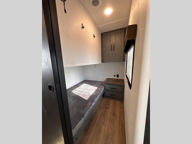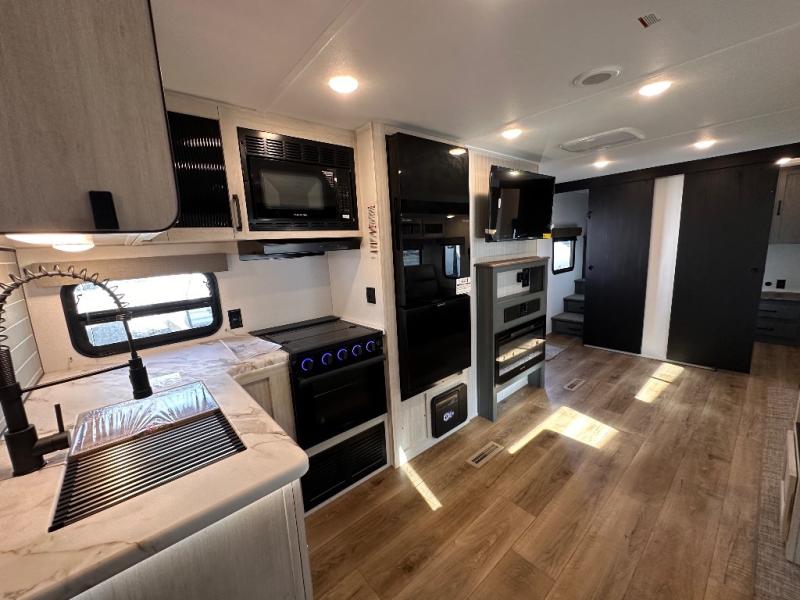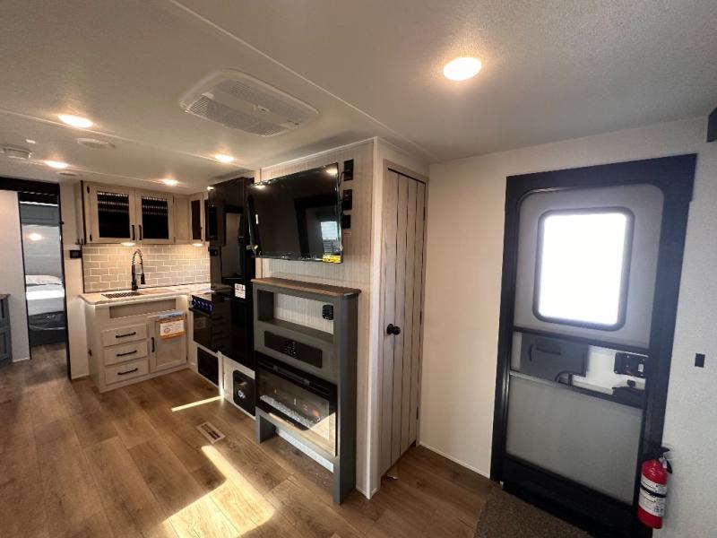 This travel trailer is perfect for camping with a larger group of friends or if you have older kids since there are two private bunkrooms! Each room includes a bunk bed and storage space for clothes, shoes, and more. You'll enjoy your own space up front in the master bedroom that includes a queen bed, dual shirt closets, and one of the dual entry doors to the unit for added convenience. Everyone can come together in the combined living area and kitchen that includes a large slide out with a sofa and booth dinette, plus there is a fireplace to make this space feel more like home. A full kitchen inside lets you create home-cooked meals each day, and you can choose to add the optional micro kitchen with a griddle for a pancake breakfast outdoors!
