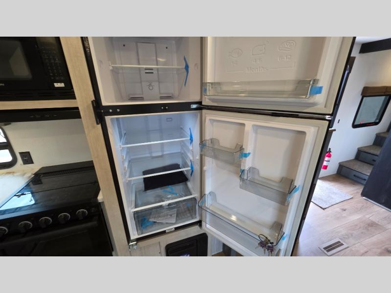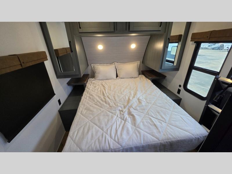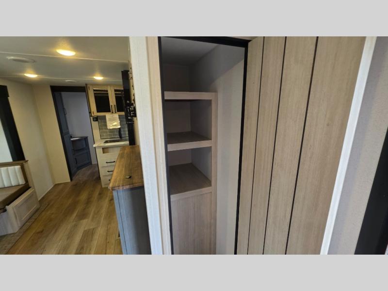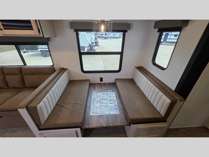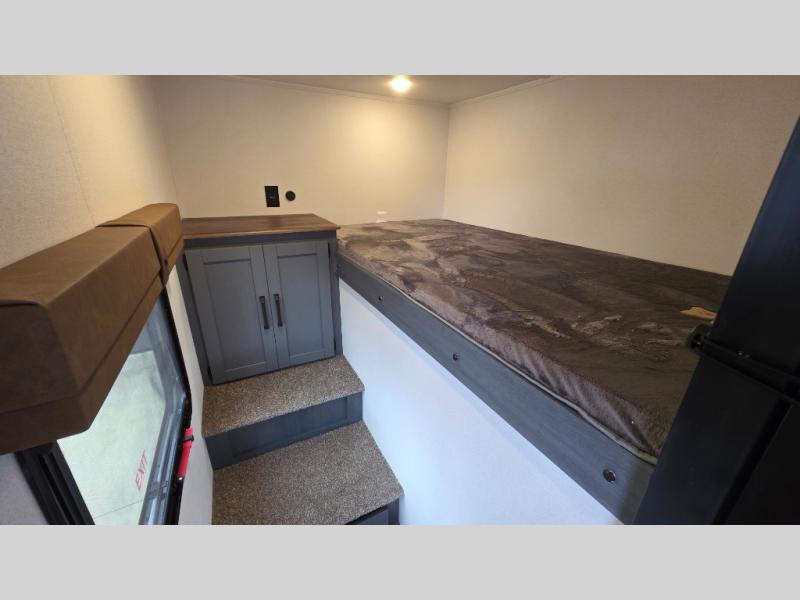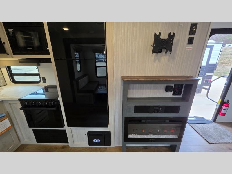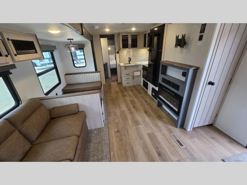 This travel trailer is perfect for camping with a larger group of friends or if you have older kids since there are two private bunkrooms! Each room includes a bunk bed and storage space for clothes, shoes, and more. You'll enjoy your own space up front in the master bedroom that includes a queen bed, dual shirt closets, and one of the dual entry doors to the unit for added convenience. Everyone can come together in the combined living area and kitchen that includes a large slide out with a sofa and booth dinette, plus there is a fireplace to make this space feel more like home. And a full kitchen lets you create home-cooked meals each day.