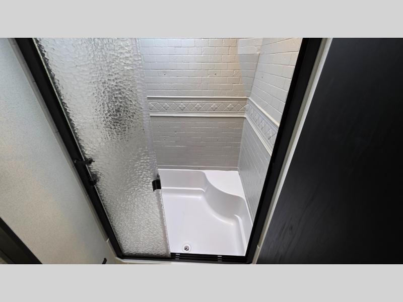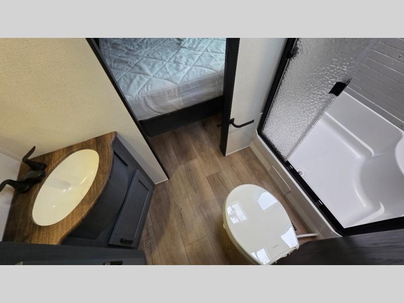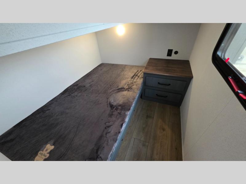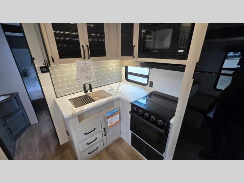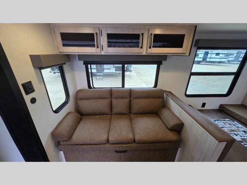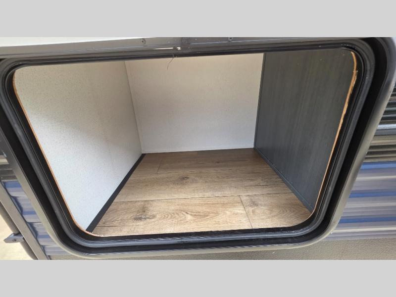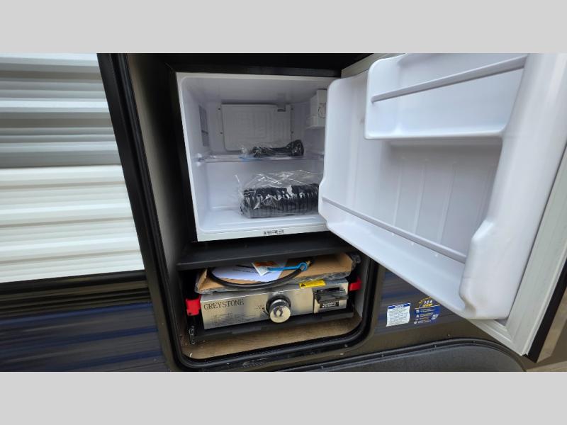This travel trailer is perfect for camping with a larger group of friends or if you have older kids since there are two private bunkrooms! Each room includes a bunk bed and storage space for clothes, shoes, and more. You'll enjoy your own space up front in the master bedroom that includes a queen bed, dual shirt closets, and one of the dual entry doors to the unit for added convenience. Everyone can come together in the combined living area and kitchen that includes a large slide out with a sofa and booth dinette, plus there is a fireplace to make this space feel more like home. And a full kitchen lets you create home-cooked meals each day.