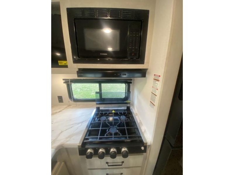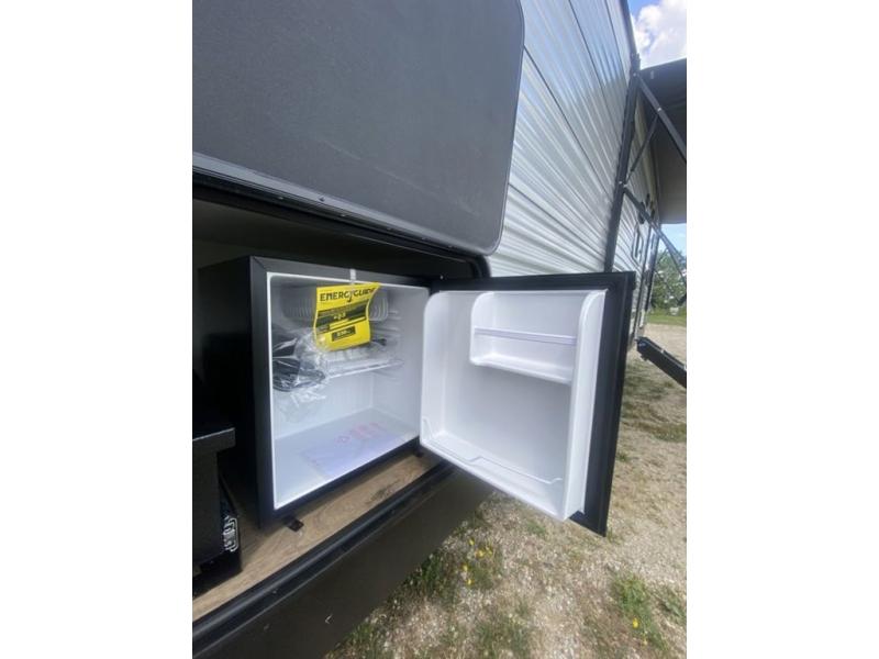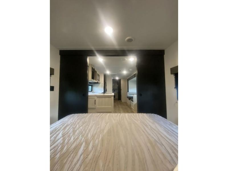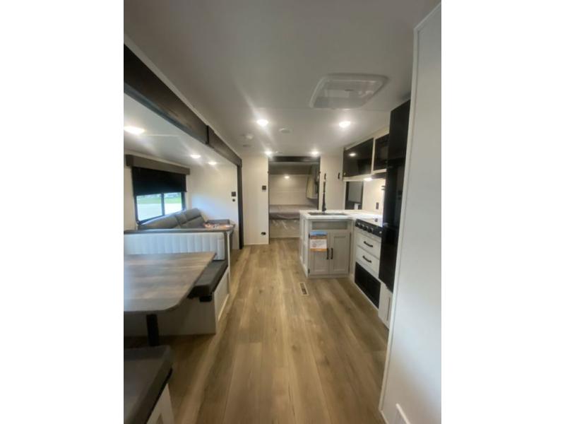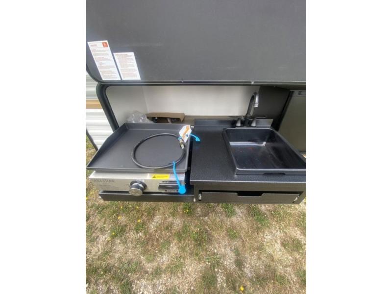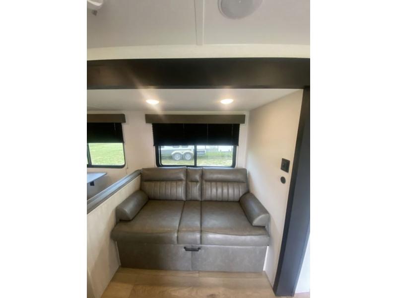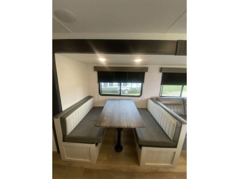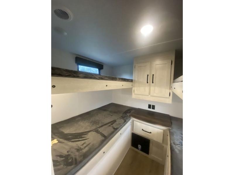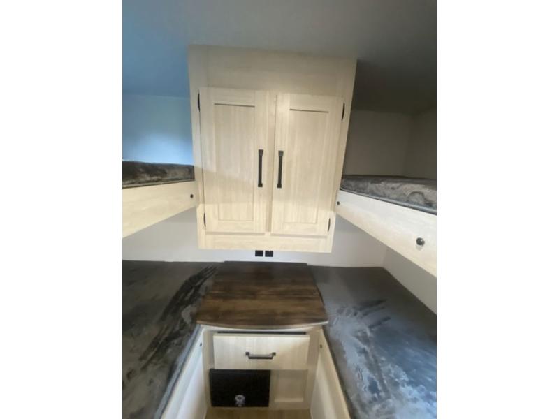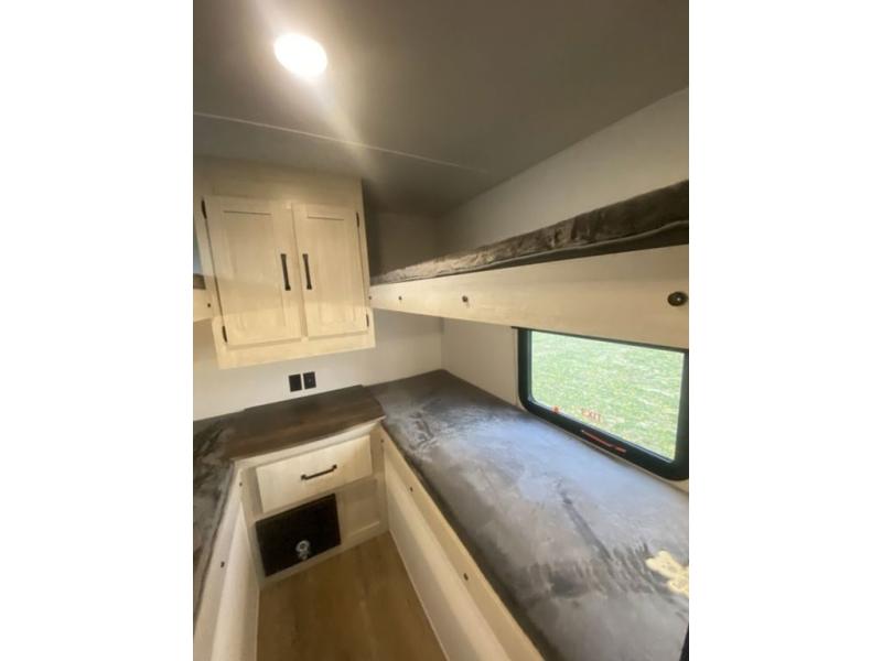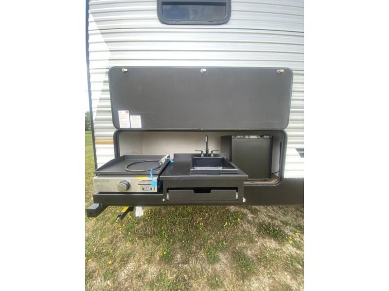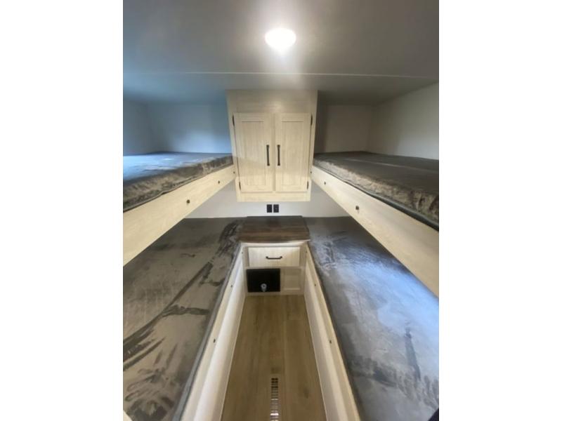 If you're looking for more space, this double axle unit features a large slide so you can walk about freely. Here, you'll find the booth dinette and sofa, which sit across from the optional TV if you want to enjoy movie nights. The full kitchen includes a stainless microwave and three burner cooktop to make meals, plus a pantry and 12V refrigerator for food storage. And an optional outside kitchen with a griddle can be added if you enjoy cooking outdoors! Your guests or littles are sure to enjoy the rear private bunkhouse with four bunk beds and a wardrobe for their things!