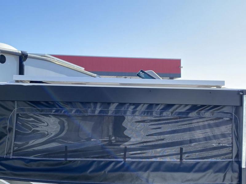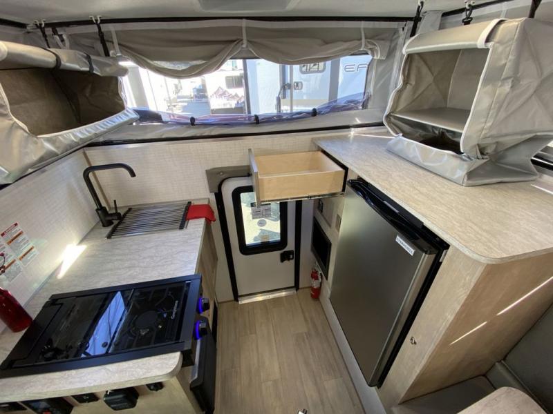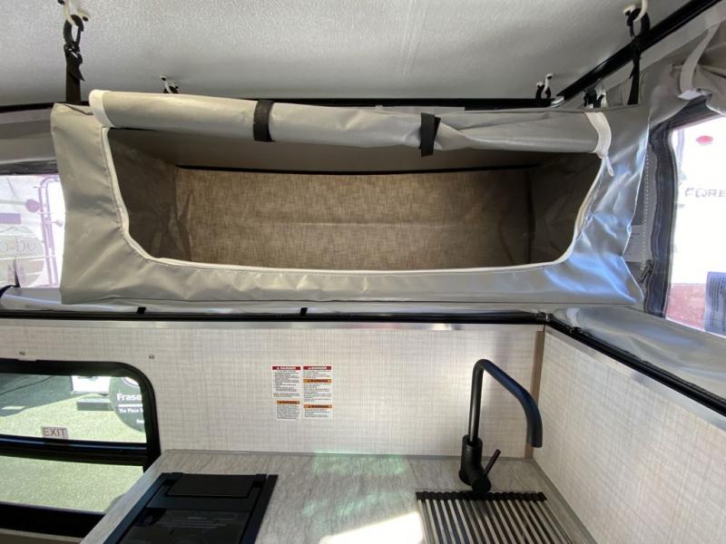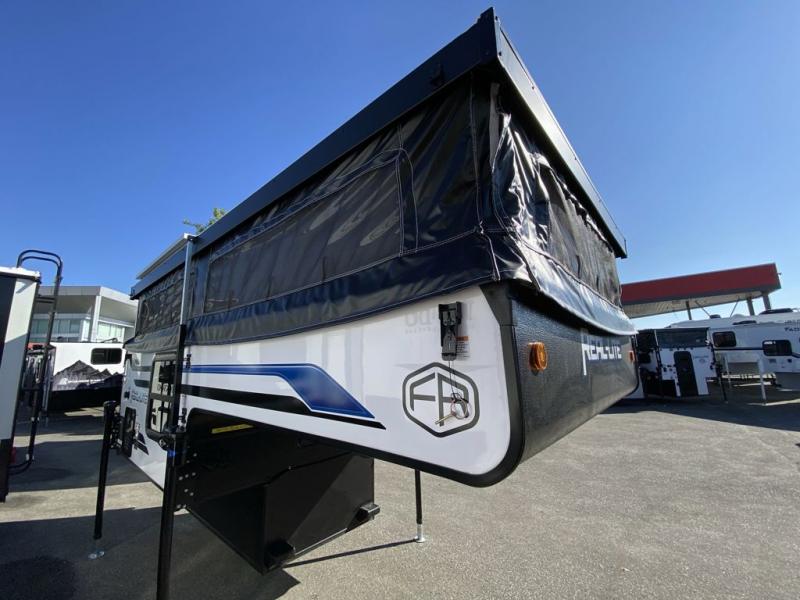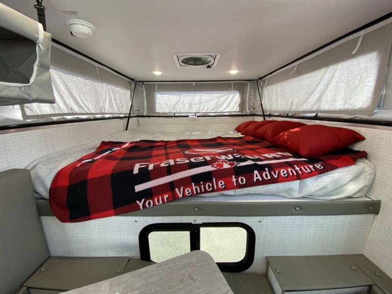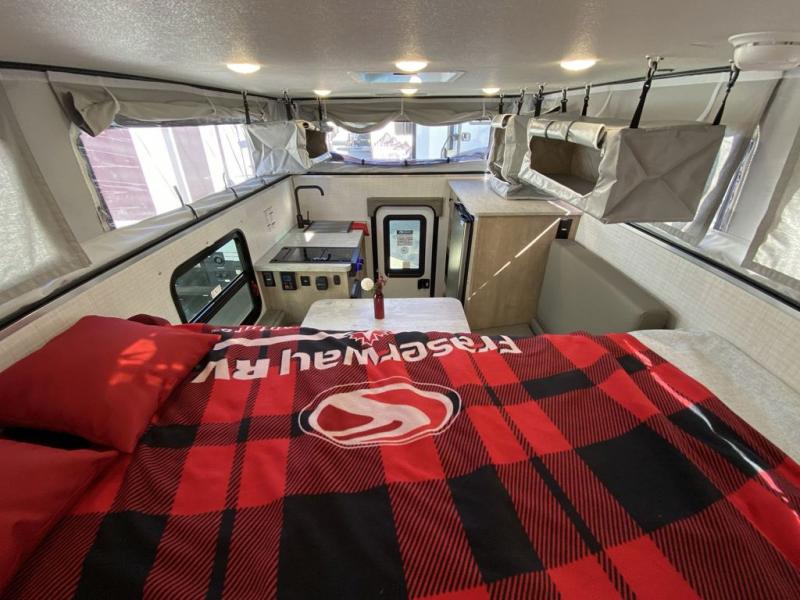Designed for compact trucks, this soft side truck camper is your ticket to freedom and adventure. The electric roof lift will provide hassle-free set up, and the one-piece door will allow you to easily enter your camper. You can start lunch on the two-burner cooktop once you arrive at your destination, grab a cold drink from the 12V refrigerator, and dine around the U-shaped dinette. The best thing about not sleeping in a tent is having your own 66" x 75" bed and you'll enjoy just that in this truck camper!