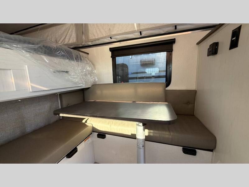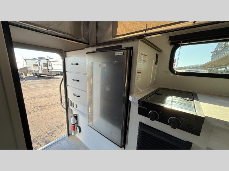 This soft side truck camper is ideal for your 1/2-ton truck with a 6' 6" bed with an overhang. The queen bed up front will allow you to take a rest after driving all day, and you can even freshen up in the wet bath before heading outdoors for some fresh air. Prepare your meals on the two-burner cooktop, dine at the L-shaped dinette, then clean up using the full sink. This model also includes a 12V refrigerator, plus storage space for food or valuables.