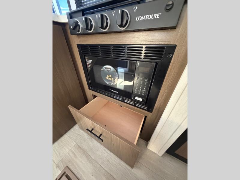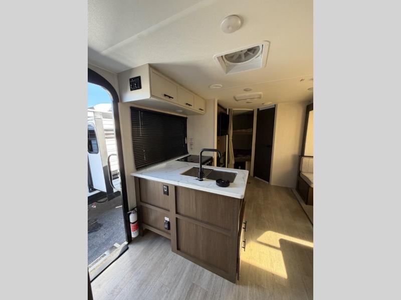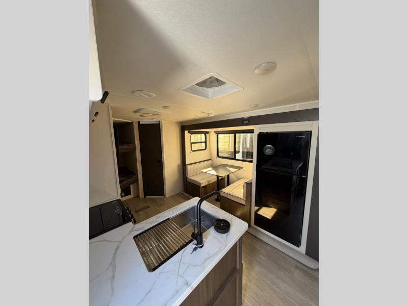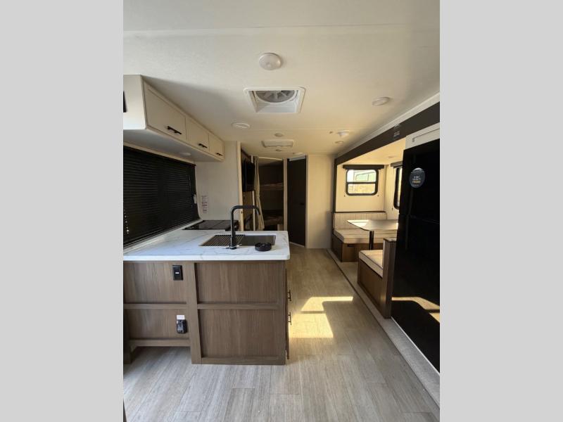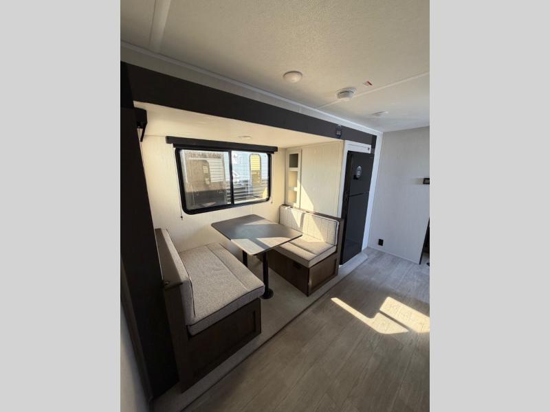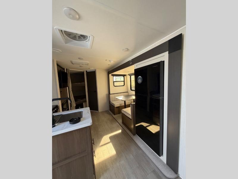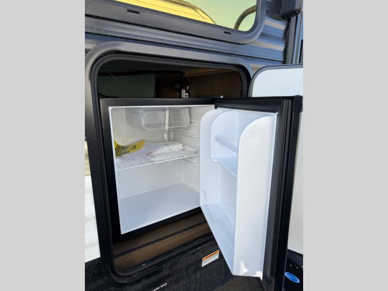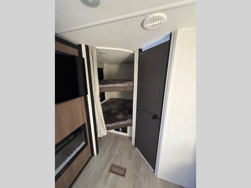 You'll appreciate the added sleeping space in this unit with double-size bunks! You'll have your own space up front in the private bedroom, complete with a camp king bed and storage for your things, and if you need even more sleeping space, the dinette can be used as well. The chef of your group will find a three-burner cooktop and a built-in convection microwave with an air fryer to cook meals, plus there is a 12V refrigerator and large hidden pantry for food storage. This unit also includes a power awning outdoors and an outside refrigerator to keep cold drinks close by.