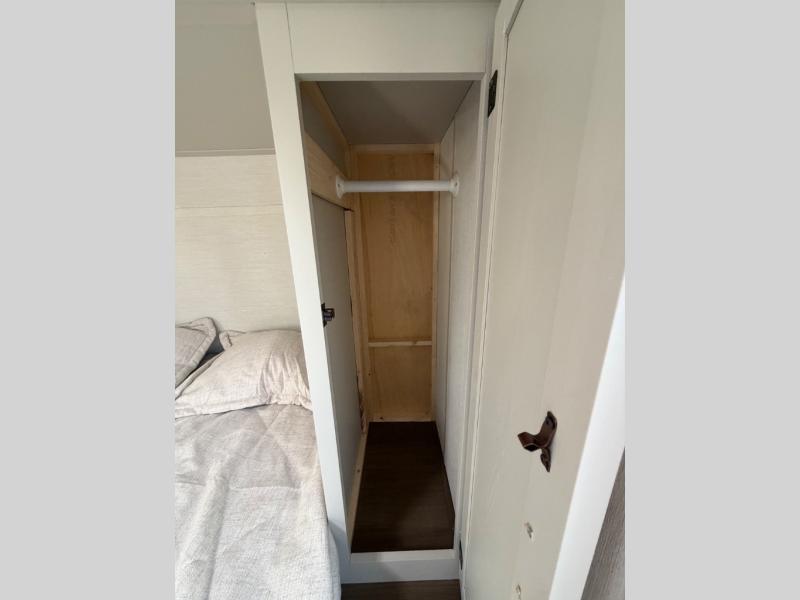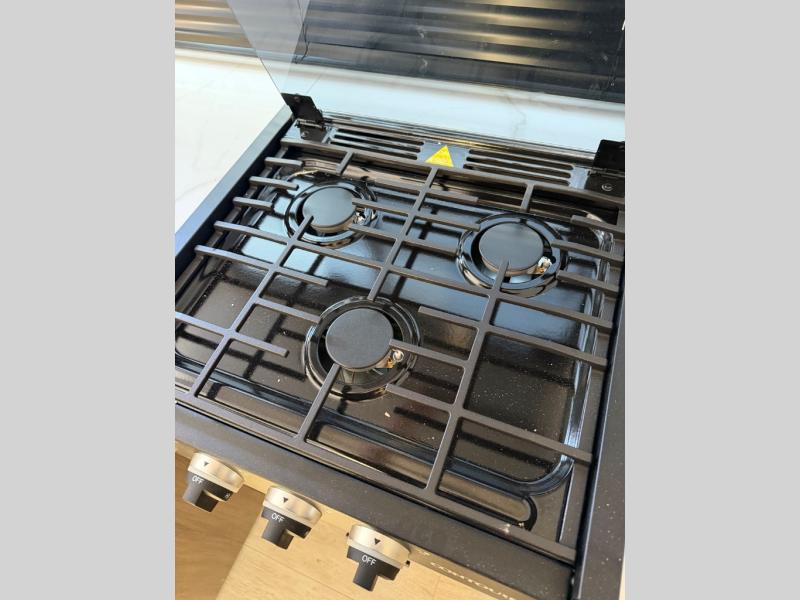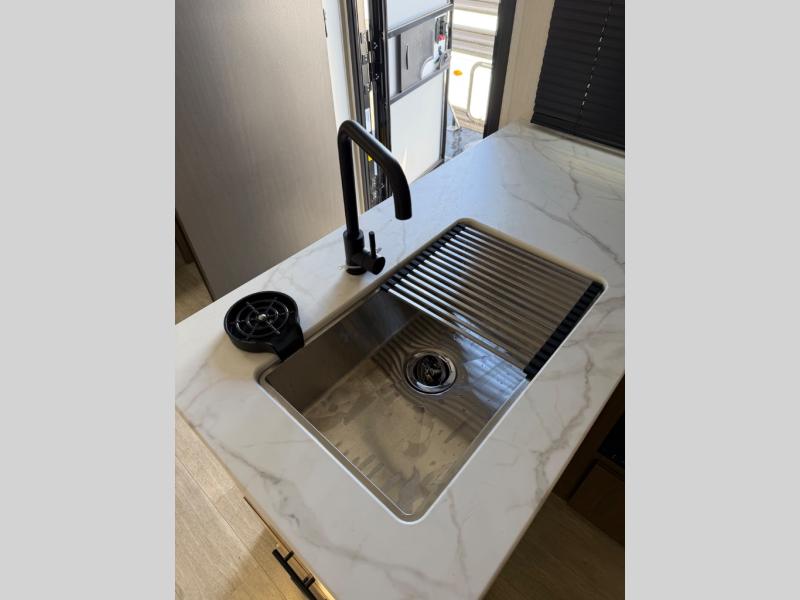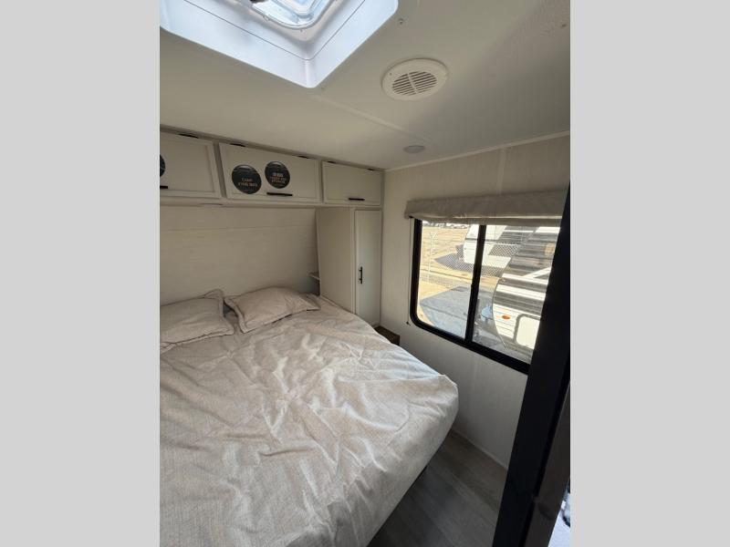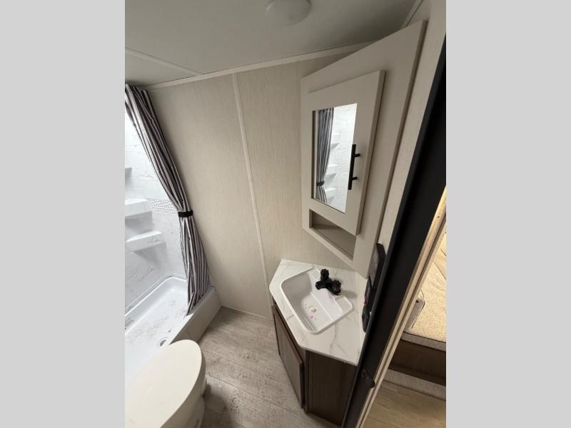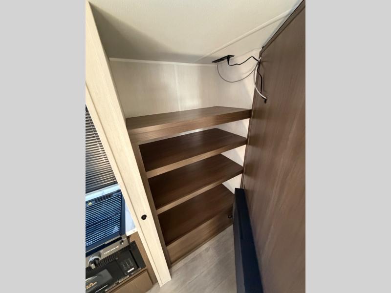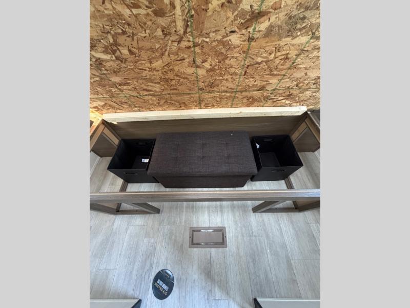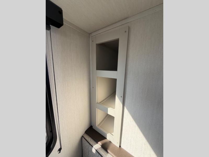You'll appreciate the added sleeping space in this unit with double-size bunks! You'll have your own space up front in the private bedroom, complete with a camp king bed and storage for your things, and if you need even more sleeping space, the dinette can be used as well. The chef of your group will find a three-burner cooktop and a built-in convection microwave with an air fryer to cook meals, plus there is a 12V refrigerator and large hidden pantry for food storage. This unit also includes a power awning outdoors and an outside refrigerator to keep cold drinks close by.