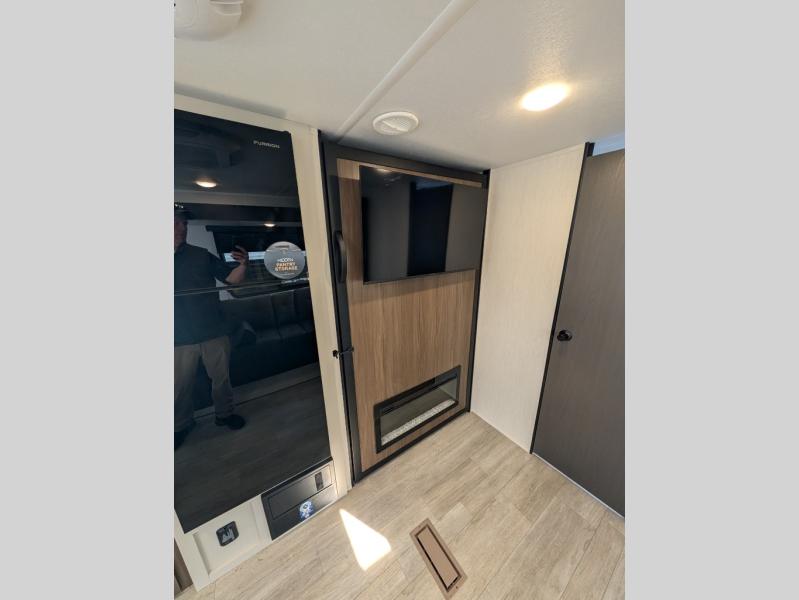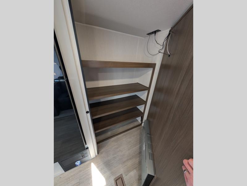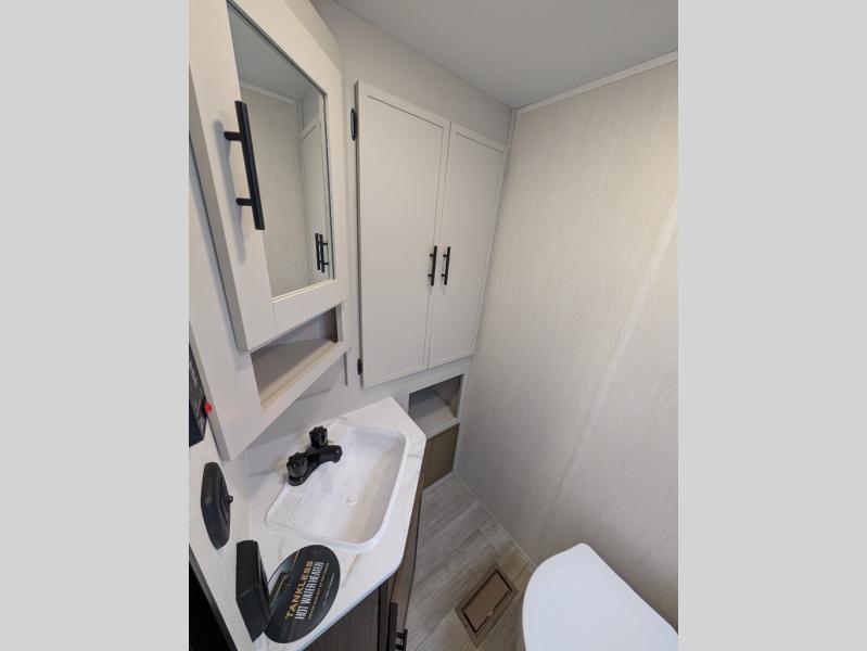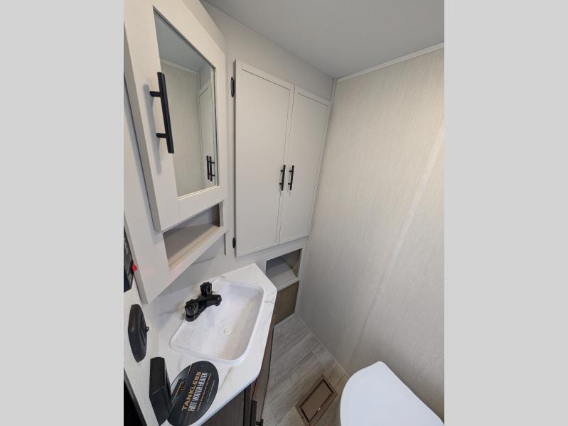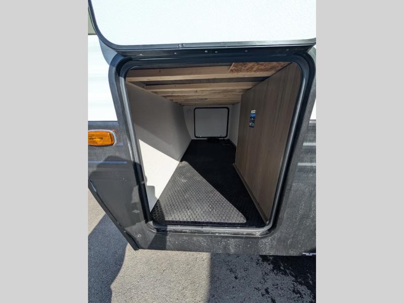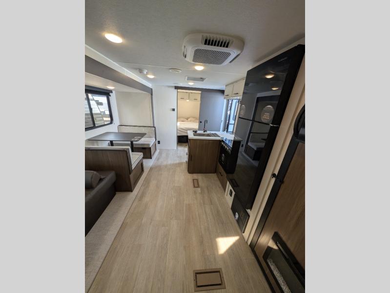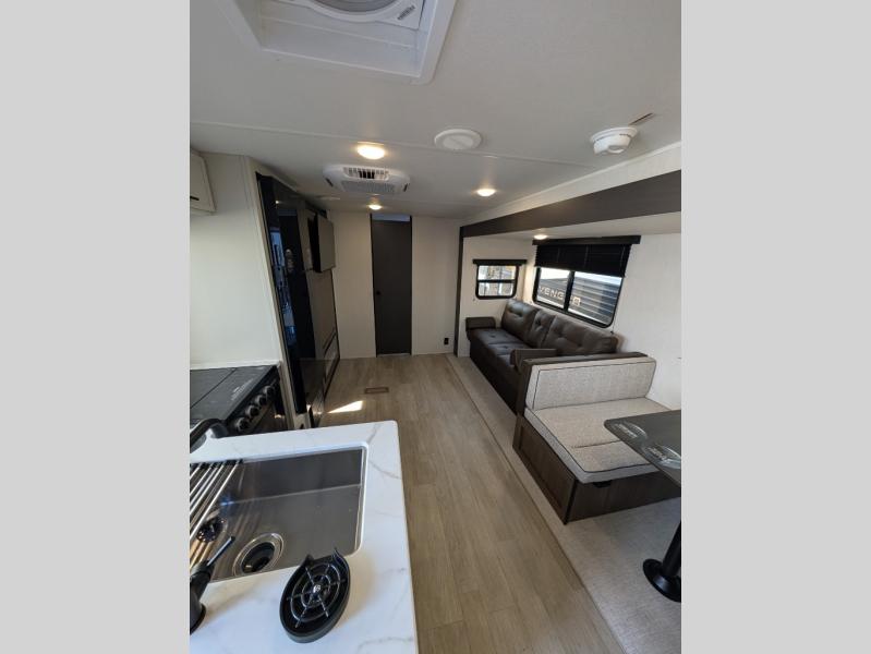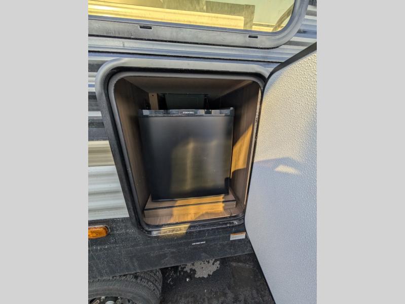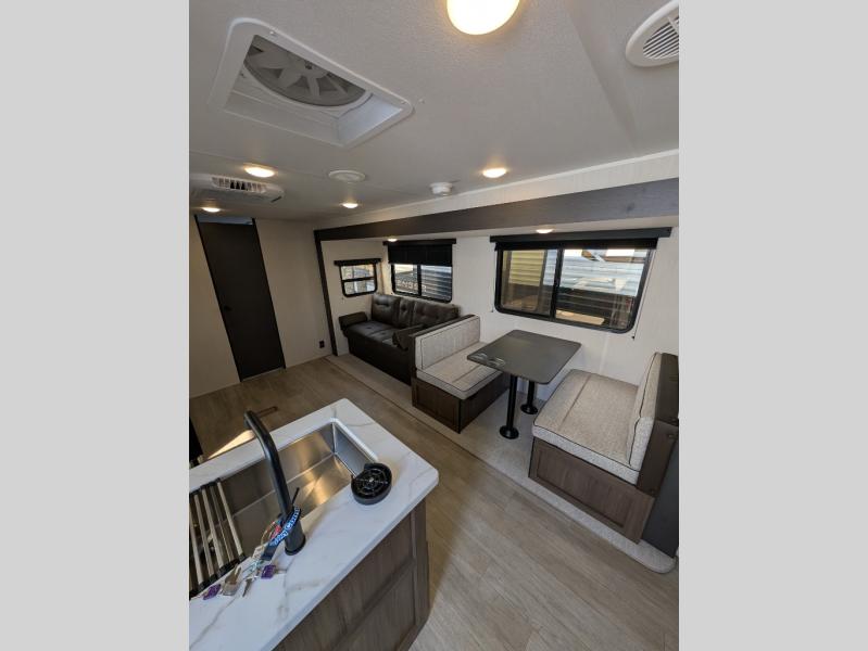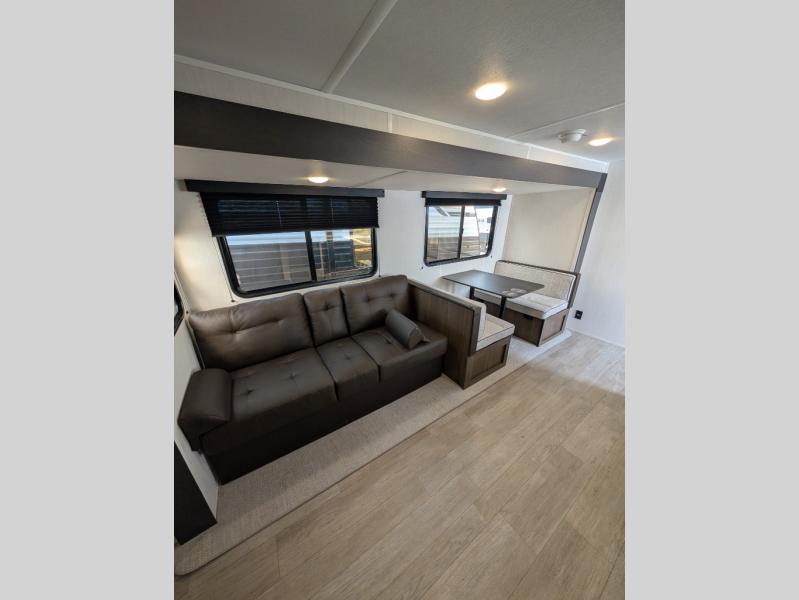 You'll appreciate the added space in this travel trailer thanks to the large slide out! The booth dinette and sofa are found here, and there is a moveable storage ottoman for extra blankets or board games. You'll have your own space up front in the private bedroom, complete with a camp king bed and storage for your things. The chef of your group will find a three burner cooktop and a built-in convection microwave with an air fryer to cook meals, plus there is a 12V refrigerator and hidden pantry for food storage. This unit also includes a power awning outdoors and an outside refrigerator to keep cold drinks close by.