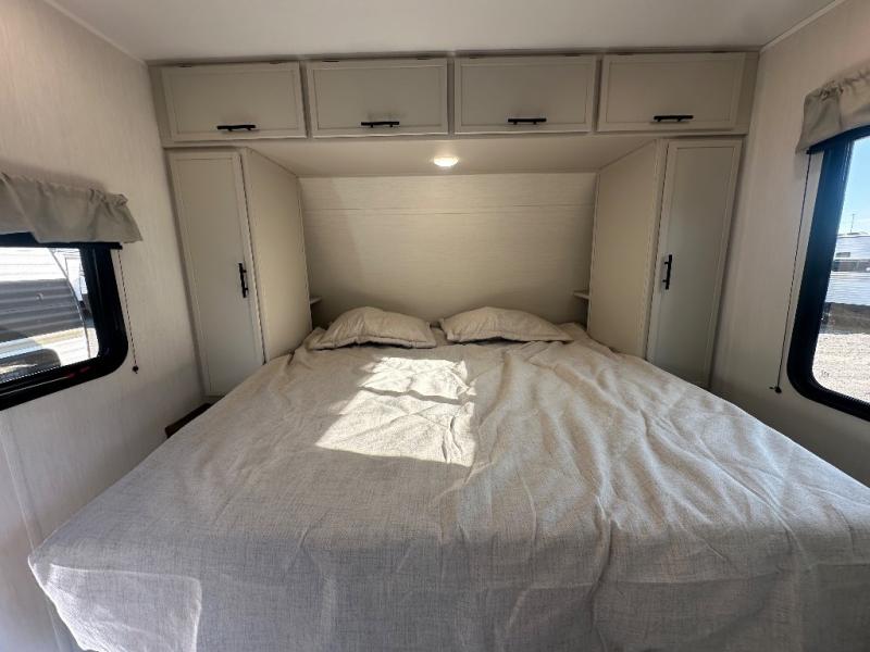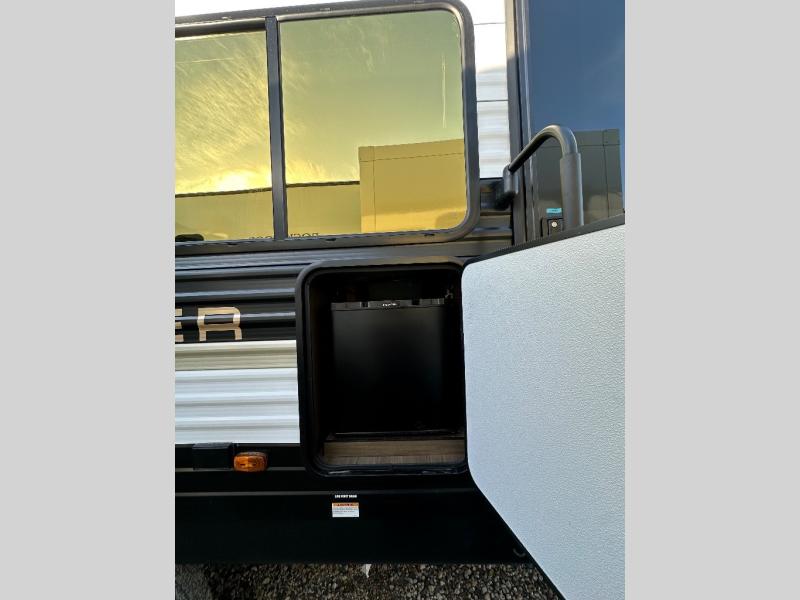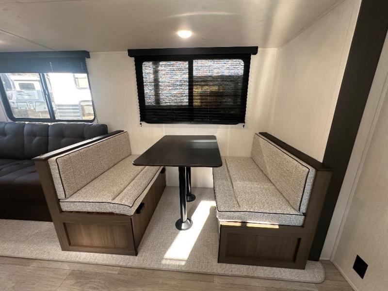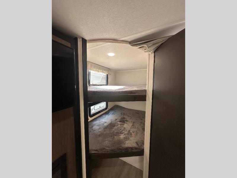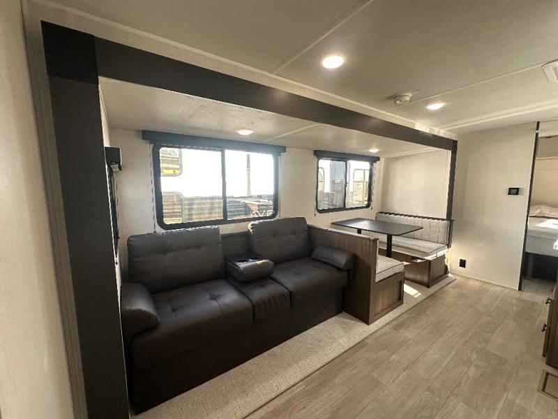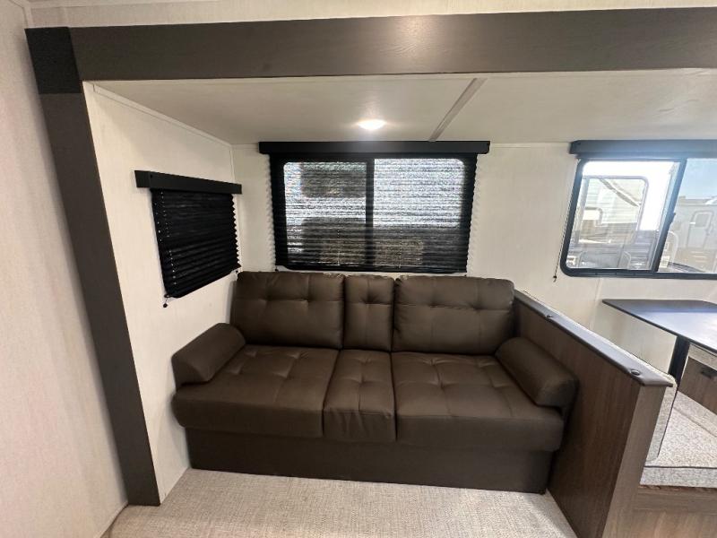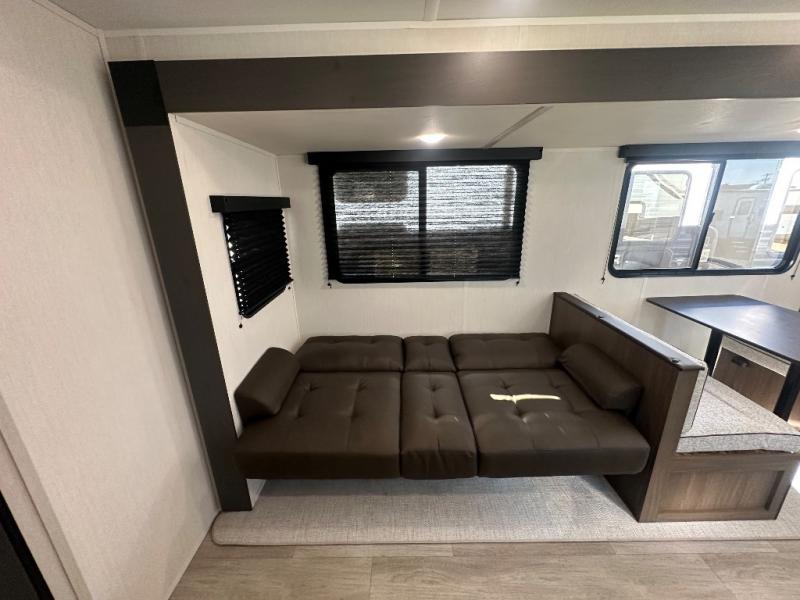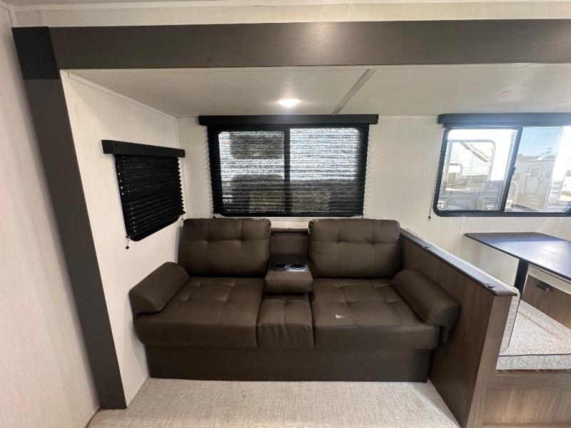 You'll appreciate the added space in this travel trailer thanks to the large slide out! The booth dinette and sofa are found here, and there is a moveable storage ottoman for extra blankets or board games. You'll have your own space up front in the private bedroom, complete with a camp king bed and storage for your things, while your guests take the double-size bunk beds towards the back. The chef of your group will find a three-burner cooktop and a built-in convection microwave with an air fryer to cook meals, plus there is a 12V refrigerator and large hidden pantry for food storage. This unit also includes a power awning outdoors and an outside refrigerator to keep cold drinks close by.