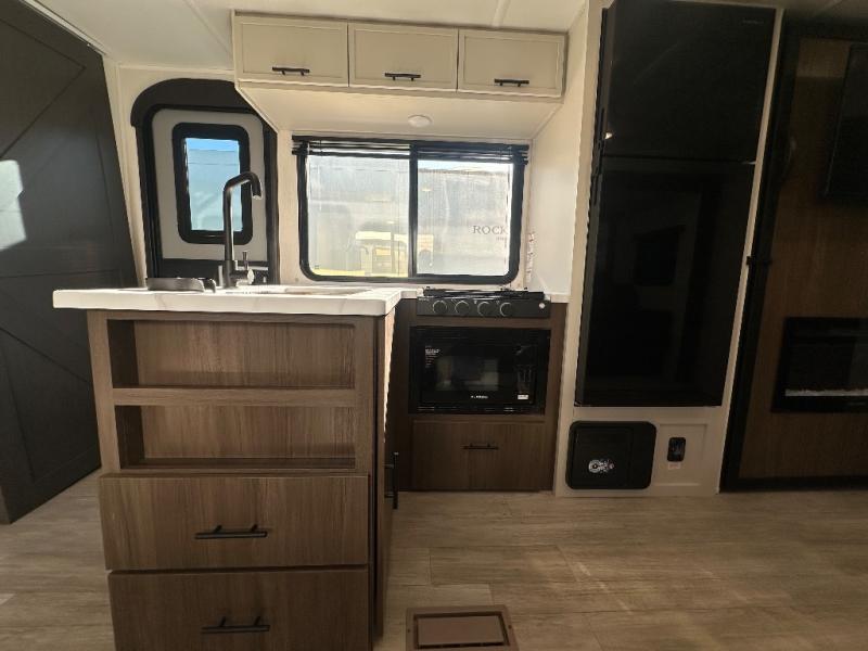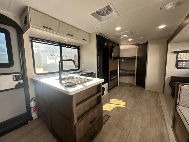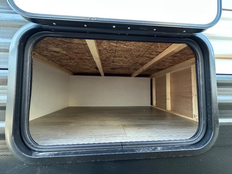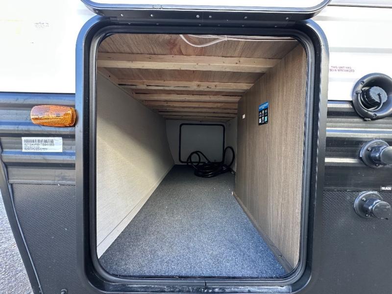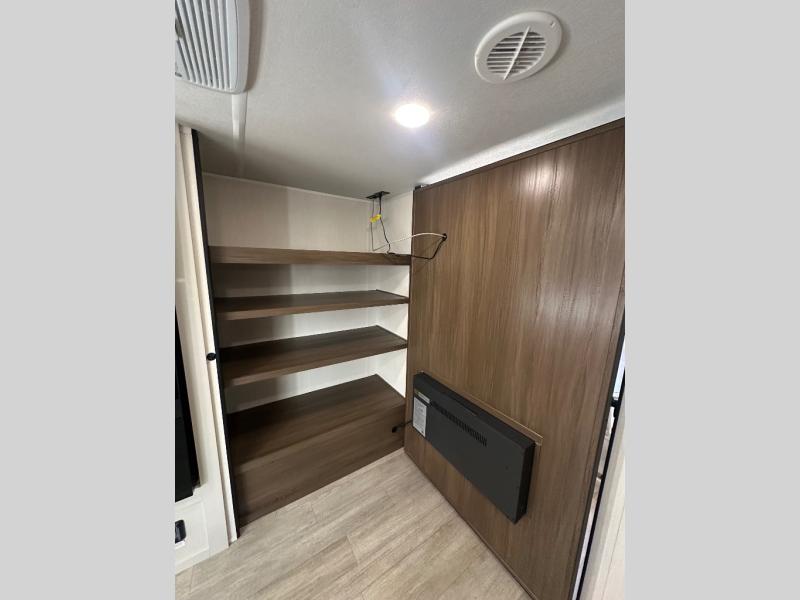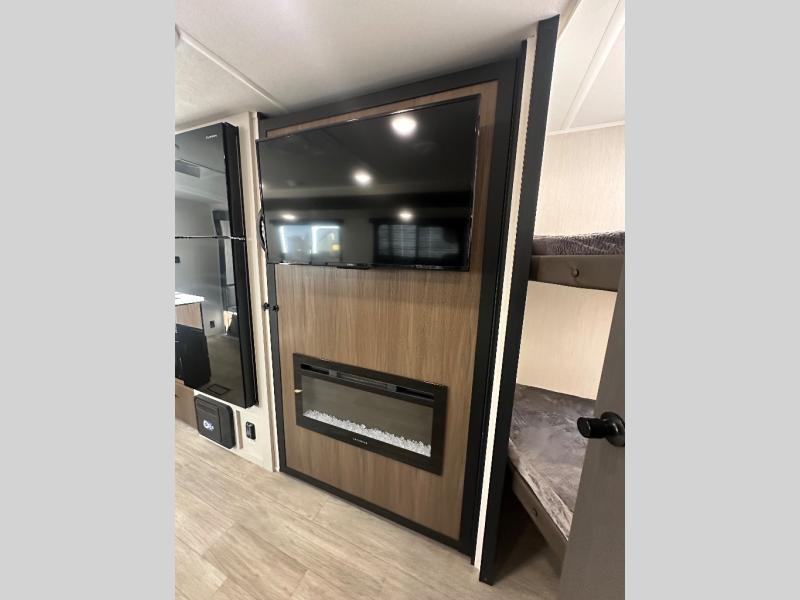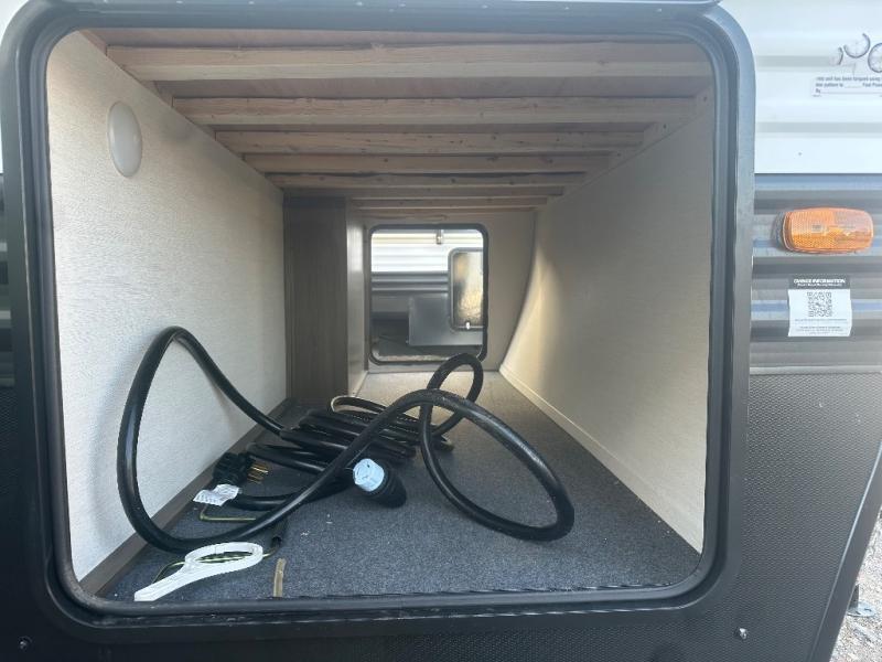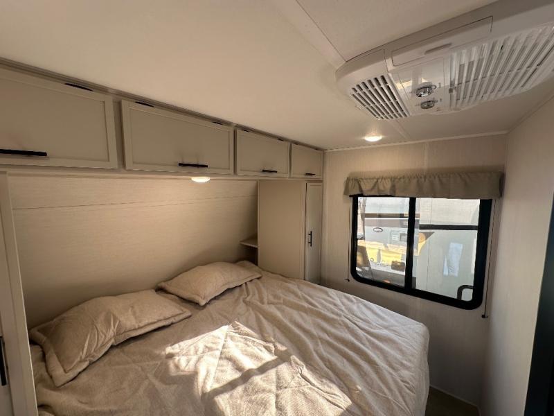 You'll appreciate the added space in this travel trailer thanks to the large slide out! The booth dinette and sofa are found here, and there is a moveable storage ottoman for extra blankets or board games. You'll have your own space up front in the private bedroom, complete with a camp king bed and storage for your things, while your guests take the double-size bunk beds towards the back. The chef of your group will find a three-burner cooktop and a built-in convection microwave with an air fryer to cook meals, plus there is a 12V refrigerator and large hidden pantry for food storage. This unit also includes a power awning outdoors and an outside refrigerator to keep cold drinks close by.