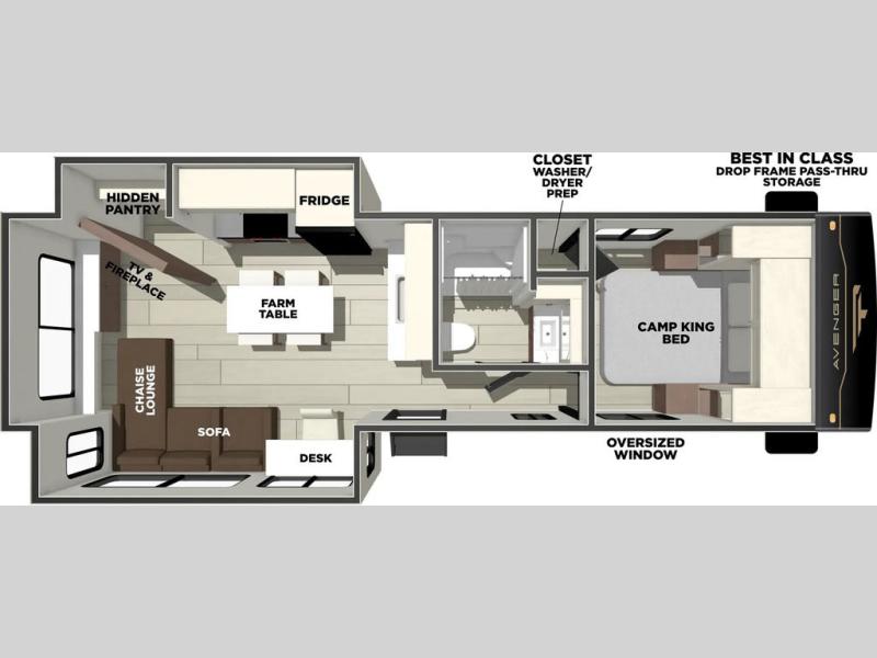 With any Avenger travel trailer by Prime Time RV, you will find innovation, a solid build, and comfort at every turn. Each model is built with Tuff Coat on the exterior metal, a fully enclosed underbelly, and a PVC roof membrane to help extend the life of your trailer. You will also find automotive name badging on the exterior, along with an exterior shower, front rail LED light strips, plus an XL padded entry grab handle to name a few conveniences. There are plenty of storage spaces inside, as well as Congoleum flooring and woven PVC marine grade slide out flooring, a designer shower surround, and seamless pressed countertops. You are sure to appreciate the onboard water filtration system, tankless water heater, plus 30K BTU furnace and 15K ducted A/C to help keep you comfortable.