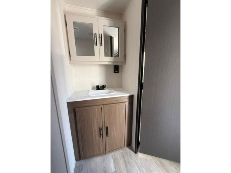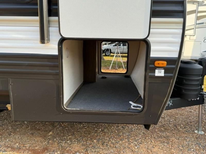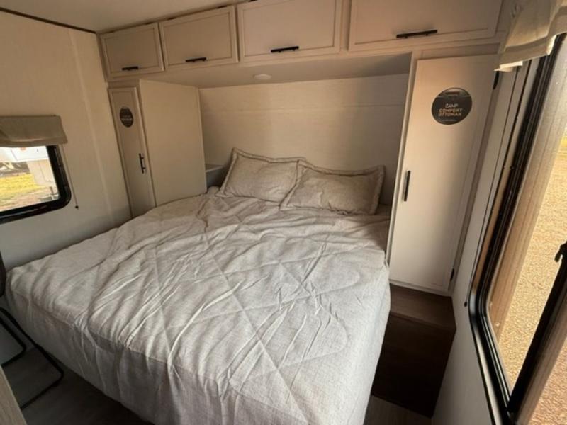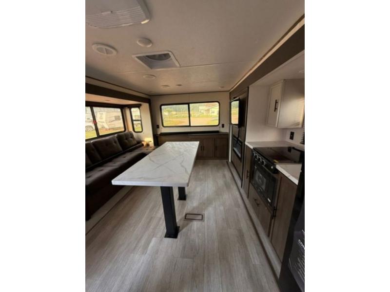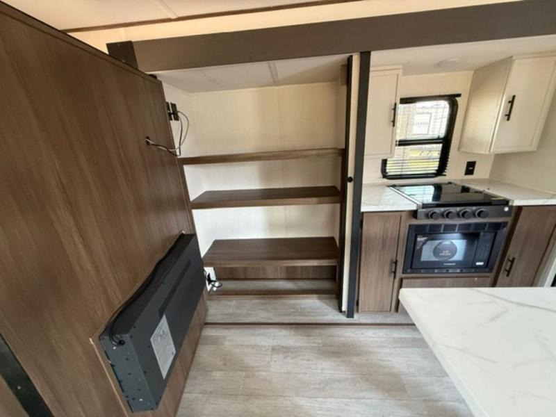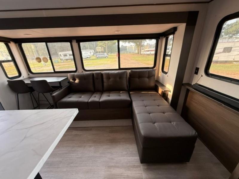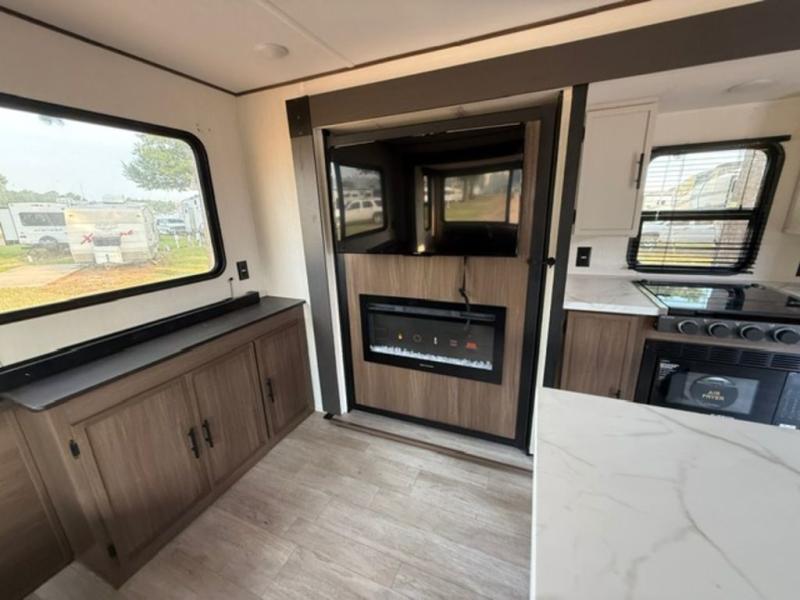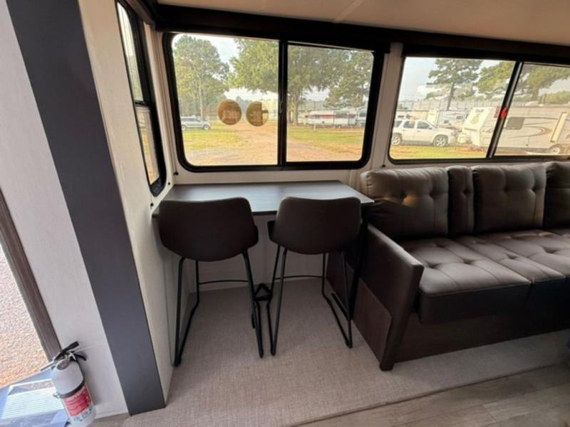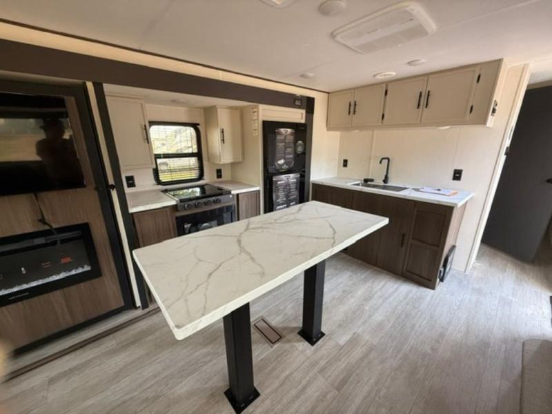 There is ample space to move about in this travel trailer thanks to the dual opposing slides! Here, you'll find an L-shaped sofa with a chaise lounge in direct view of TV and fireplace. There is also a hidden pantry behind the TV for snacks and movies! The center farm table includes four stools so you can gather around for meal times, and the desk with a chair will provide a place for you to get some work done if needed. This unit features a full bath towards the front private bedroom for easy access at night, and you're sure to get a great night's rest on the camp king bed!