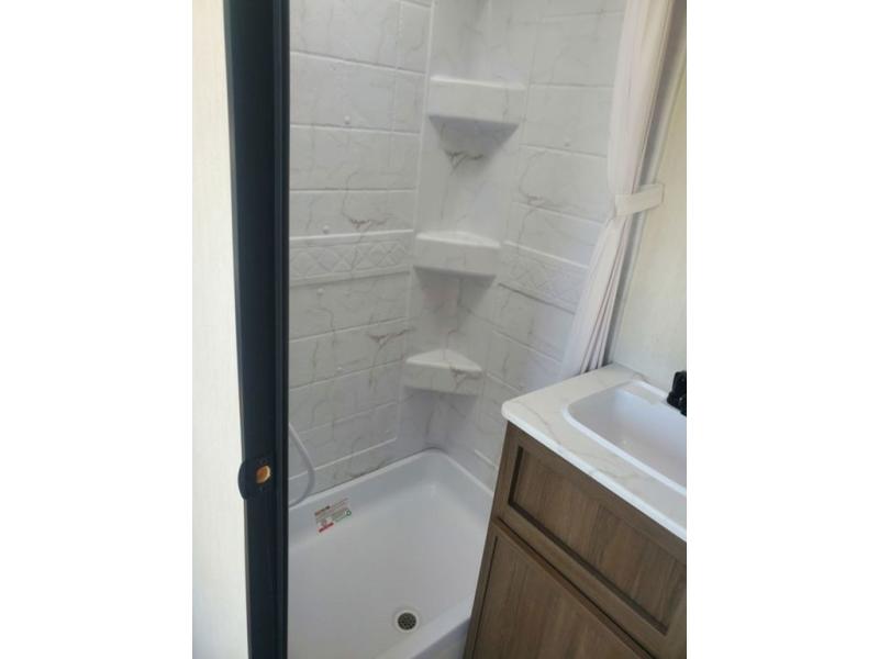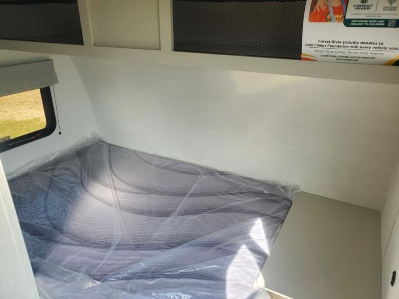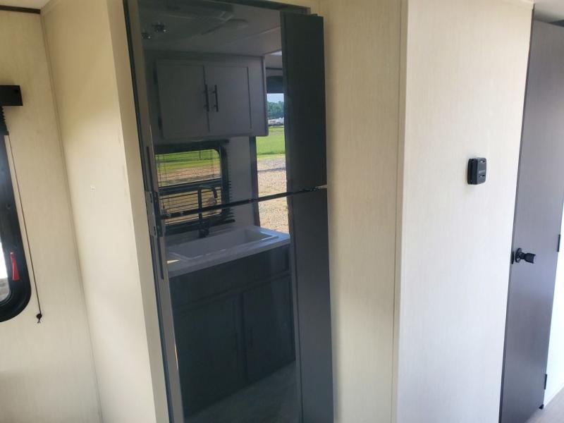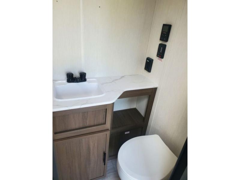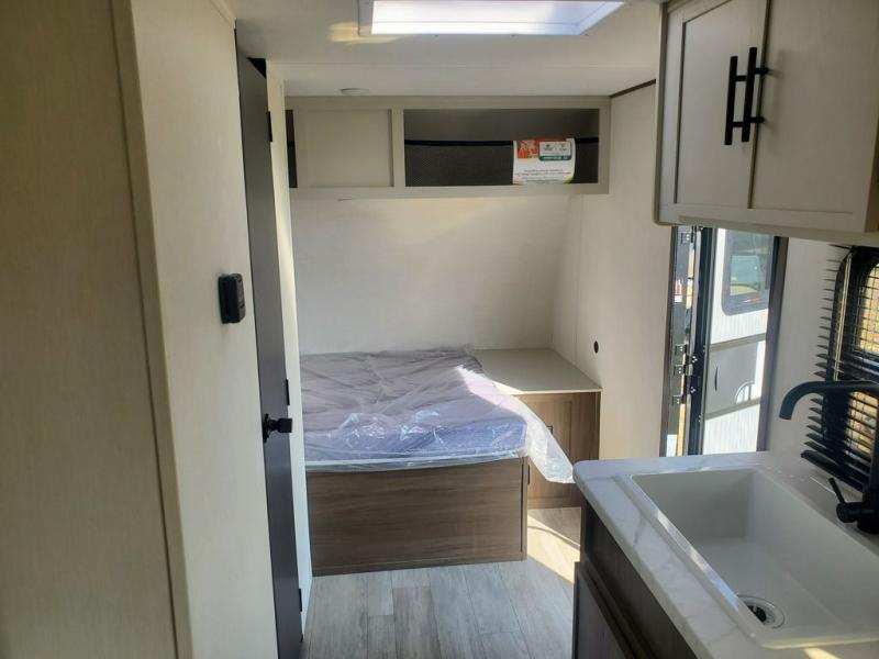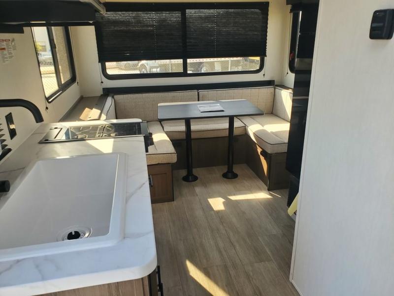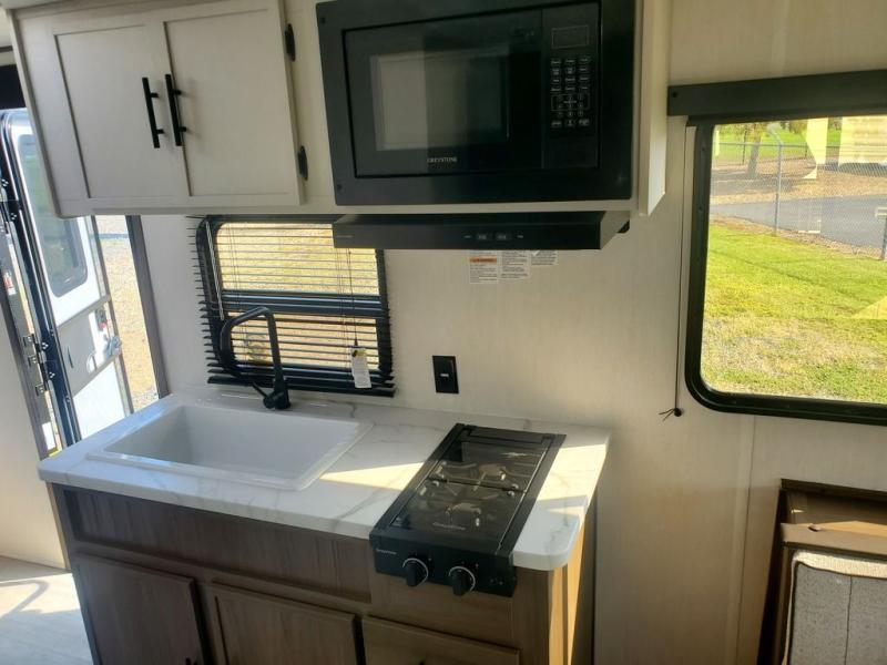 Camping with your friends or family doesn't have to be hard! This easy-to-tow, store and clean up RV allows two to four people to sleep comfortably on the U-shaped dinette along the rear wall with a large window and the front bed with a nightstand. The kitchen includes a 10.6 cu. ft. 12V refrigerator, a farmhouse sink, plus a two-burner cooktop for preparing meals just like you do at home.