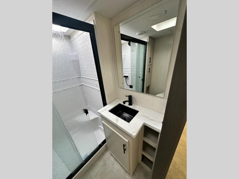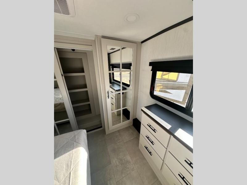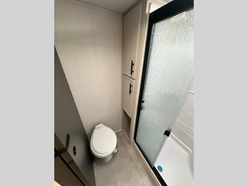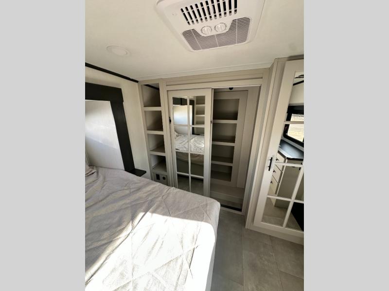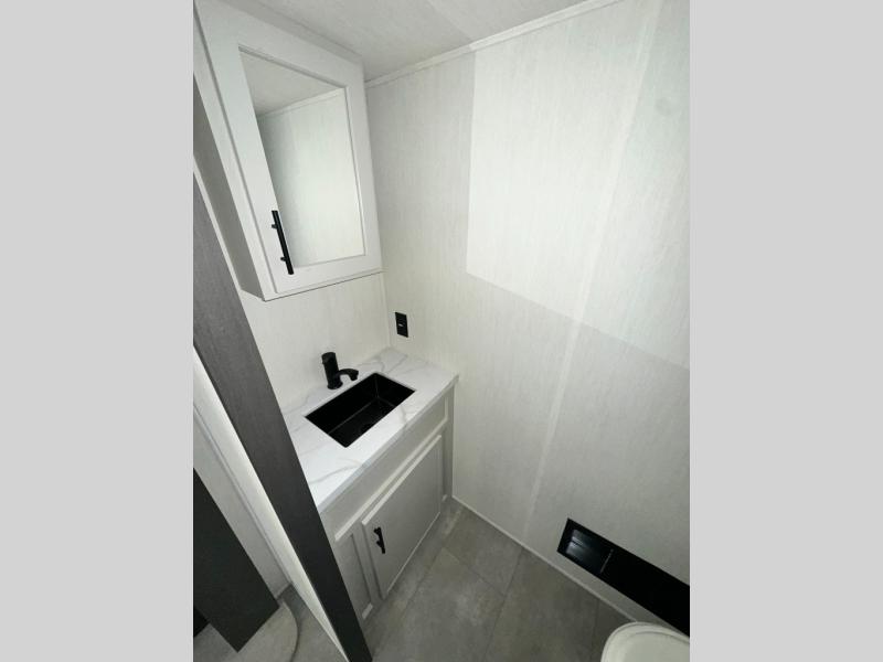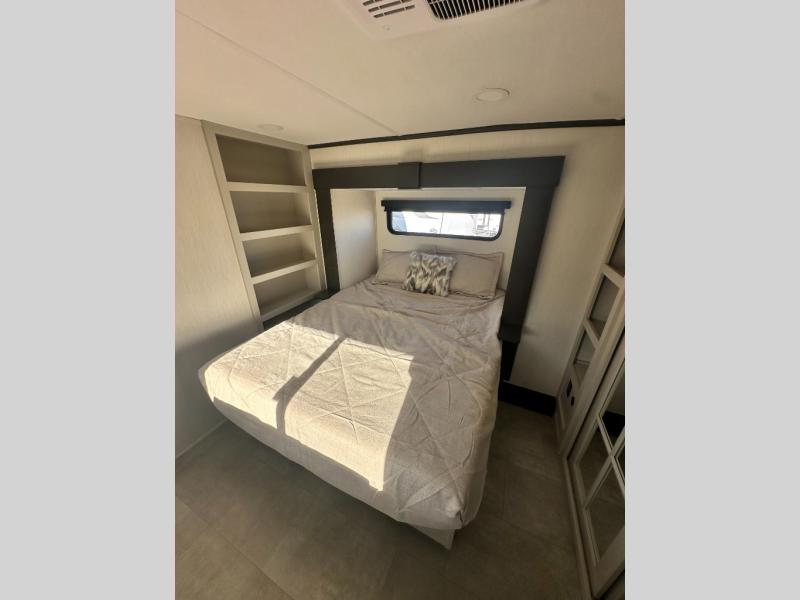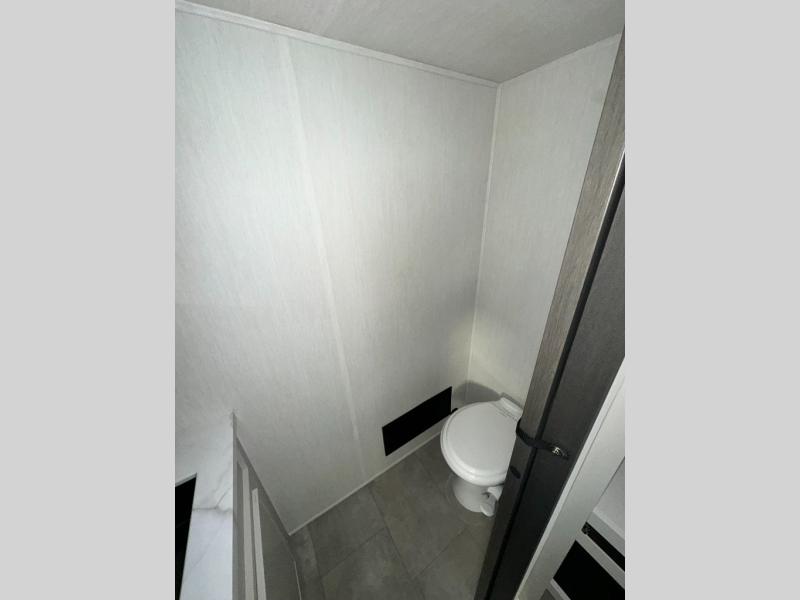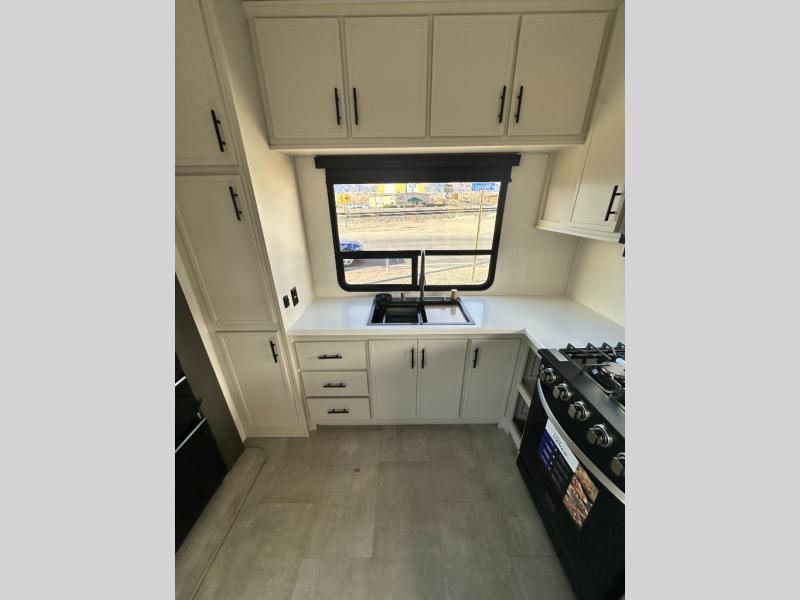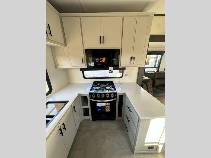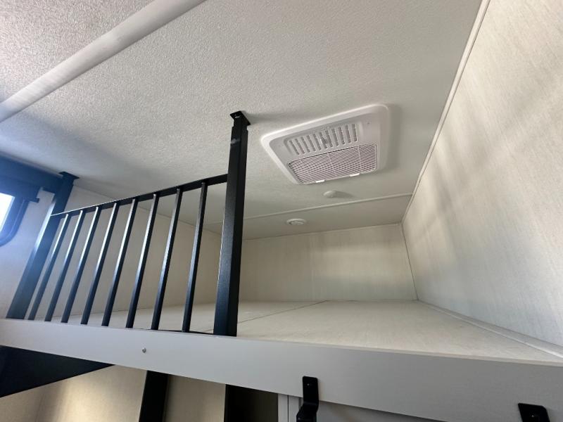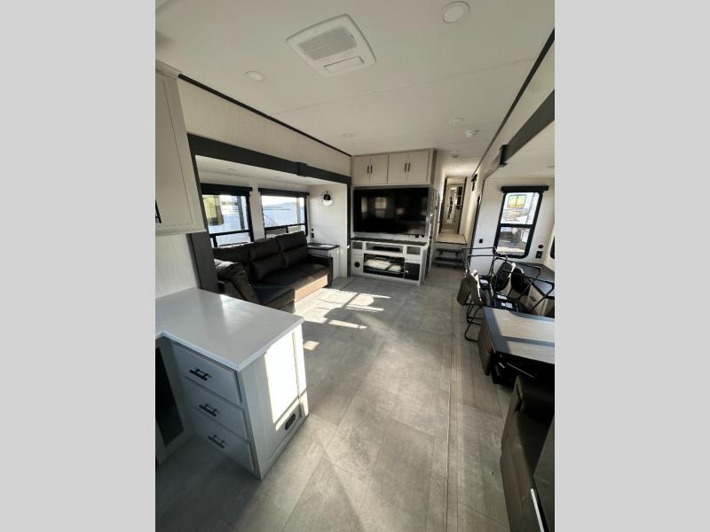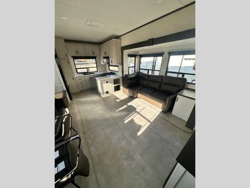 If you enjoy camping with family or friends, this fifth wheel is sure to meet all of your needs! The front bedroom includes a queen bed slide out for more space and comfort, plus a front wardrobe with washer and dryer prep. And the full bath is right next door for easy nighttime use. Your guests can utilize the middle bonus room that includes an E-Z glide sofa slide out, a private loft, and a half bath! The living room is made spacious thanks to the dual opposing slides, and you'll find a sectional sleeper sofa here, as well as desk with a chair and a free-standing table with chairs. And don't overlook the rear kitchen with ample counter space, a four burner range, an accessory sink and a French door 12V refrigerator!